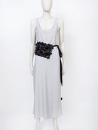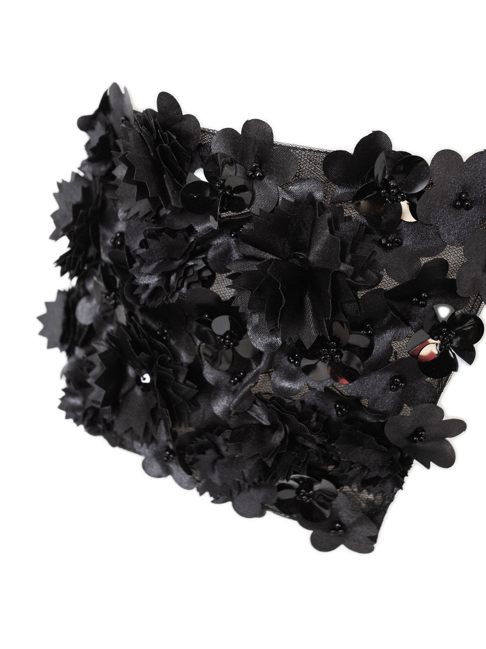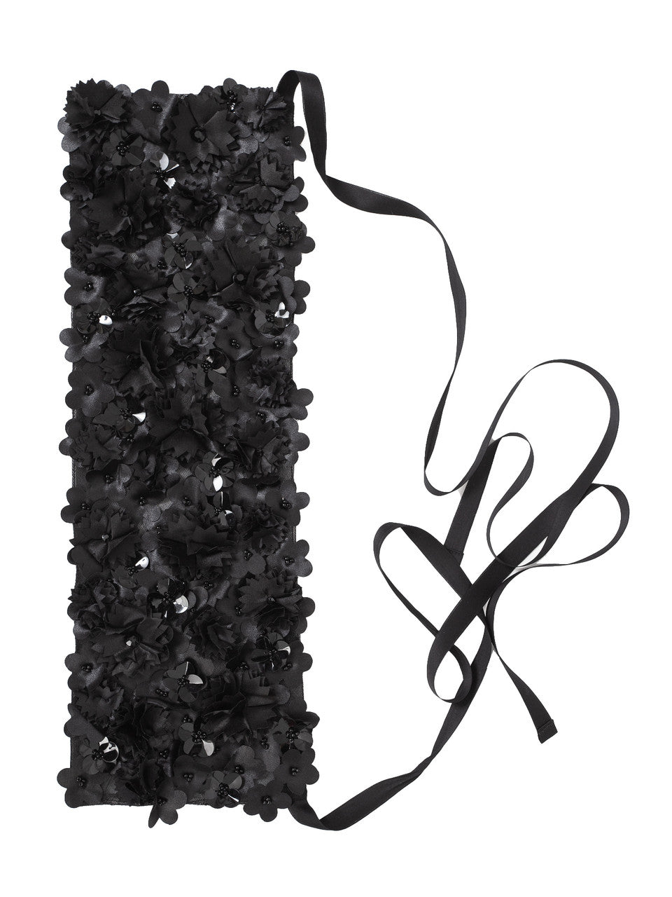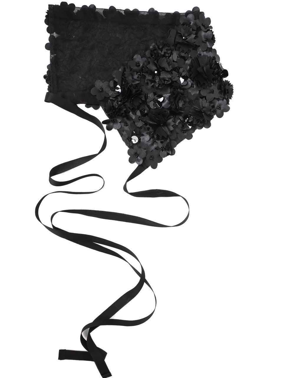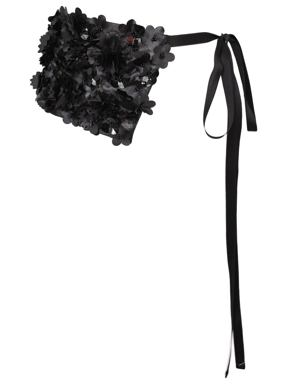 The black embroidered floral applique tie-fastening corset belt features versatile use to wear asymmetrical on the side, symmetrical as a corset or use your imagination to style the look.