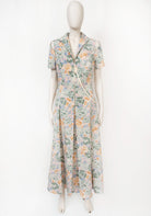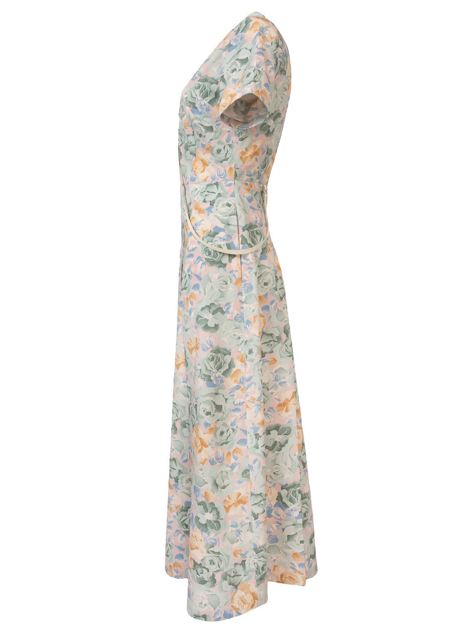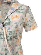 This stunning dress is made from viscose in fun floral print. It's fitted through the waist before falling to a folded skirt and has short sleeves with complimentary cut-outs, deep V-neck with zipper and decorative ribbon, classic collar and side seam pockets. European sizes. True to size. 93% VISCOSE 7% ELASTANE.