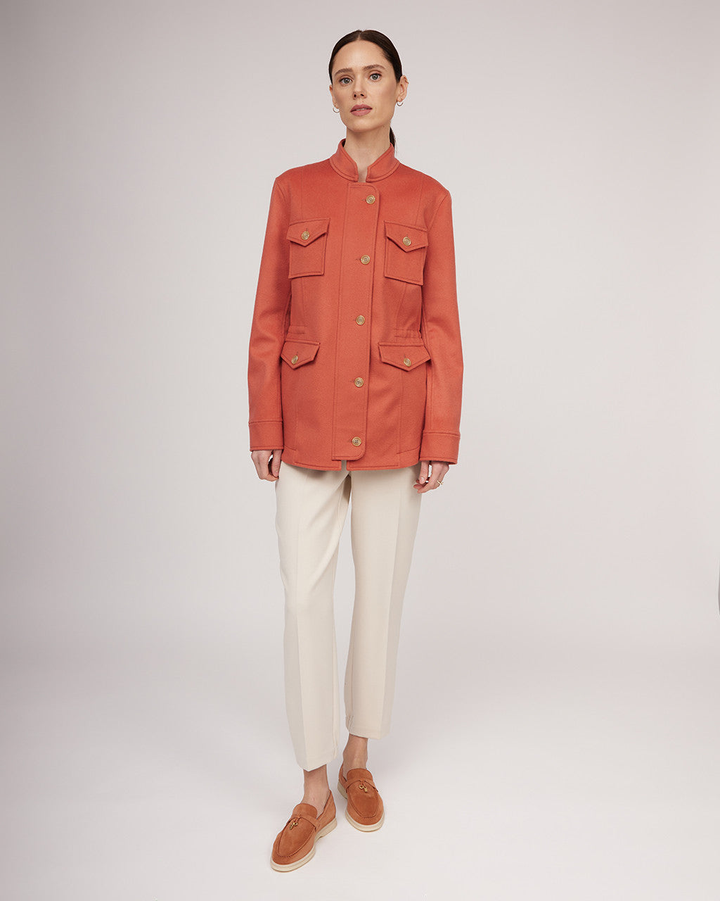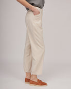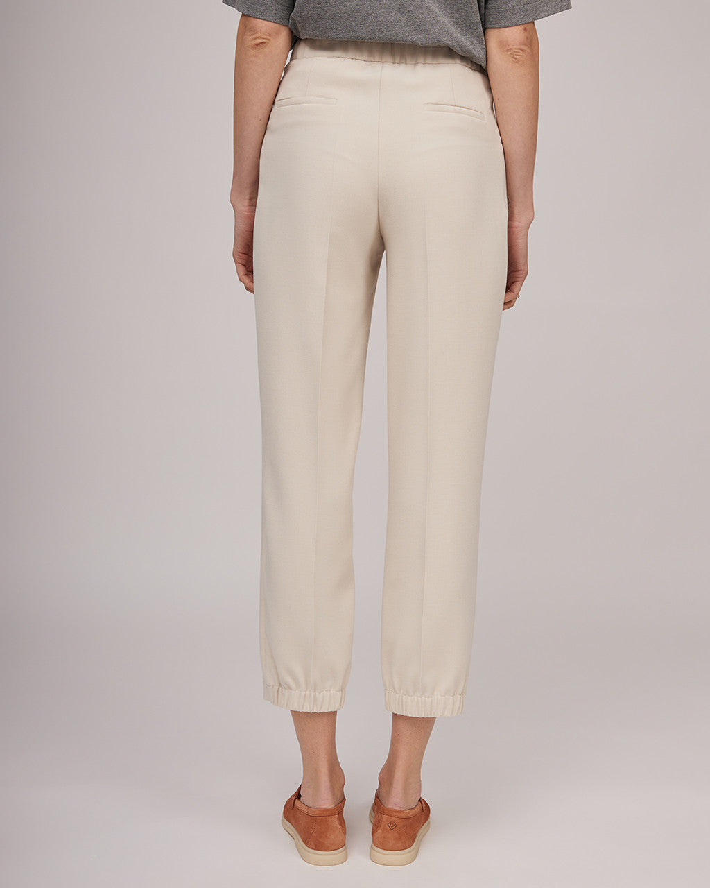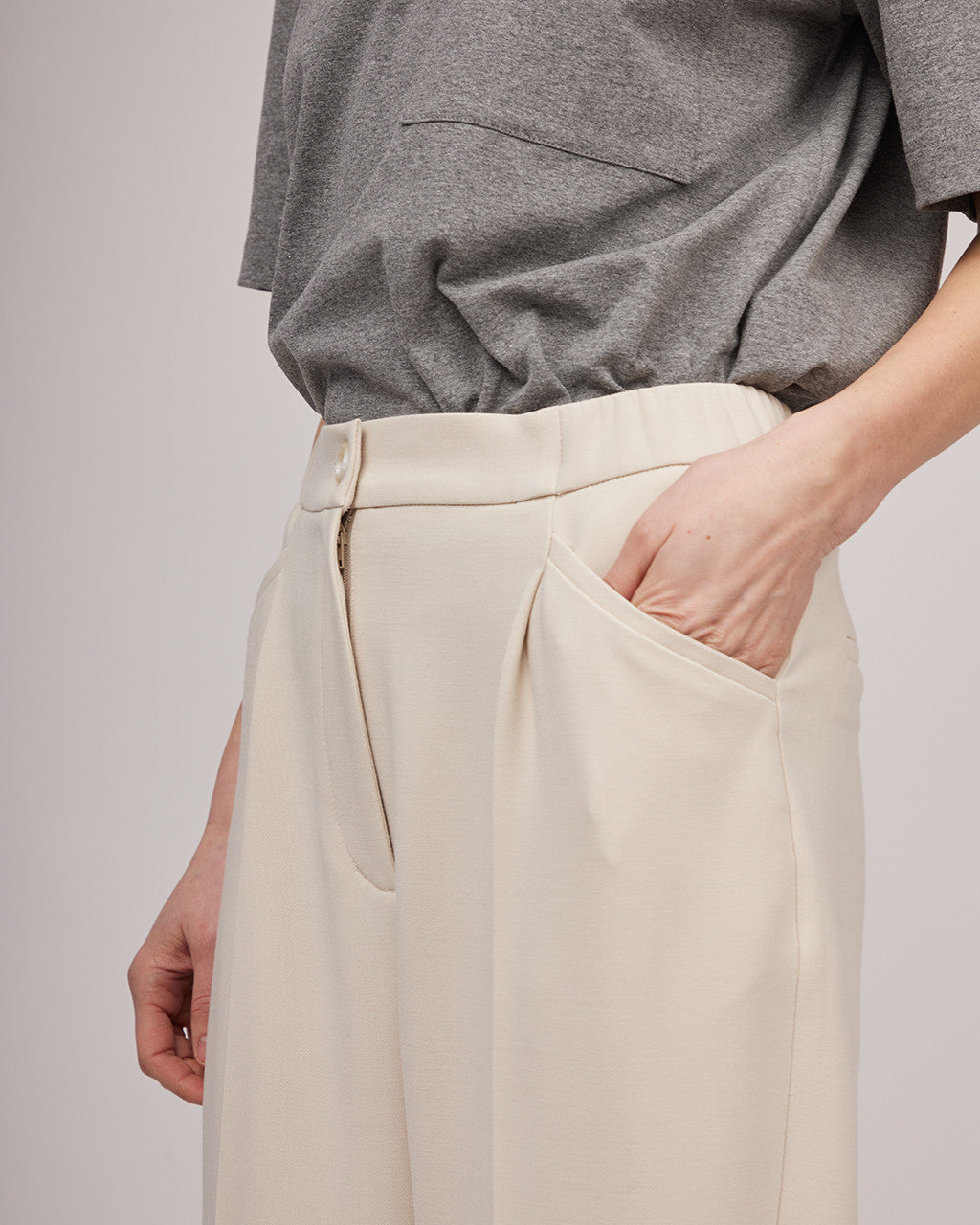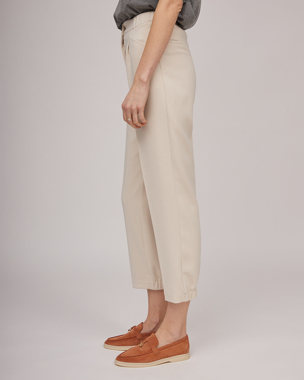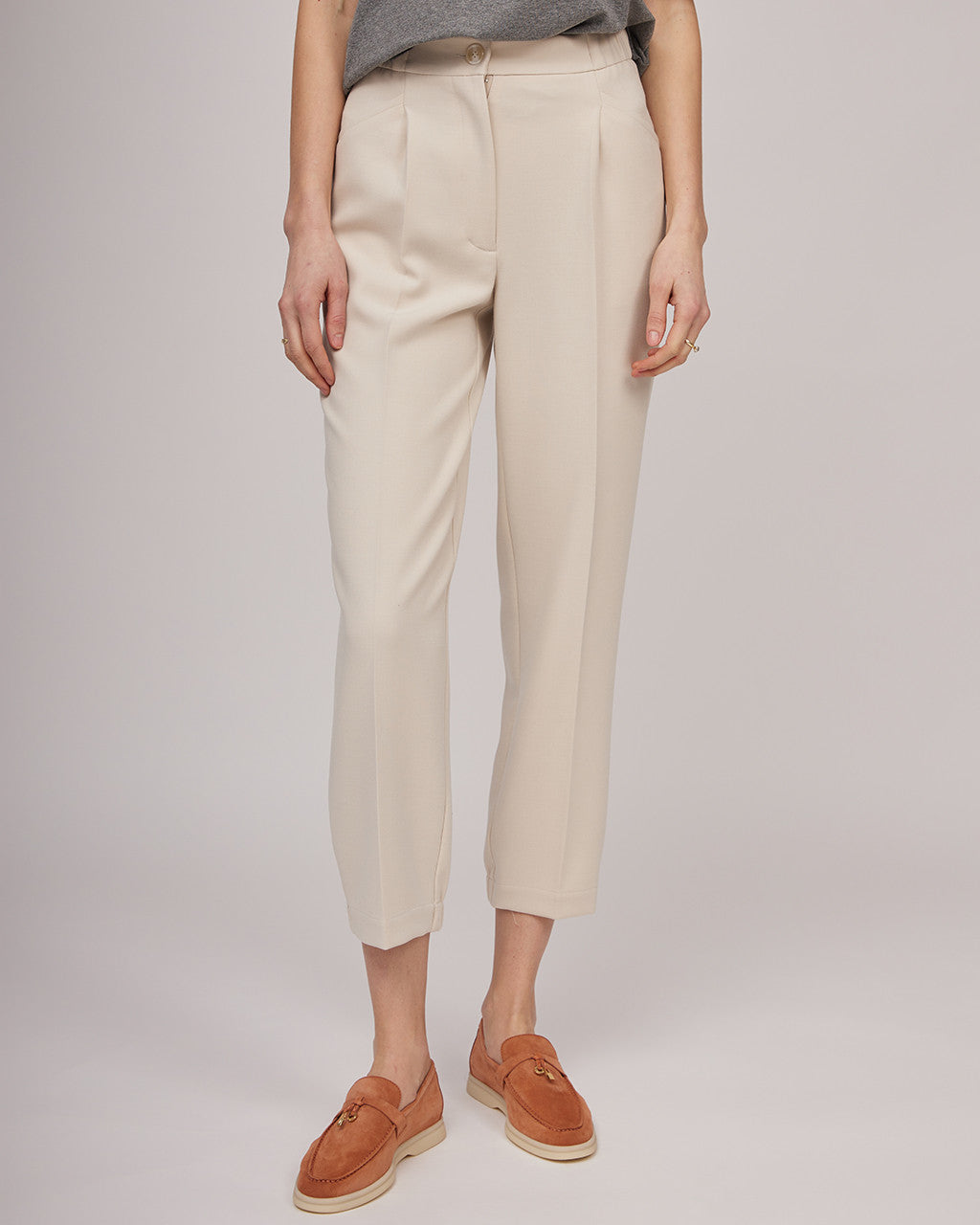 Beige, slightly shortened trousers with narrowed hems, made of fabric that retains its shape well and fits the figure snugly. Perfectly matched with a sweater from our collection, creating an elegant and versatile look.