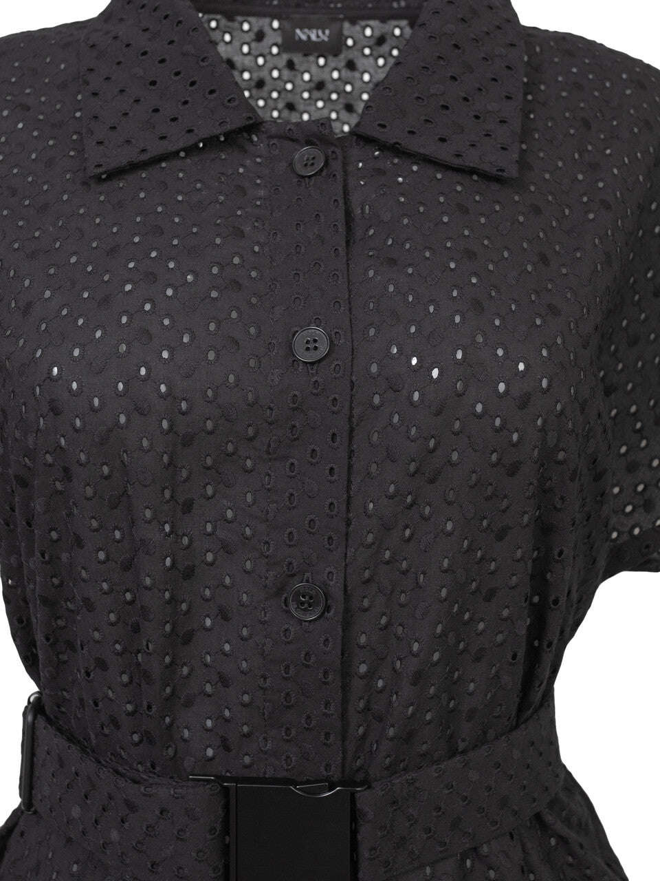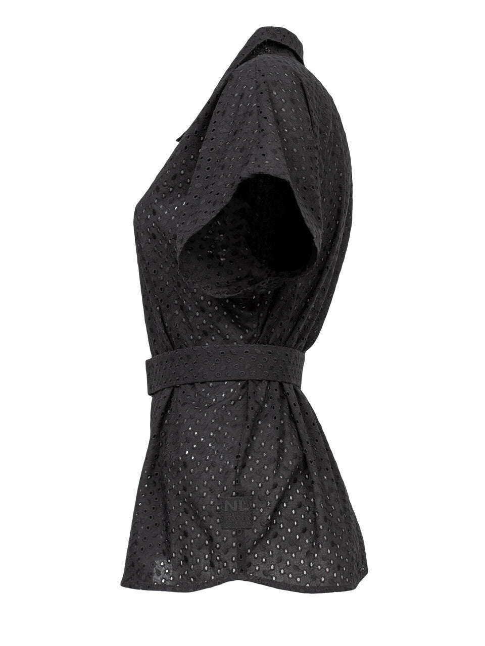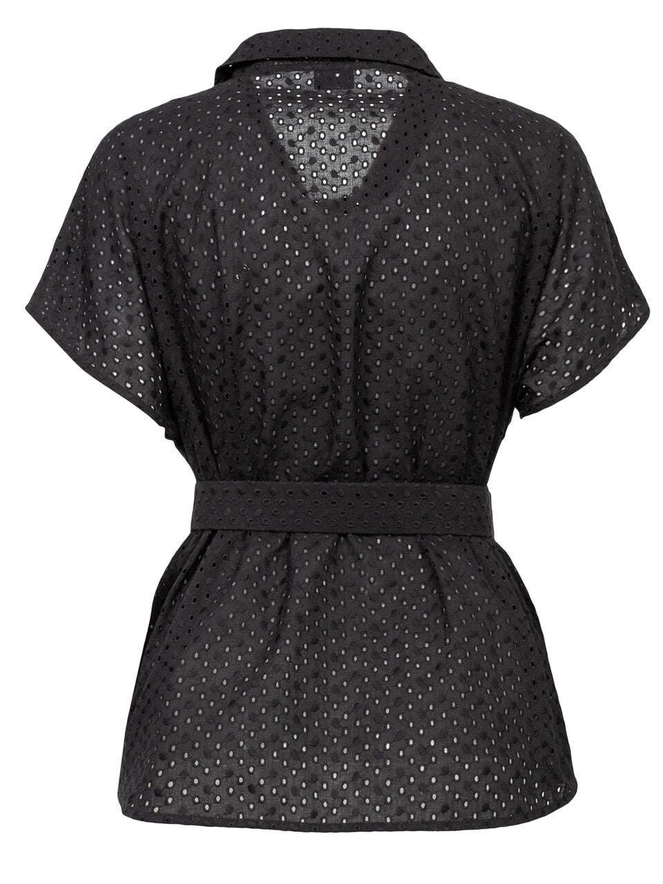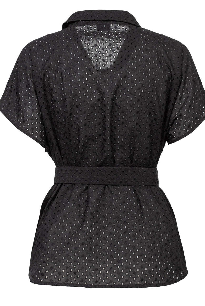 Black embroidery cotton buttom up shirt without lining has short sleeves, classic collar, straight cut design with belt in set. Wear together with skirt MICHELLE for summer look.