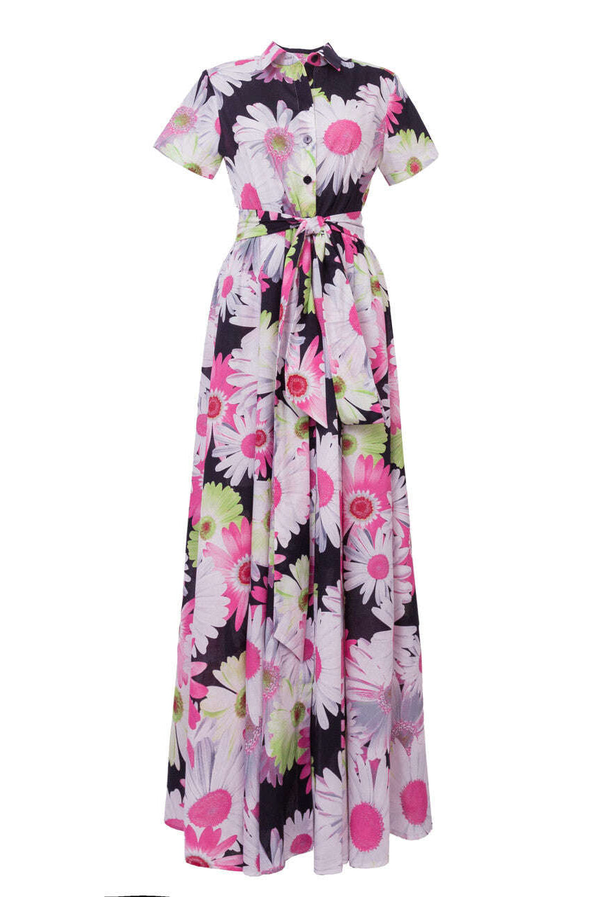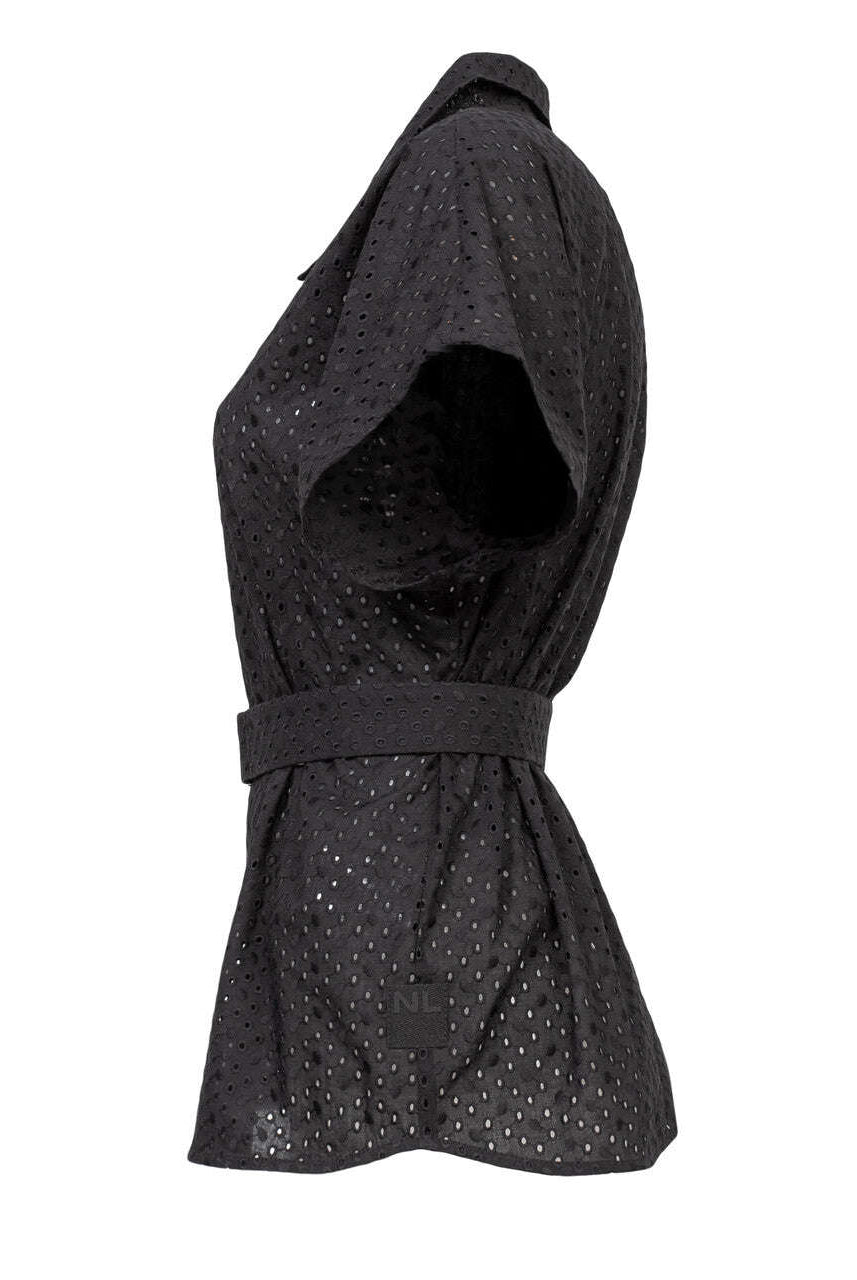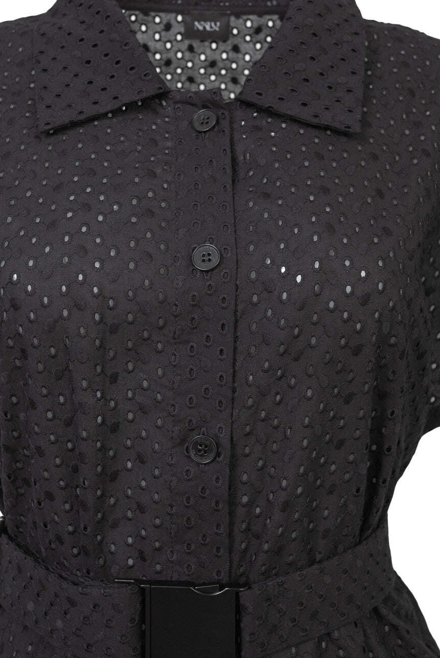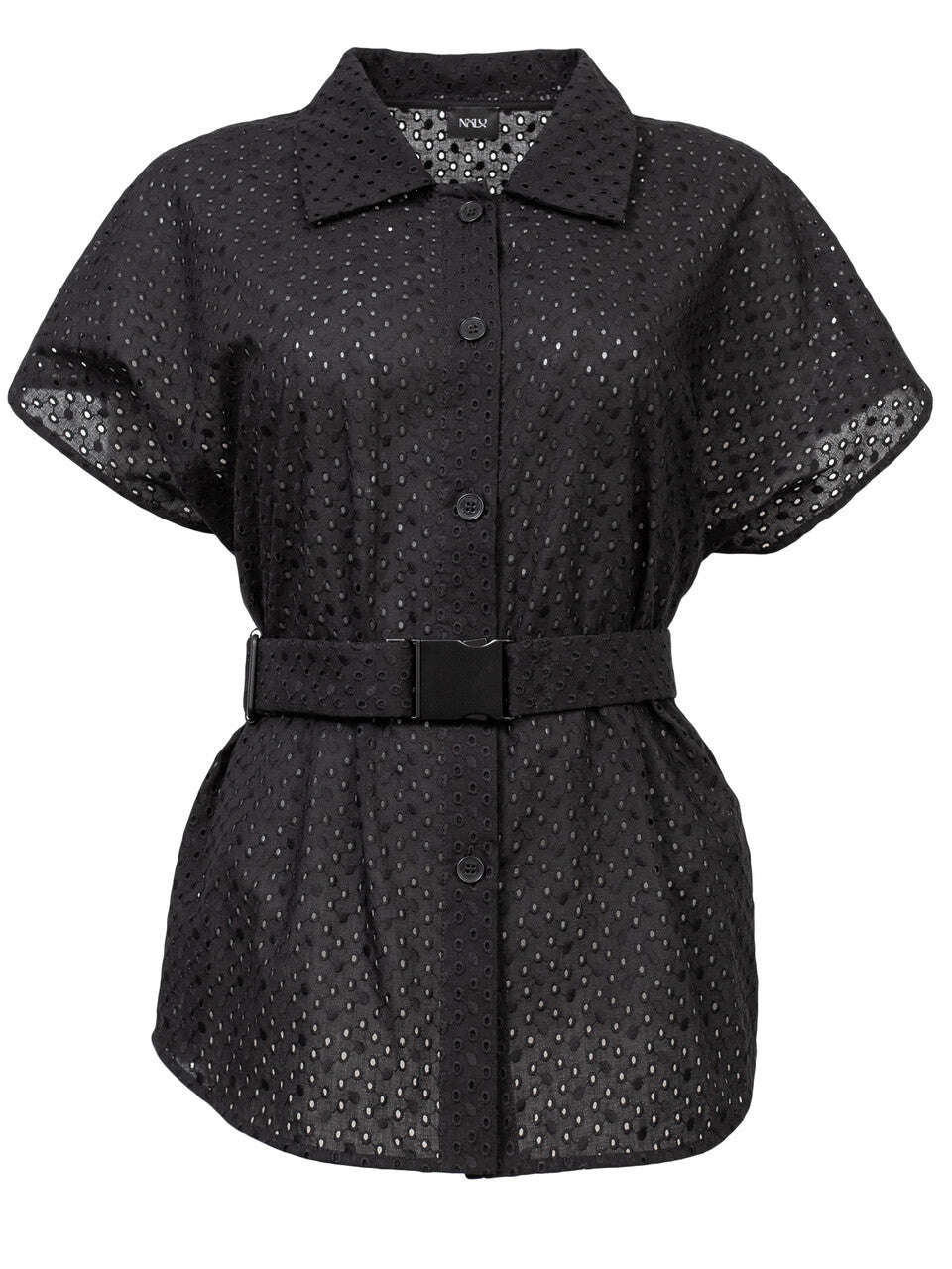 Black embroidery cotton buttom up shirt without lining has short sleeves, classic collar, straight cut design with belt in set. Wear together with skirt MICHELLE for summer look.