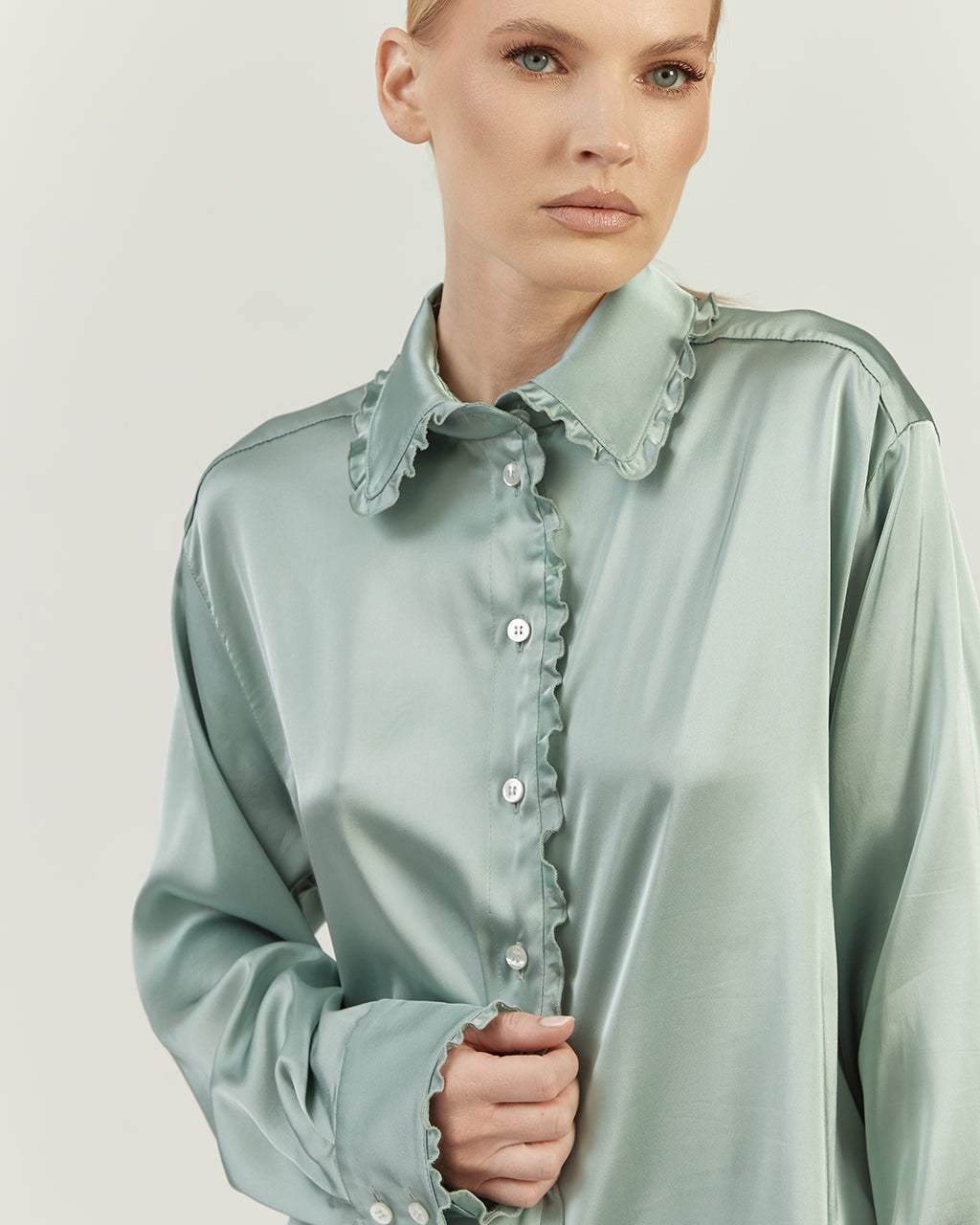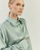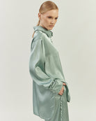 Gara brīva piegriezuma blūze ar platām aprocēm un šķēlumiem sānos ir lakoniska un gaisīga. Universāls apģērba gabals, ko viegli kombinēt ar īsu topu un biksēm vai kā virskārtu virs kleitām. Zīdains audums ar vieglu mirdzumu, elpojošs un delikāts, kam nepieciešama maiga kopšana. Pārliecinieties, ka blūze pieguļ brīvi un vīles nav ciešas. Aizdare ar pogām, kas pieskaņotas auduma tonim.