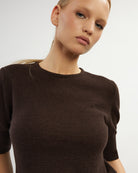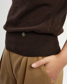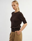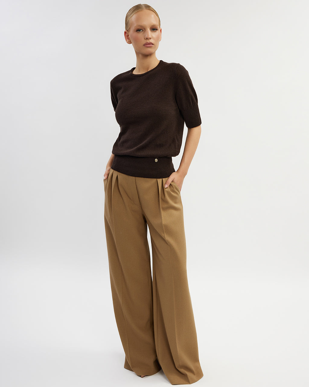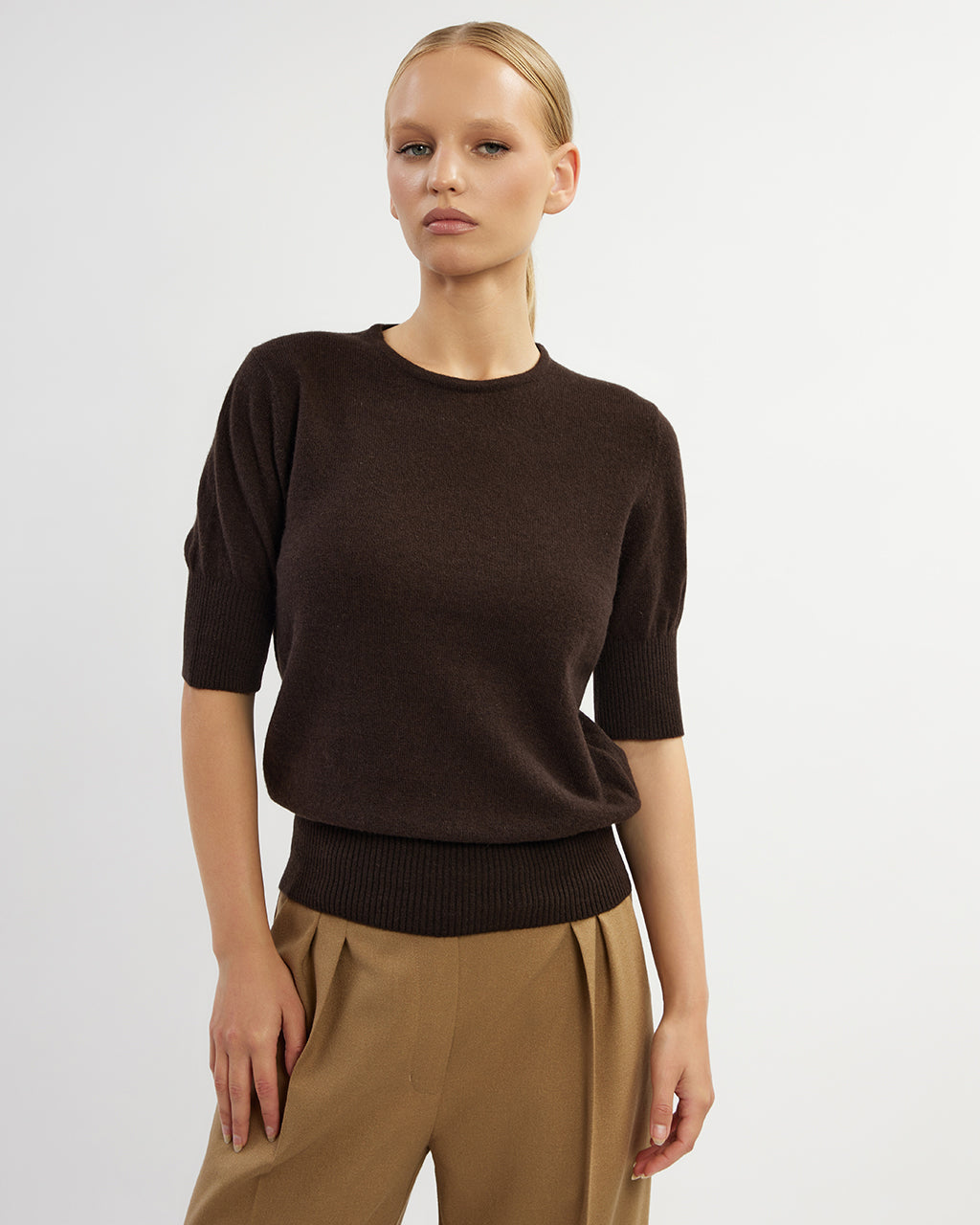 Brūns kašmira džemperis. Viegls, klasiska piegriezuma džemperis ar brīvu siluetu, akurāti apstrādātu kakla izgriezumu, īsām piedurknēm un delikātu apdari. Adīts vienā pavedienā no mīkstas merino vilnas, kas labi uzsūc mitrumu un nekairina ādu. Adījums ir elastīgs, mīksts un patīkams pieskārienam. Garderobes bāzes elements modernā tonī, kas viegli kombinējams ar citiem apģērbiem.