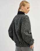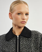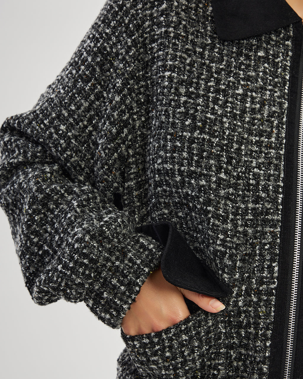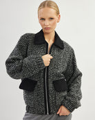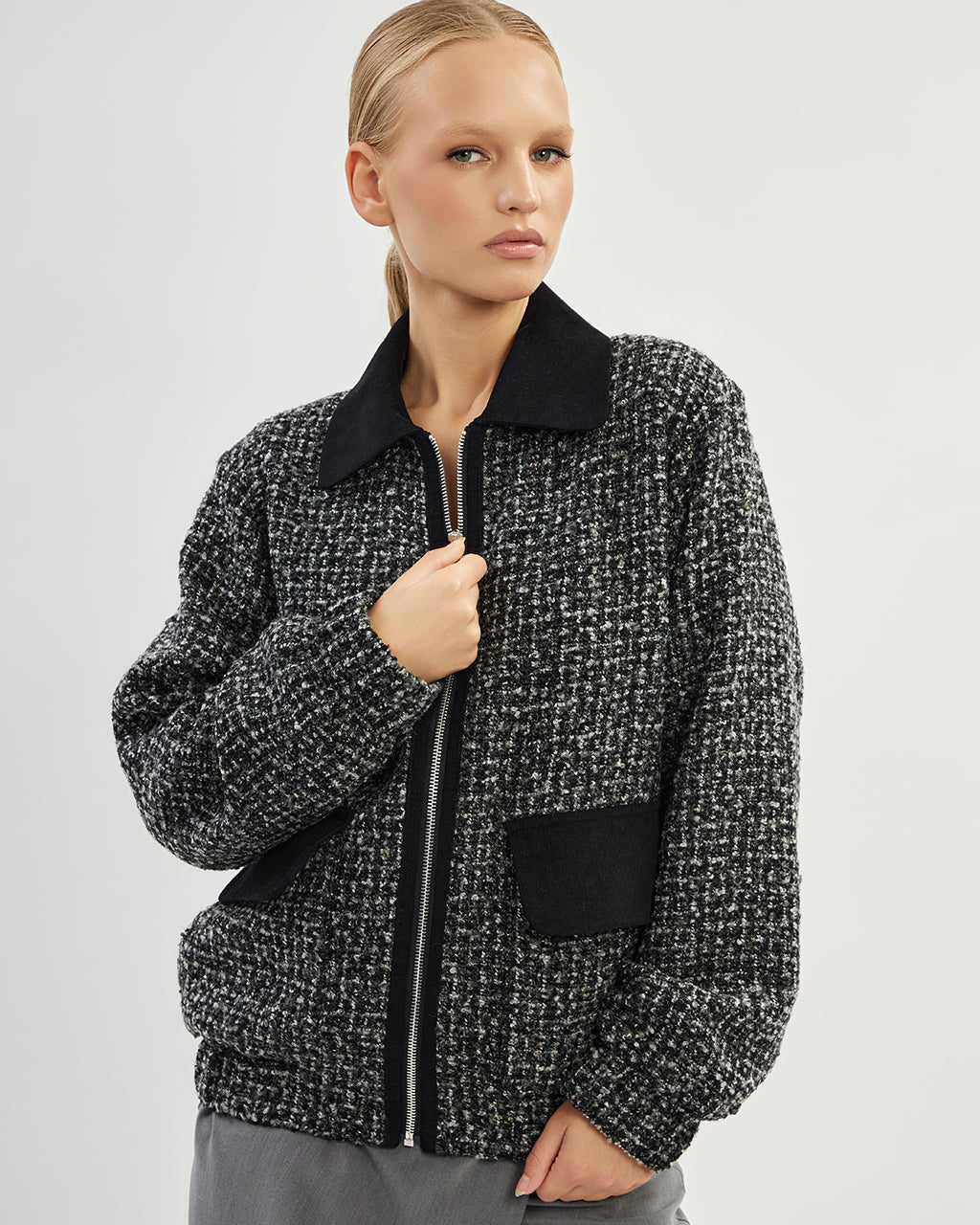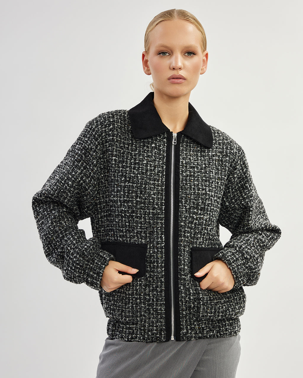 BUKLĒ JAKA AR KONTRASTAINU APDARI. Šī bomber jaka ir izgatavota no tvīda auduma ar vilnas piejaukumu, kas apvienojumā ar oderi lieliski sildīs rudens dienās. Pateicoties stingrajai struktūrai, tā lieliski tur formu. Jaka ir aizdarāma ar rāvējslēdzēju, un tās apakšdaļā kā arī piedurkņu galos ir iestrādāta elastīga gumija. Kabatas un apkakle ir ar kontrastējošām samta auduma apmalēm. Lieliski sader ar mūsu kolekcijas biksēm.