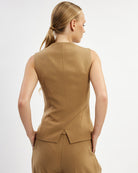 Klasiska, puspieguļoša veste no kostīmu auduma. Priekšpusē un aizmugurē ir iestrādātas iešuves, lai veste nevainojami piegultu figūrai. Pateicoties pārdomātajam siluetam un maigajam piegulumam plecu un vidukļa daļā, veste lieliski piestāv dažādiem auguma tipiem.