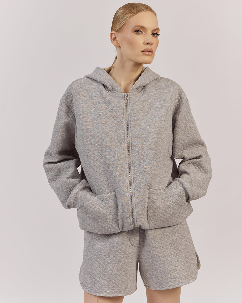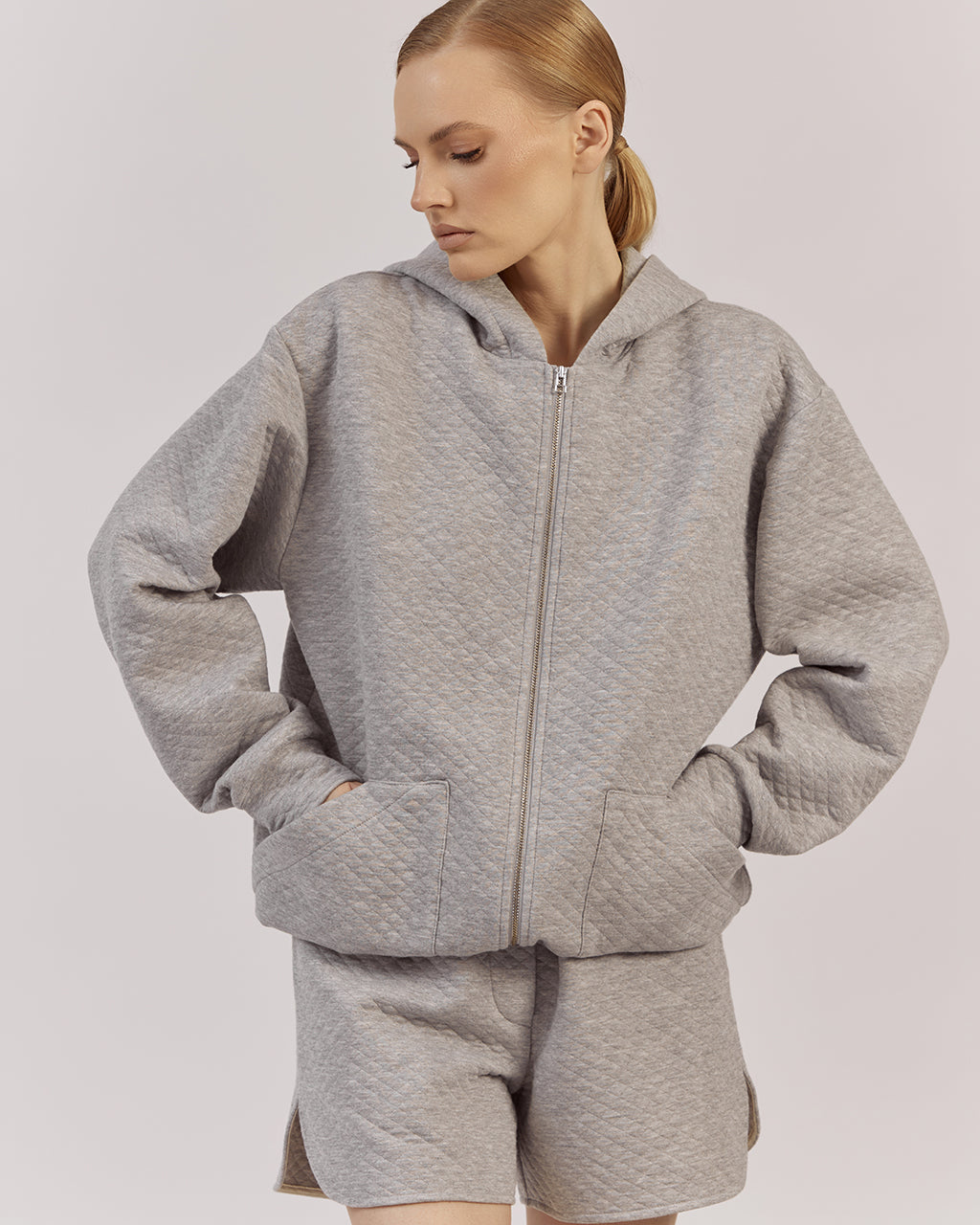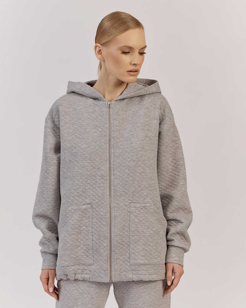 Mīksta un ērta pelēka brīva piegriezuma jaka ar kapuci. Modelis ar elastīgu apakšmalu, sānu kabatām un rāvējslēdzēja aizdari. Izgatavots no bieza, bet viegla trikotāžas auduma ar cilpiņām iekšpusē, kas labi saglabā formu un neveido lieku apjomu. Pievienotās mākslīgās šķiedras nodrošina ilgmūžību un ērtu valkāšanu.
