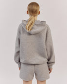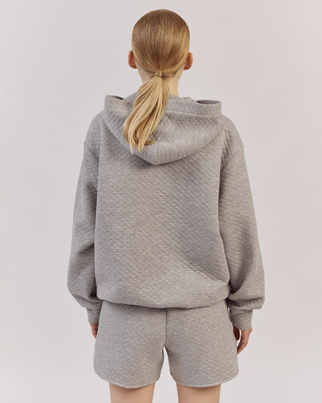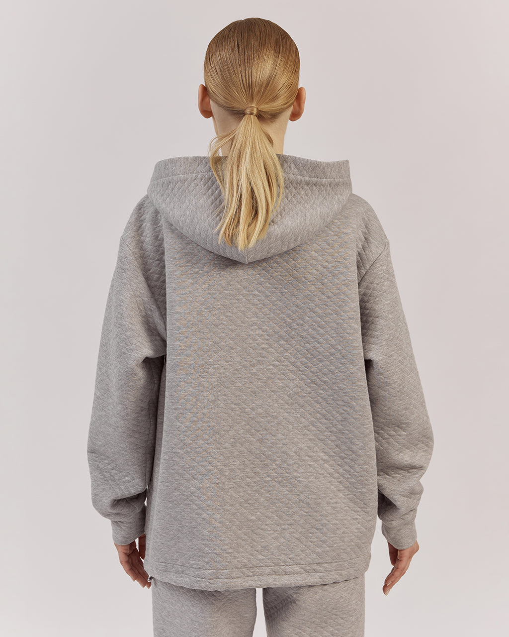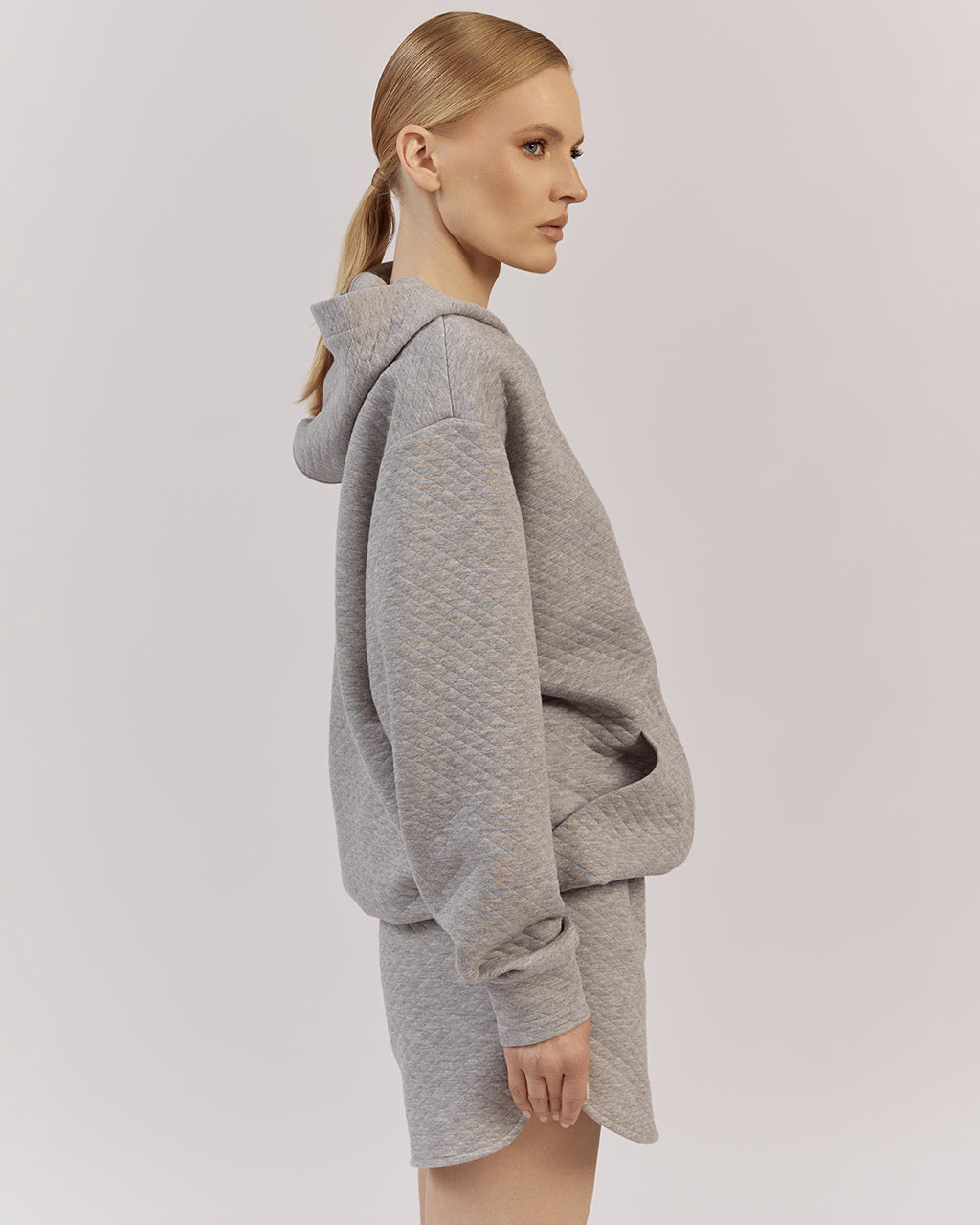 Mīksta un ērta pelēka brīva piegriezuma jaka ar kapuci. Modelis ar elastīgu apakšmalu, sānu kabatām un rāvējslēdzēja aizdari. Izgatavots no bieza, bet viegla trikotāžas auduma ar cilpiņām iekšpusē, kas labi saglabā formu un neveido lieku apjomu. Pievienotās mākslīgās šķiedras nodrošina ilgmūžību un ērtu valkāšanu.