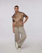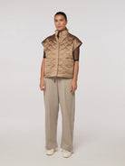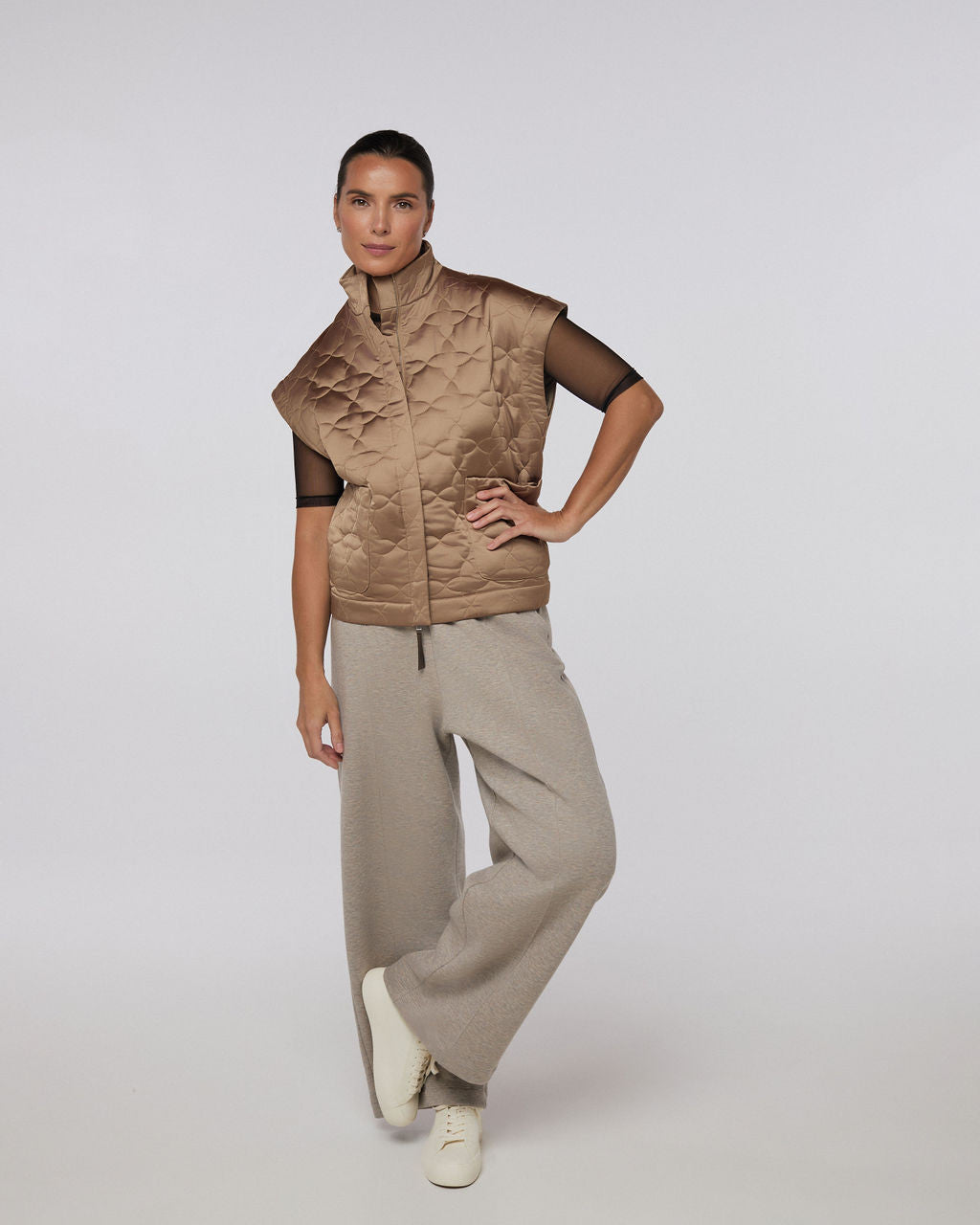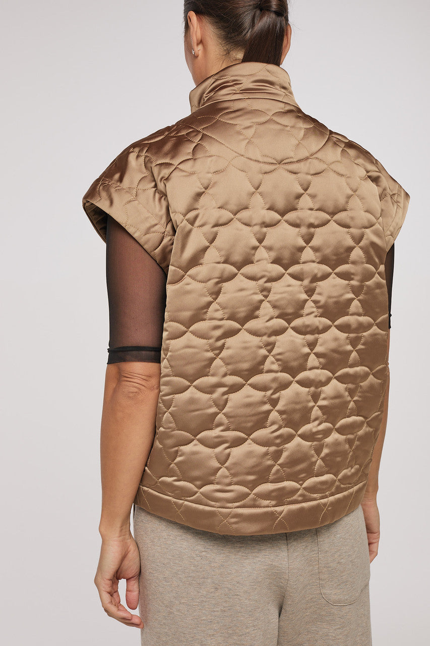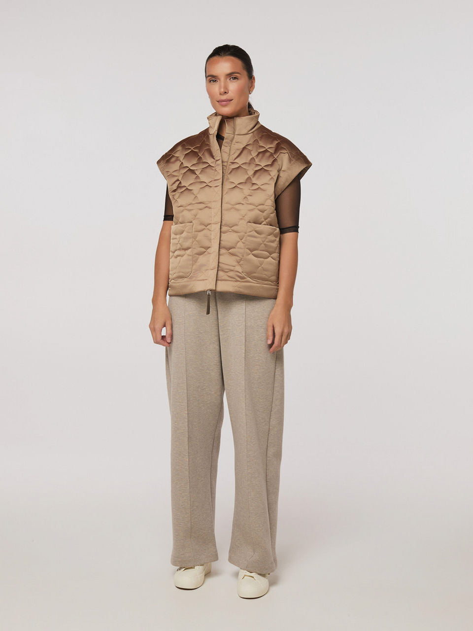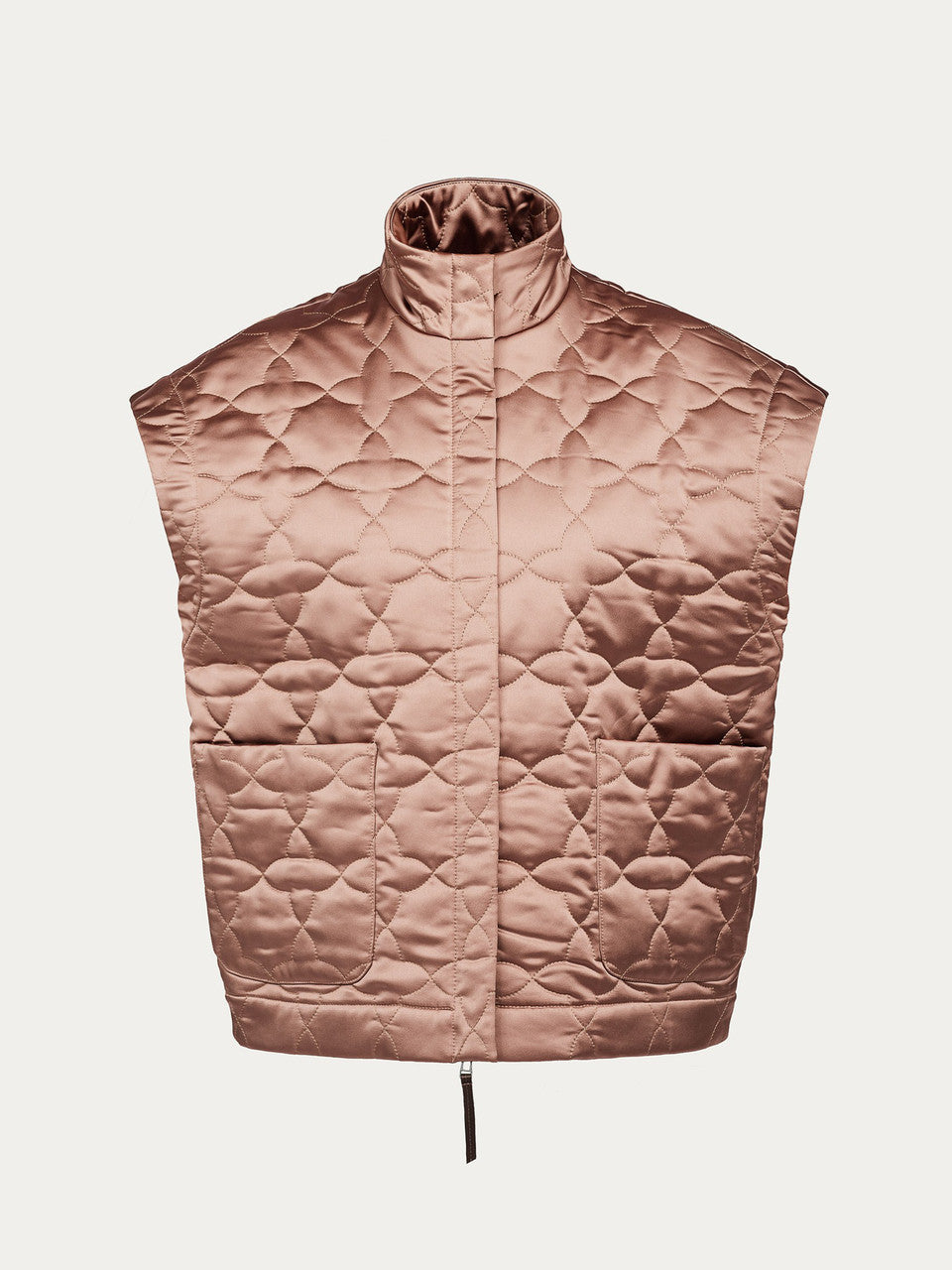 Taisna piegriezuma īsināta veste ar sportisku raksturu, kas piešķir izskatam dinamismu un modernu šarmu. Veste ar augstu apkakli un piešūtām kabatām ir lieliska izvēle siltām dienām, kad meklējat vieglu un stilīgu alternatīvu žaketei. Izgatavota no īpaši mīksta un gluda auduma, ko parasti izmanto virsdrēbēm, tā apvieno komfortu un elegantu izturību. Divvirzienu rāvējslēdzējs ne tikai piešķir praktiskumu, bet arī pievilcīgu stila akcentu.