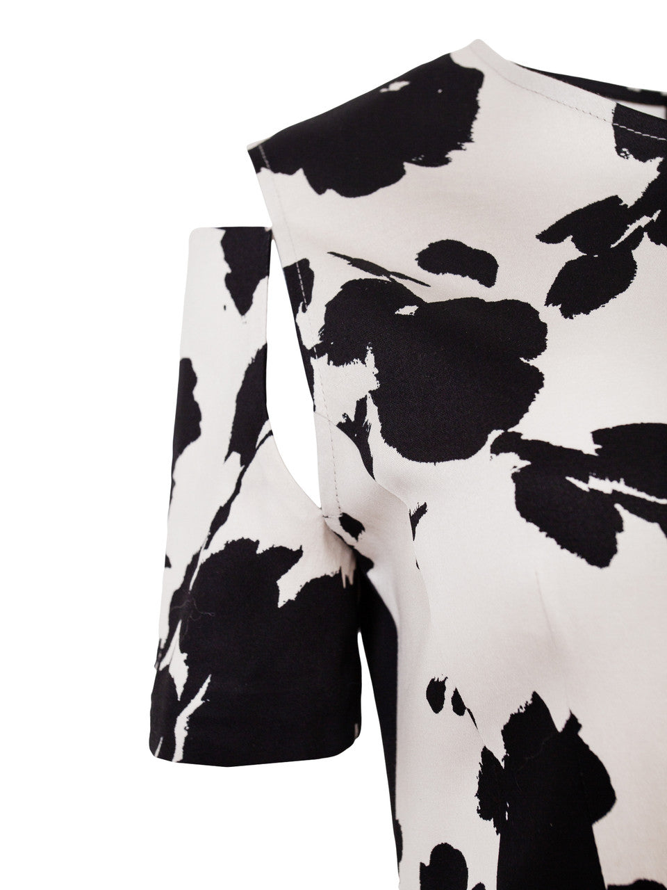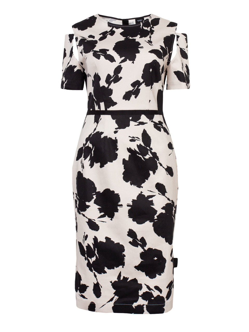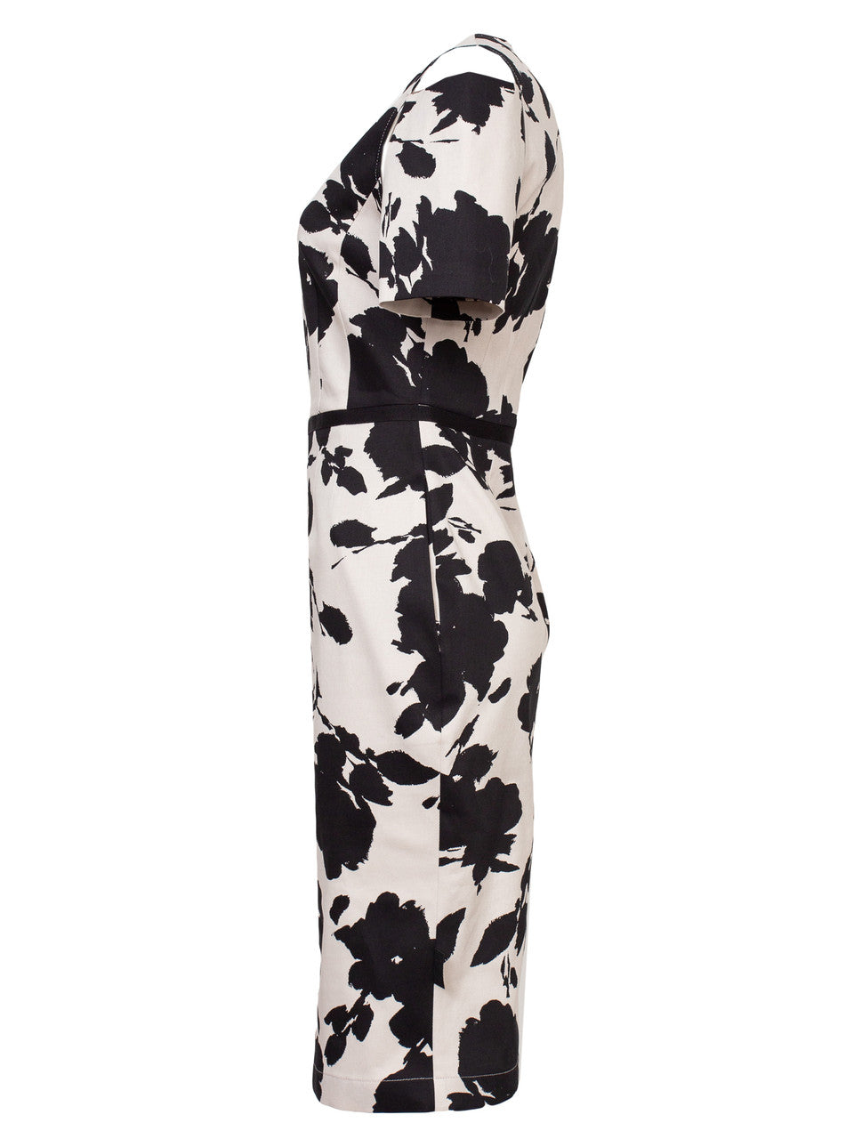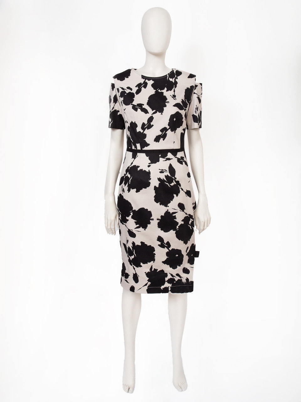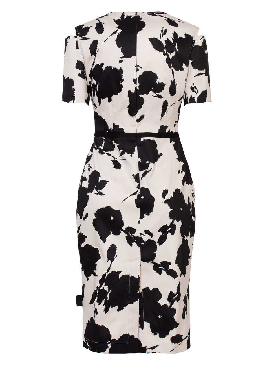 Šī satriecošā, pieguļošā, nedaudz virs ceļiem sniedzošā zīmuļkleita ir izgatavota no krēmkrāsas kokvilnas ar melnu abstraktu ziedu apdruku. Tai ir pieguļošs dizains, apaļš kakla izgriezums, īsas piedurknes ar izgriezumiem, izgriezta jostasvieta, sānu kabatas un rāvējslēdzējs aizmugurē.