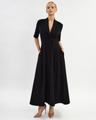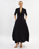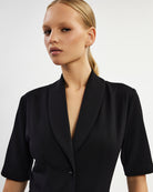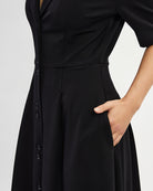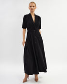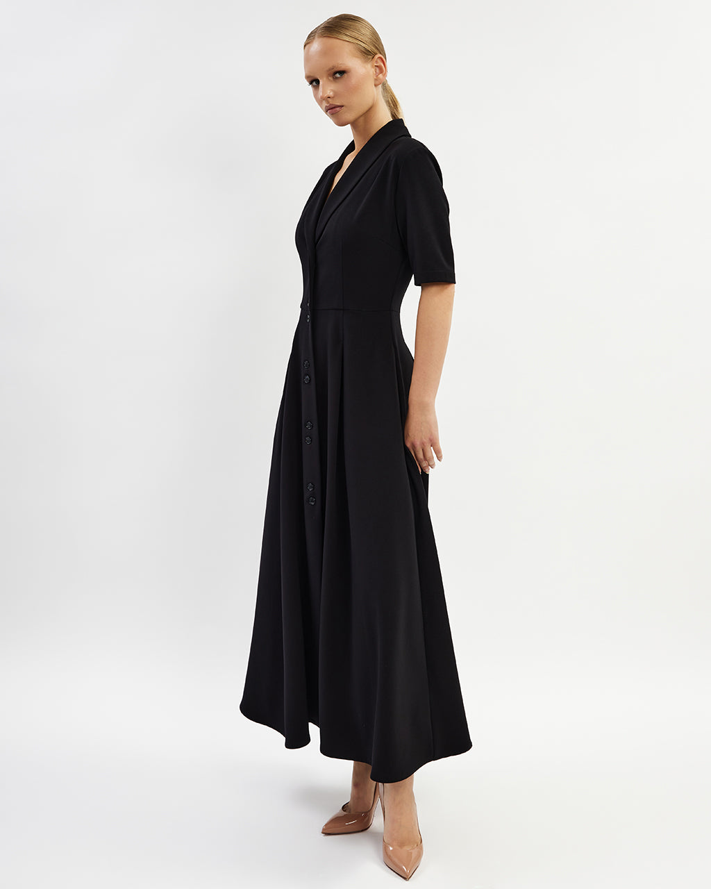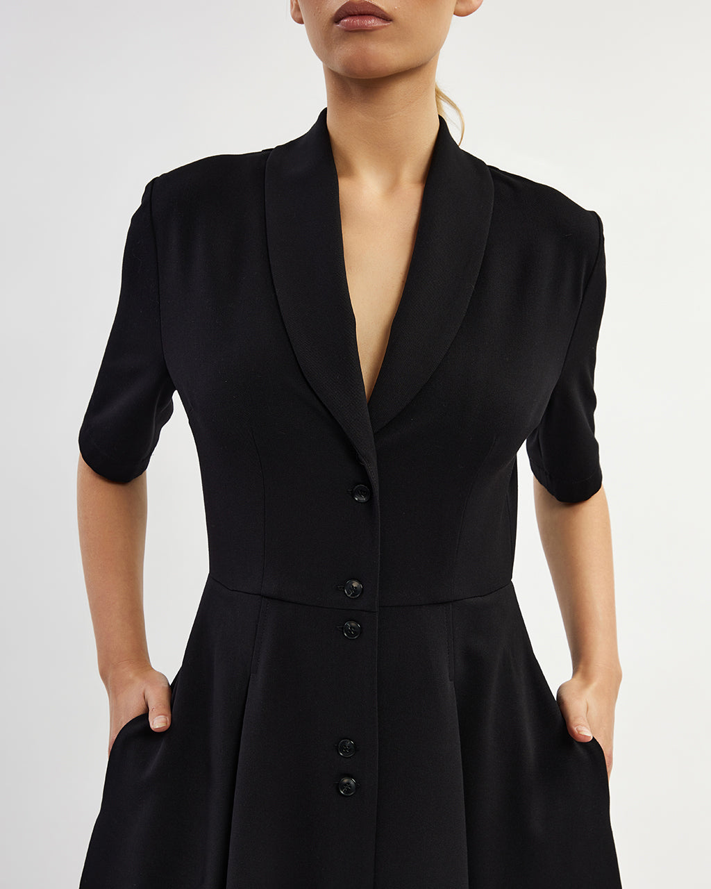 Klasiska kleita ar īsām piedurknēm, darināta no kostīmu auduma. Sievišķības iemiesojums - tā akcentē figūras līnijas un pieguļ jebkurai ķermeņa formai. Ideāli piemērota ikdienas biznesa gaitām un un vakara tēla veidošanai. Aizdare ar divām pogu rindām, šalleveida apkakle un V-veida kakla izgriezums. Kleitas universāls tonis un detaļu minimālisms ļauj to viegli kombinēt ar dažādiem aksesuāriem un apaviem.