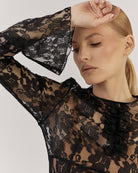 Melno mežģīņu raksti un vieglais caurspīdīgums padara šo kleitu ideāli piemērotu svinīgai atmosfērai un īpašiem notikumiem.