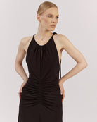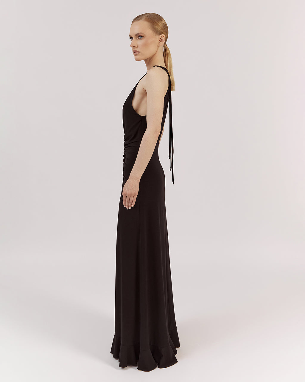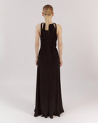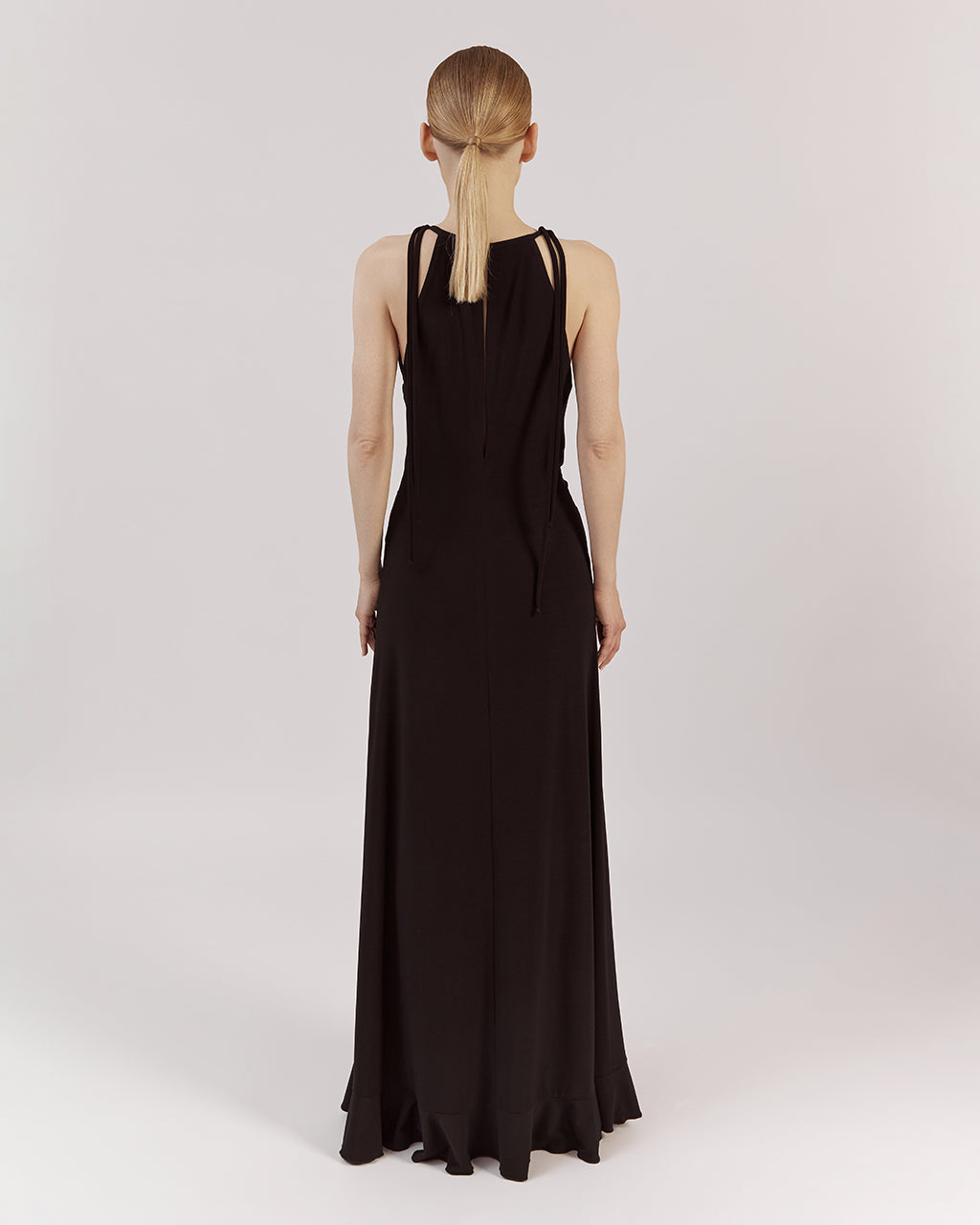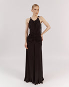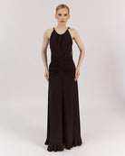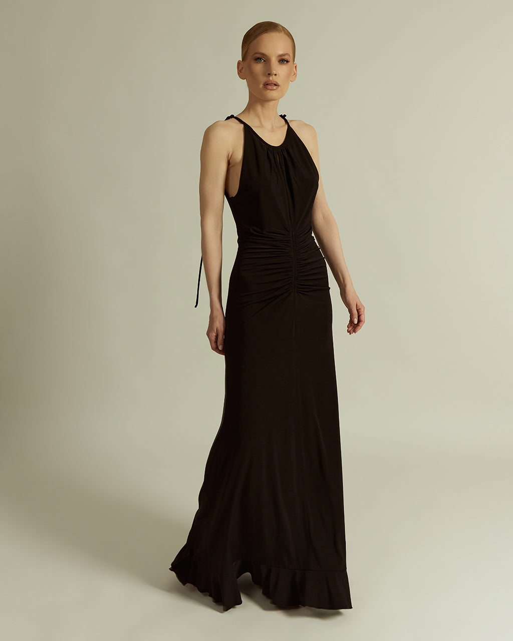 Šī elegantā garā kleita apbur ar savu vieglumu un izsmalcinātību. Pieguļošais siluets un vieglais drapējums gurnu daļā  veido bezrūpīgi graciozu tēlu. Regulējamās lences nodrošina ērtu pielāgošanu un nevainojamu piegulumu.