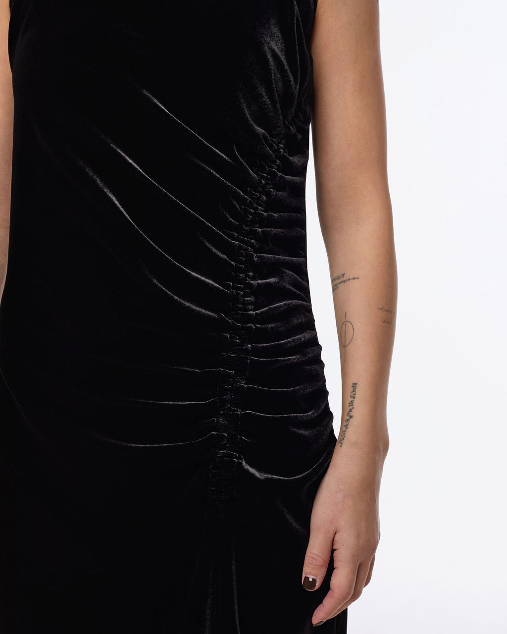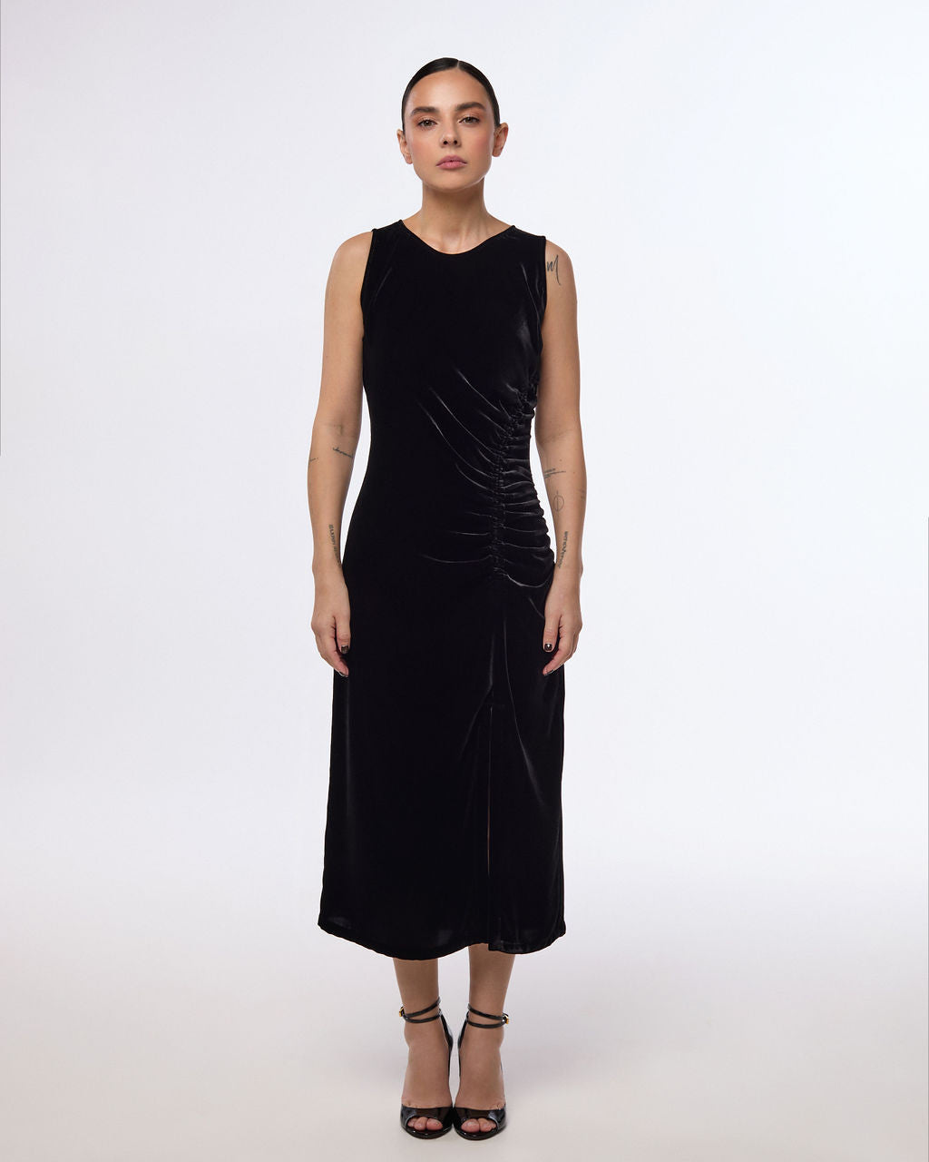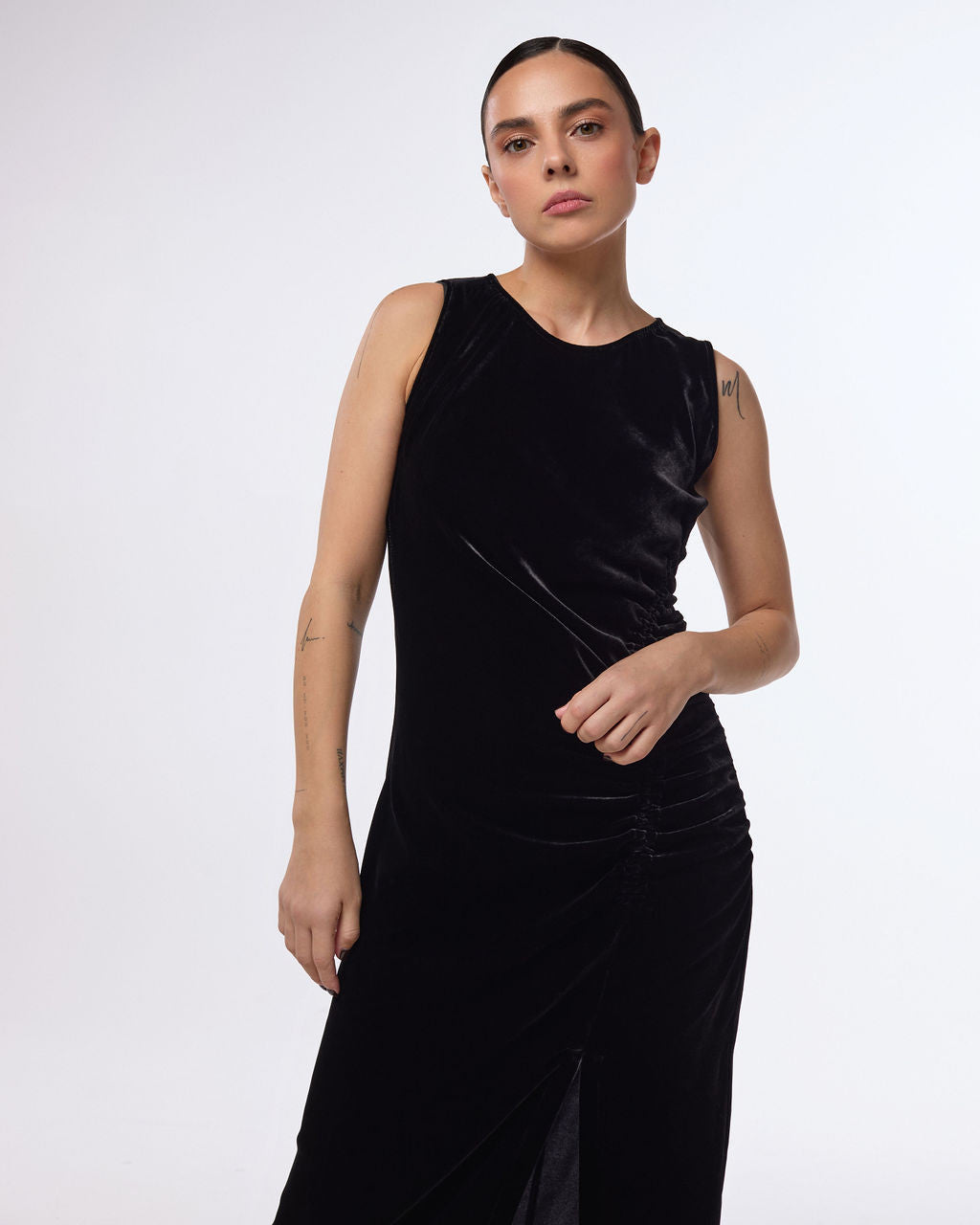 Melna, grezna zīda samta midi garuma kleita bez piedurknēm, kas rada elegantu un sievišķīgu siluetu, pateicoties drapērijai jostasvietā un šķēlumam priekšpusē. Aizdare aizmugurē ar rāvējslēdzēju.