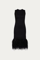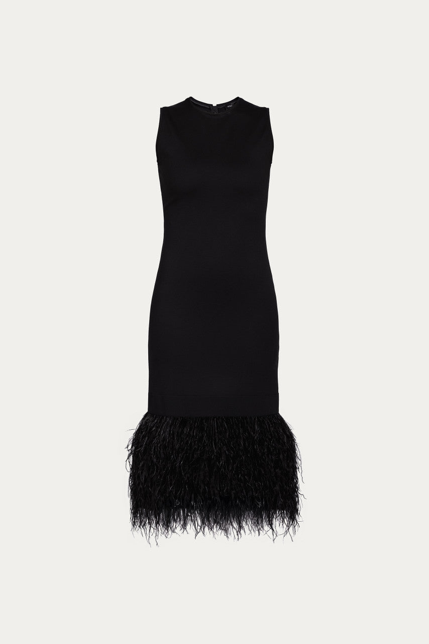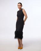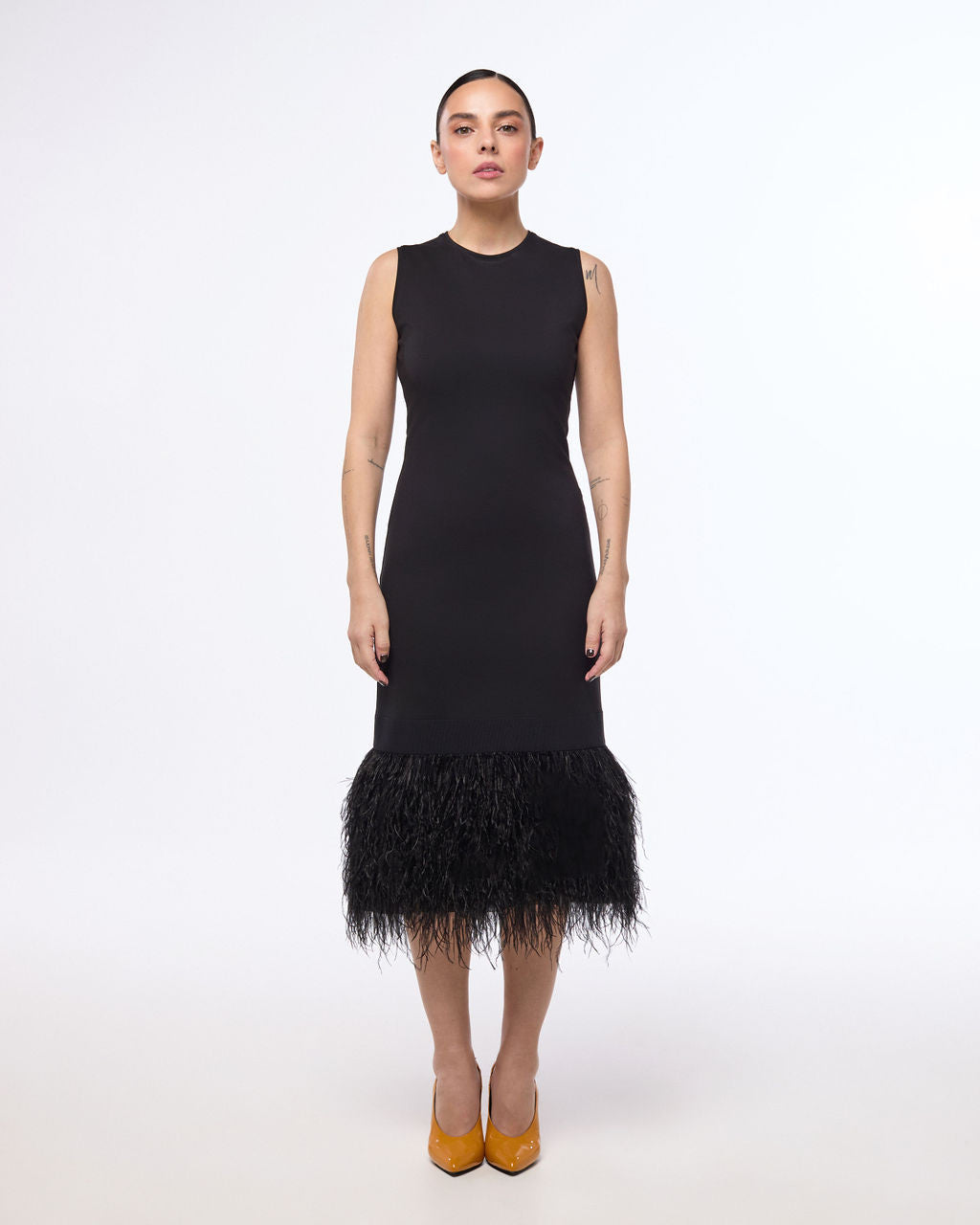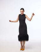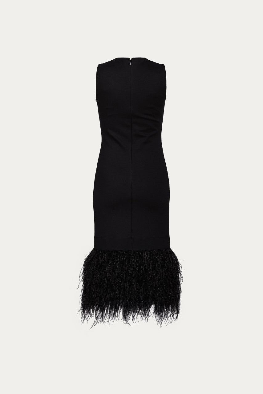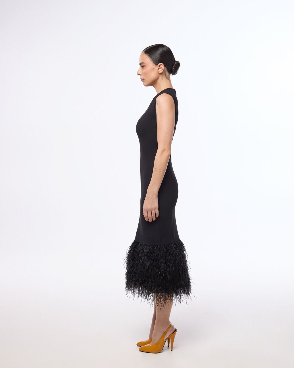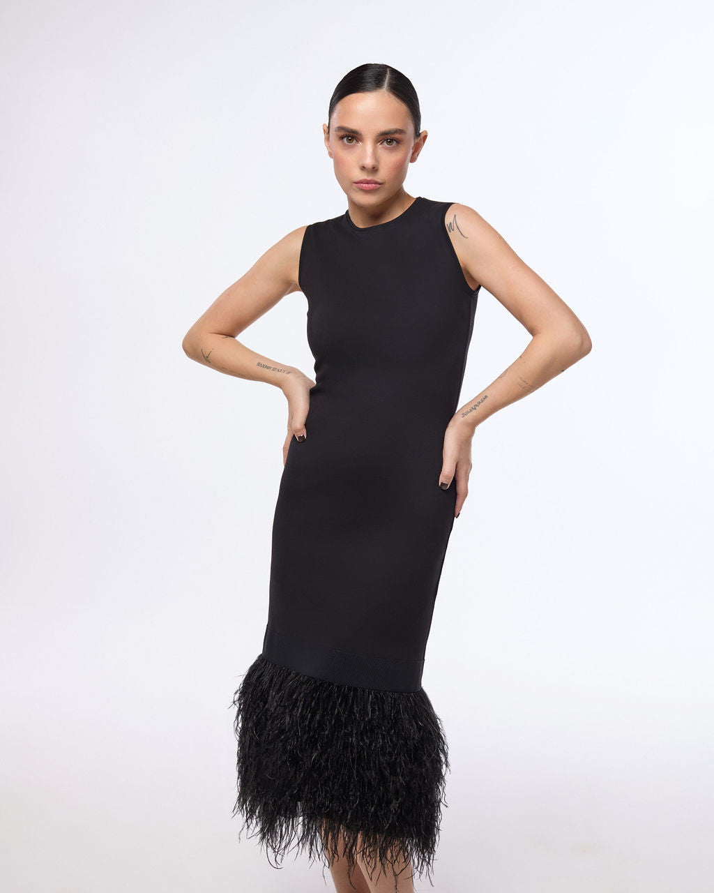 Izcel savu sievišķību un eleganci ar melnu, midi garuma kokteiļkleitu, kas radīta, lai sniegtu svētku un izsmalcinātības sajūtu. Kleitas pieguļošais dizains skaisti izceļ ķermeņa līnijas un rada izteiksmīgu smilšu pulksteņa siluetu, savukārt strausu spavu  apdare apakšmalā piešķir unikālu un greznu akcentu.