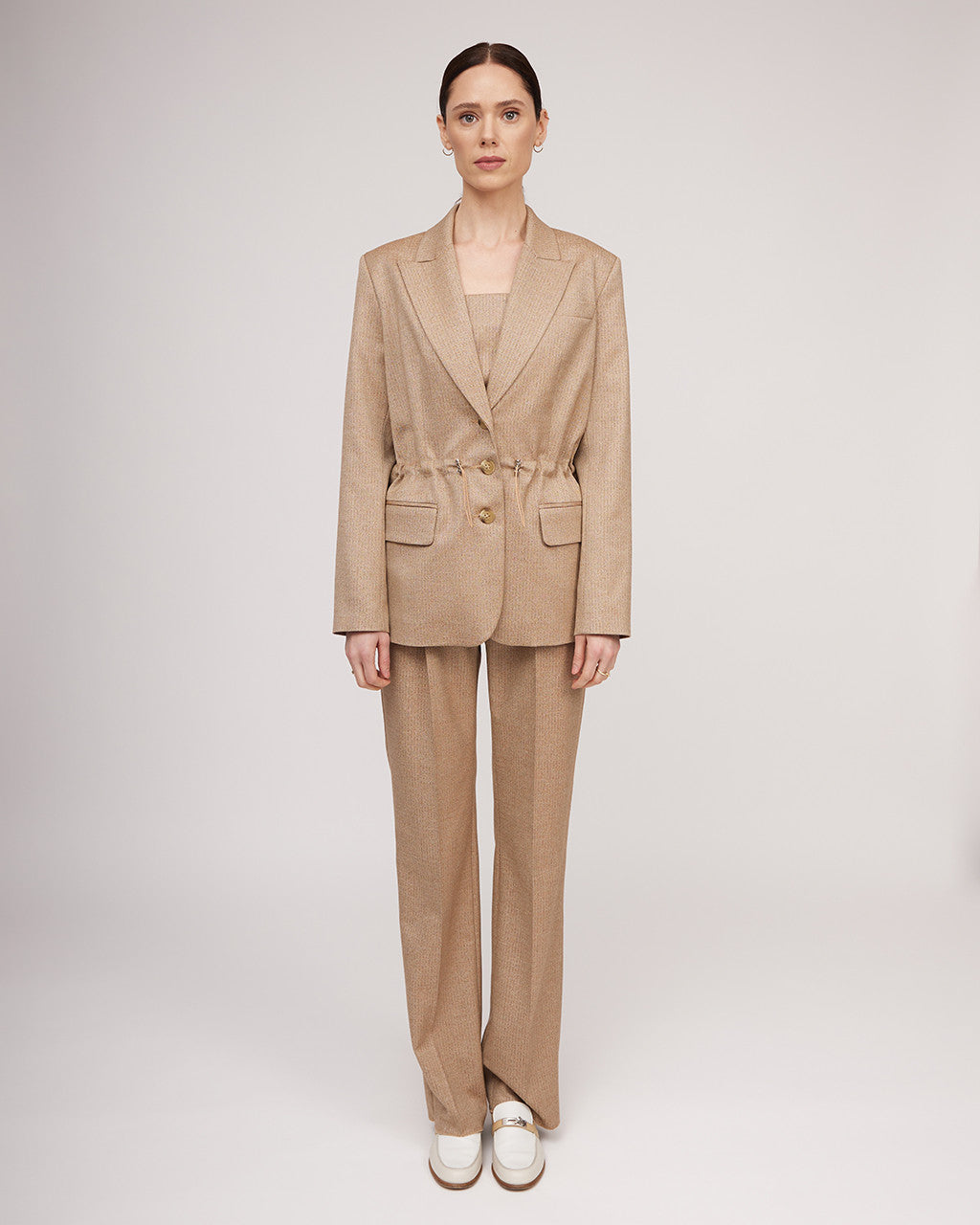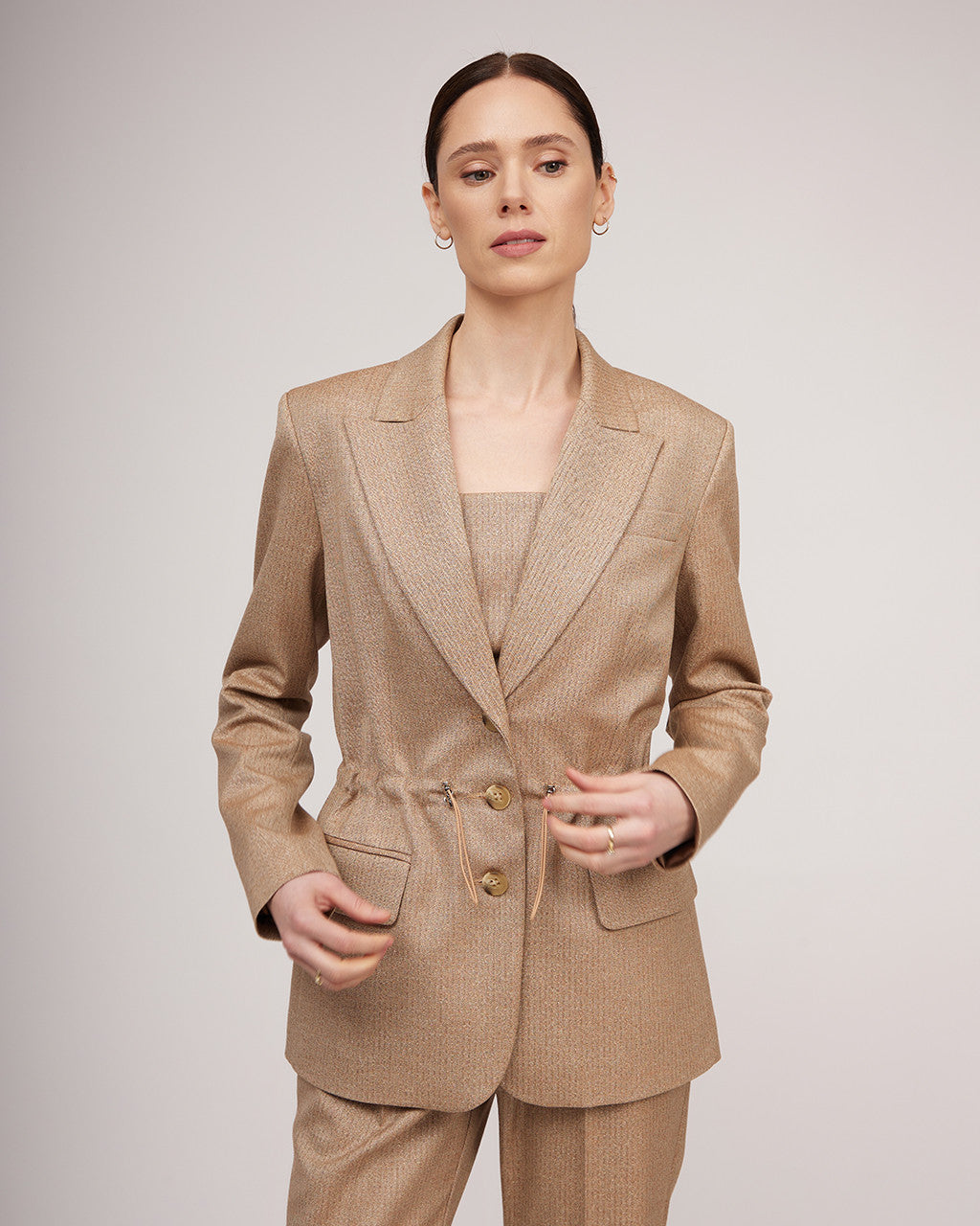 Jaka ar metālisku spīdumu - eleganta un ērta izvēle ikdienas valkāšanai. Pārdomāts piegriezums ar klasiskiem pleciem un savilktu jostasvietu akcentē siluetu. Maigais kamieļkrāsas tonis ar vieglu metālisku spīdumu labi sader ar pamata garderobi, ļaujot to viegli kombinēt ar dažādiem apģērba gabaliem. Saskaņojiet to ar biksēm un korseti no mūsu kolekcijas, lai radītu harmonisku izskatu!