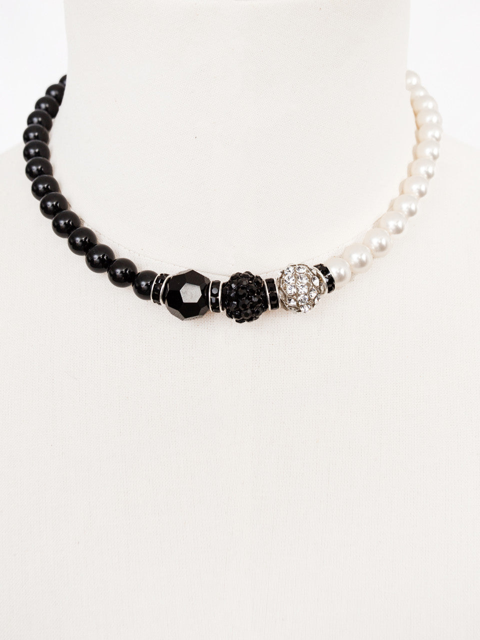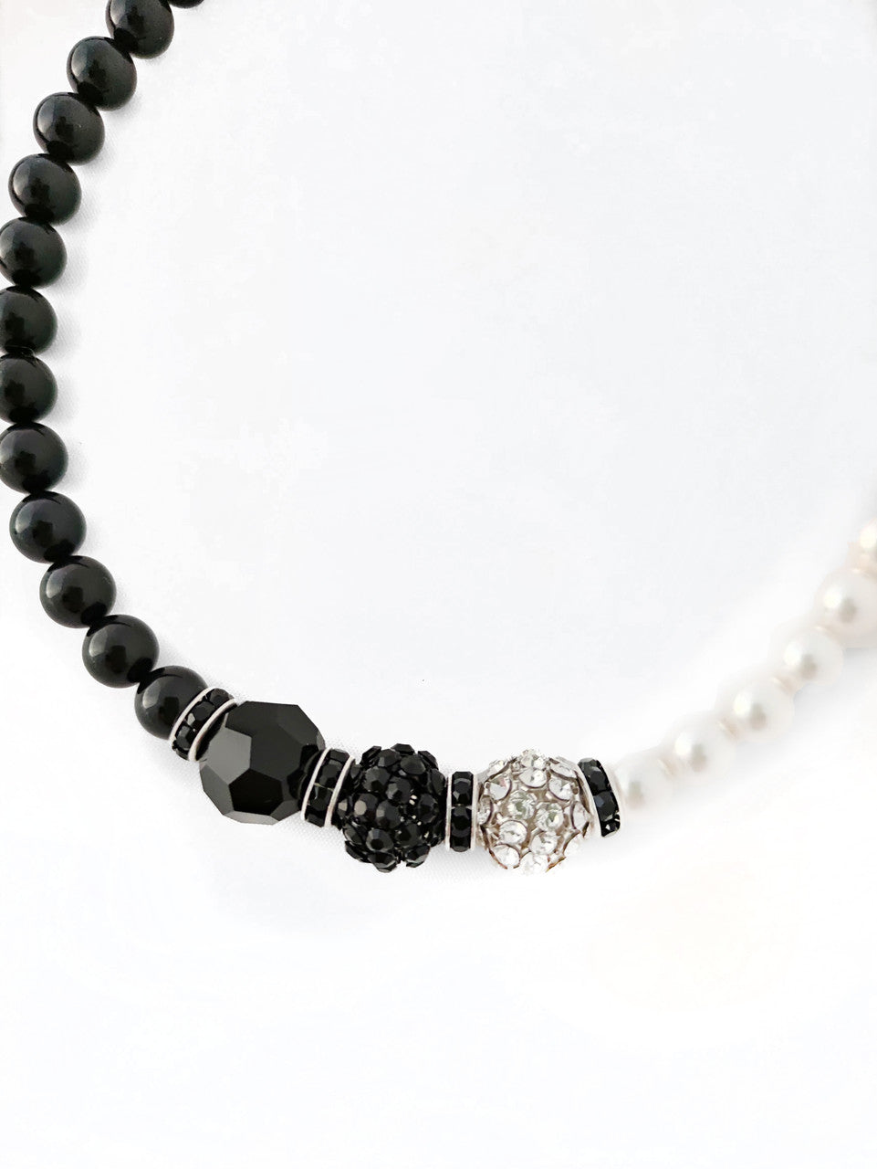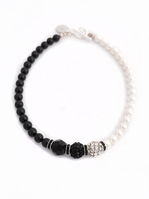 Melnbaltas Swarovski kristāla stikla pērlītes ar Swarovski aizbāžņiem, Pavé lodīti un kristāla pērlītēm, asimetrisks dizains ar mainīgām dažāda izmēra pērlītēm un omāra spīles aizdari. Unikāla rotaslieta, ko roku darbs izgatavojusi NOLO dizainere Viktorija Joniene. Sastāvs: Swarovski kristāla stikla pērlītes, Swarovski aizbāžņi un Pavé lodīte, metāla detaļas.