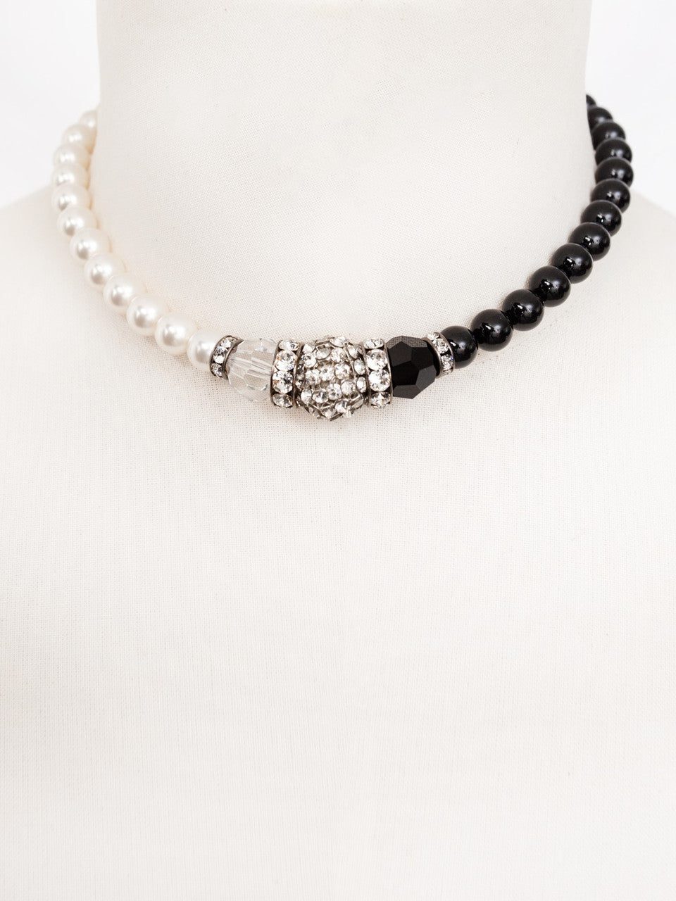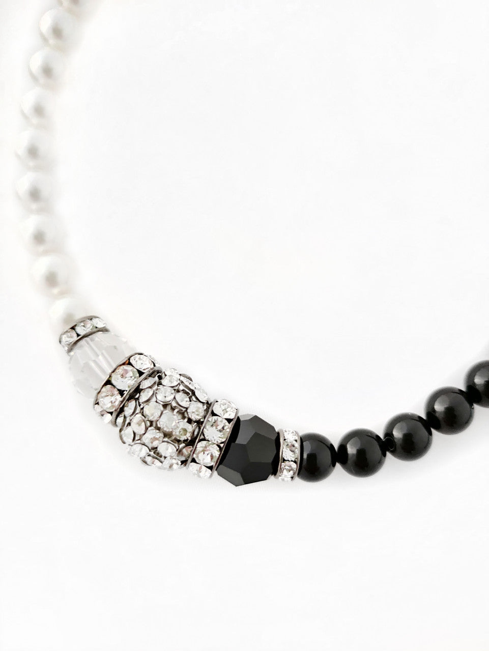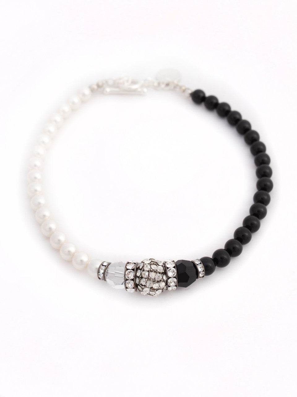Melnbaltas Swarovski kristāla stikla pērlītes ar Swarovski aizbāžņiem, Pavé lodīti un kristāla pērlītēm, asimetrisks dizains ar mainīgām dažāda izmēra pērlītēm un omāra spīles aizdari. Unikāla rotaslieta, ko roku darbs izgatavojusi NOLO dizainere Viktorija Joniene. Sastāvs: Swarovski kristāla stikla pērlītes, Swarovski aizbāžņi un Pavé lodīte, metāla detaļas.
