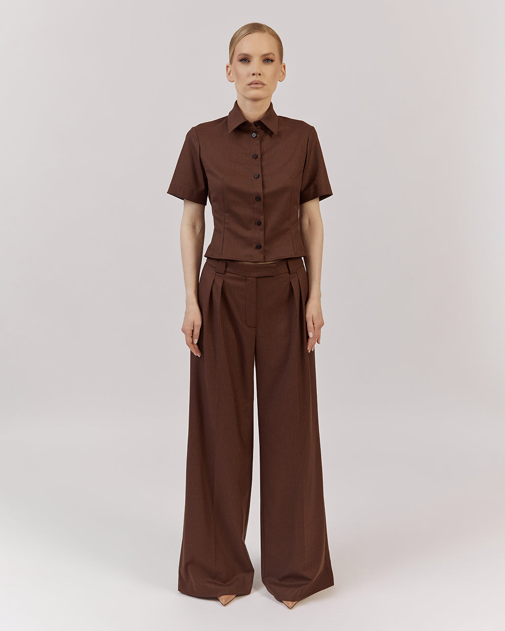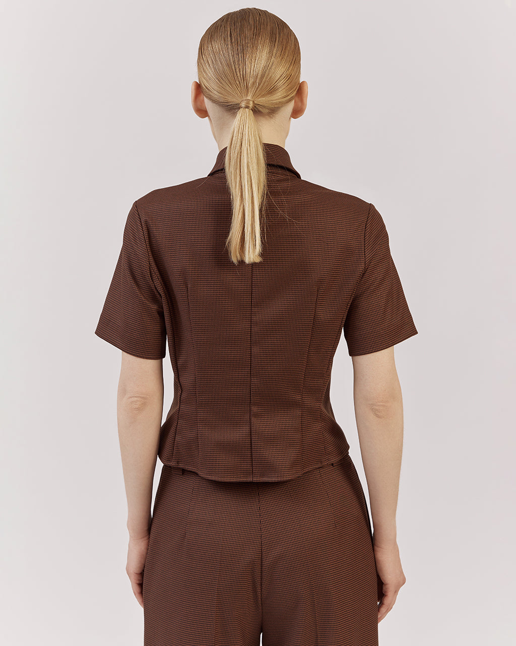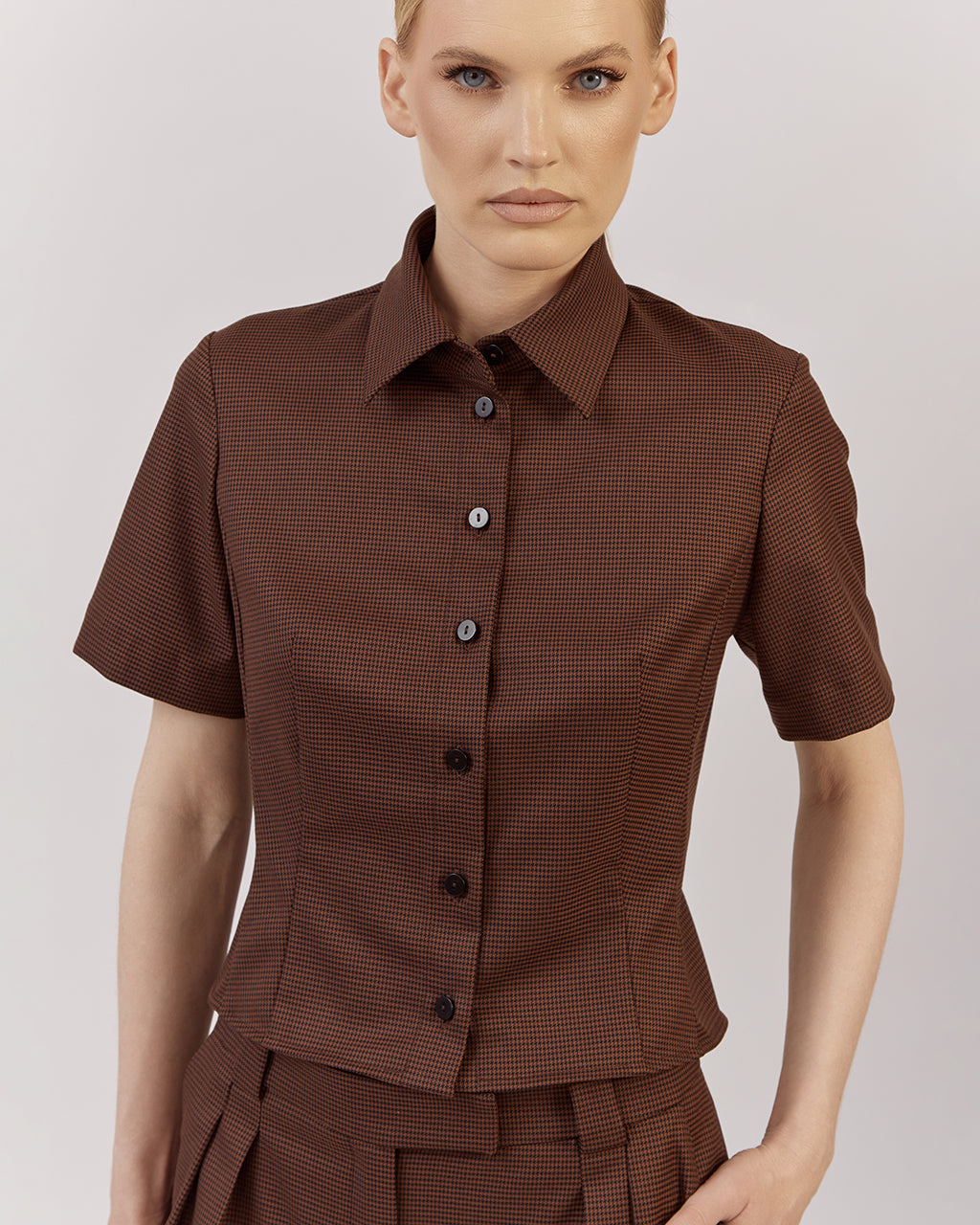 Lakonisks pieguļošs krekls ar īsām piedurknēm – ideāla izvēle mūsdienīgiem ikdienas tēliem. Izgatavots no viskozes un poliestera apvienojuma, kas nodrošina komfortu un vieglu kopšanu. Krekls ar pogu aizdari. Mūsdienīgs, īss piegriezums.