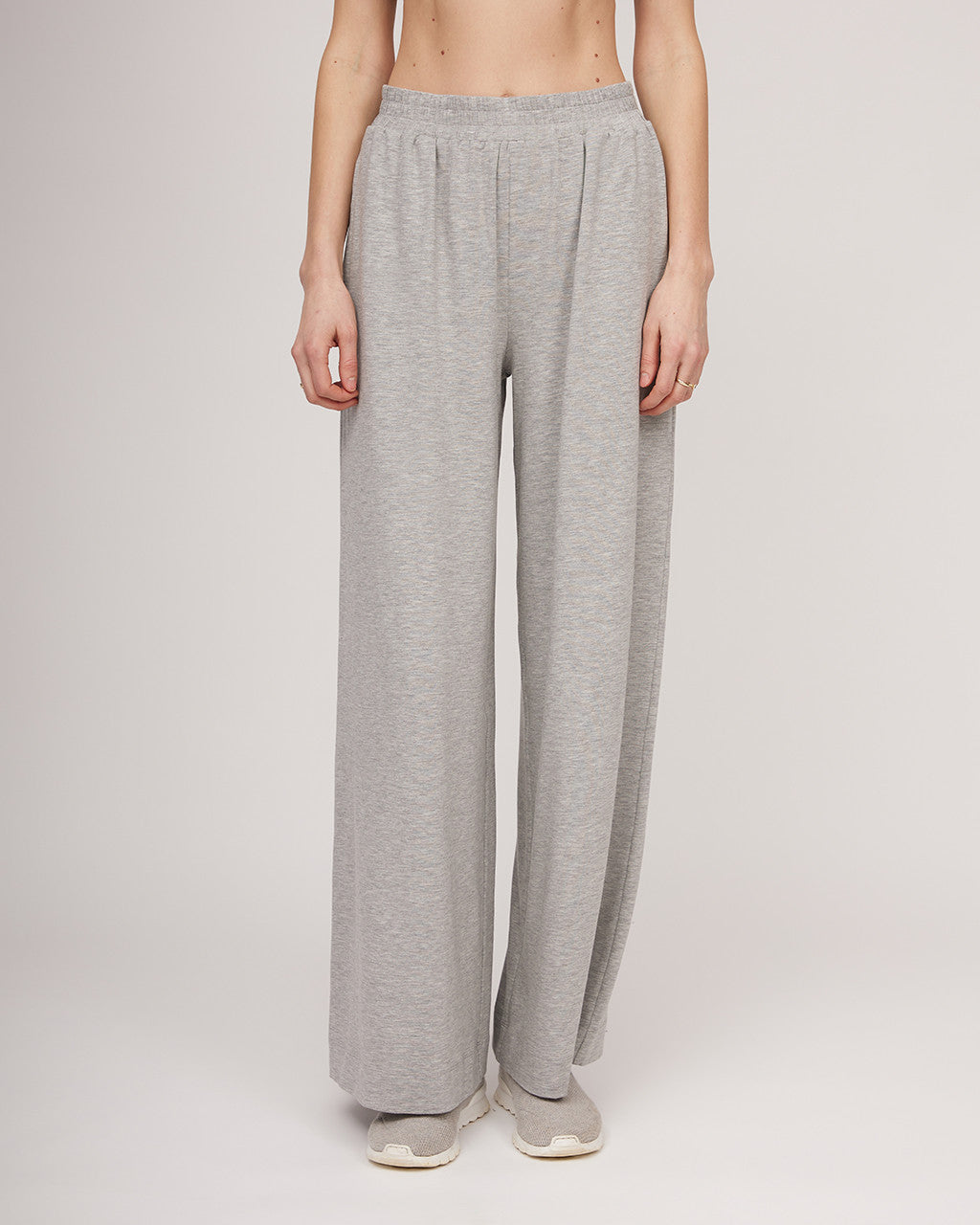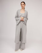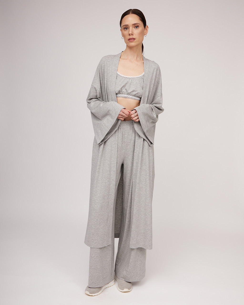 Pelēkas platas bikses ar elastīgu jostasvietu, kas ir ļoti ērtas un nodrošina kustību brīvību. Vieglais un plūstošais džersija audums labi notur formu un rada skaistas, graciozas krokas, padarot tās par daudzpusīgu izvēli jebkuram gadalaikam. Sānu kabatas ir praktiskas ikdienas valkāšanai. Lieliski sader ar mūsu kolekcijas topiem un halātiem, ļaujot radīt elegantu un harmonisku izskatu.