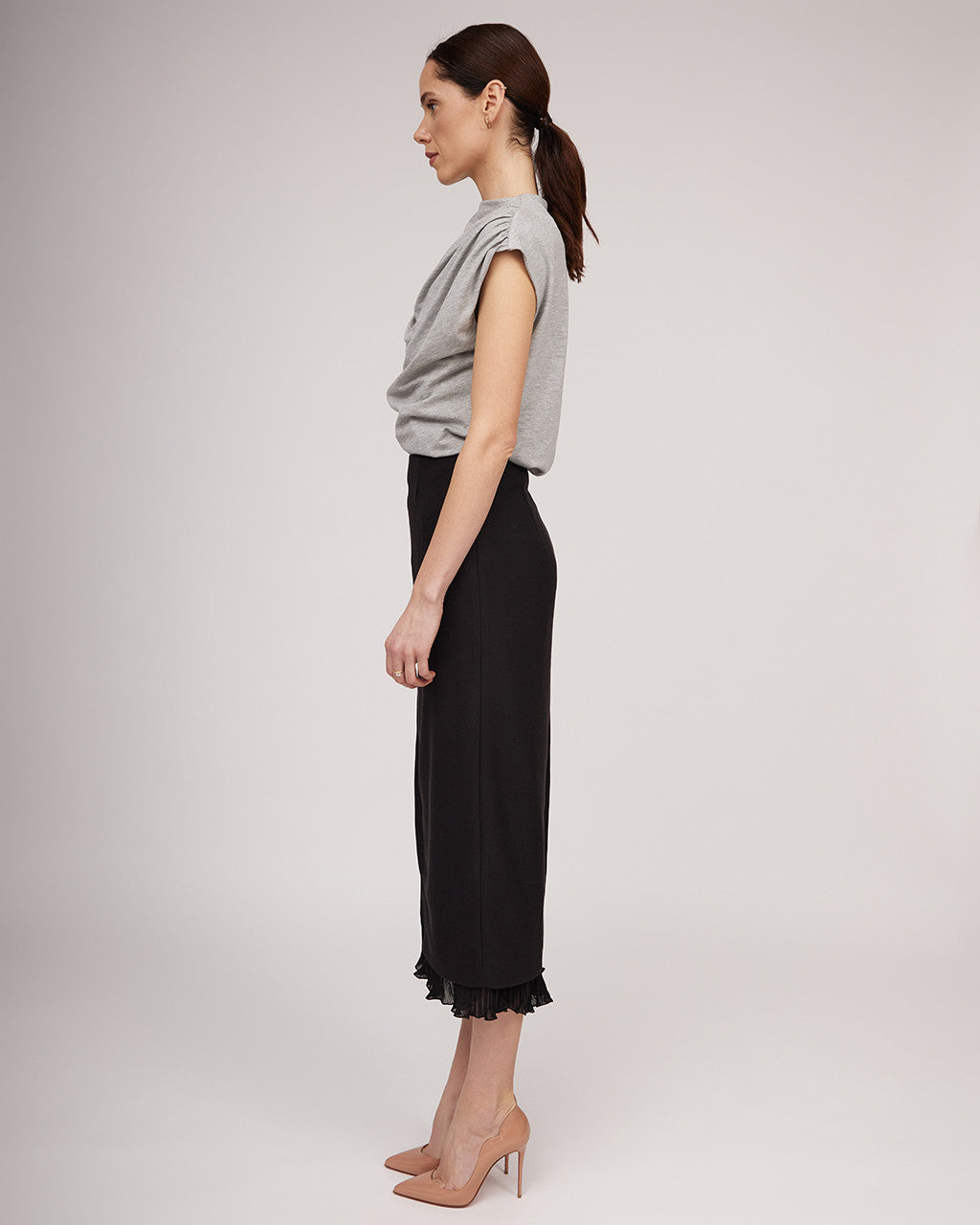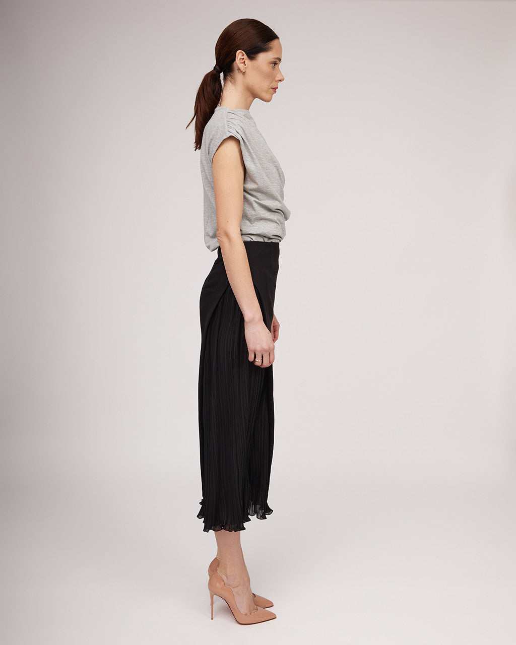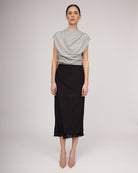 Pelēks drapēts bezpiedurkņu tops, kas izgatavots no ērta kokvilnas un modāla viskozes džersija. Vienkāršs garderobes elements, ko var viegli kombinēt ar biksēm, svārkiem un žaketi.