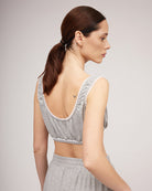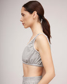 Pelēko melanžas džersija krūštura topiņu rotā viegli drapējošs un kontrastējošs apmales elements, piešķirot tam apakšveļas iedvesmotu izskatu. Modelis ir izgatavots no mīksta un elpojoša kokvilnas un modāla maisījuma, nodrošinot izcilu komfortu. Tas labi sader ar biksēm un halātu no mūsu kolekcijas, radot harmonisku un mājīgu izskatu.