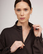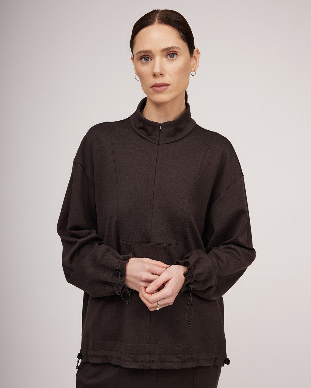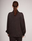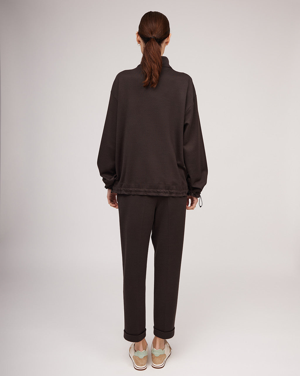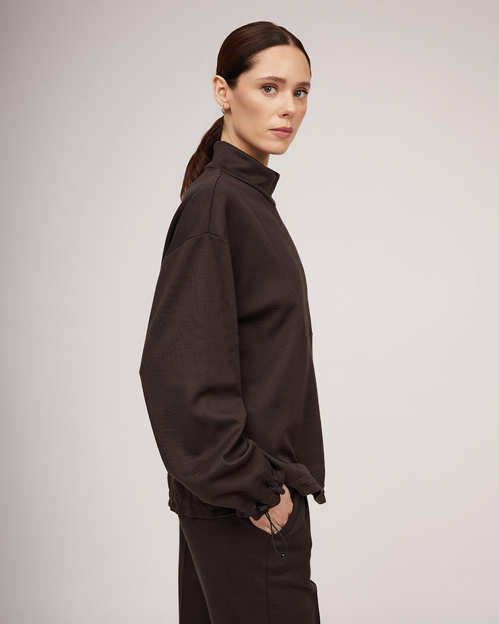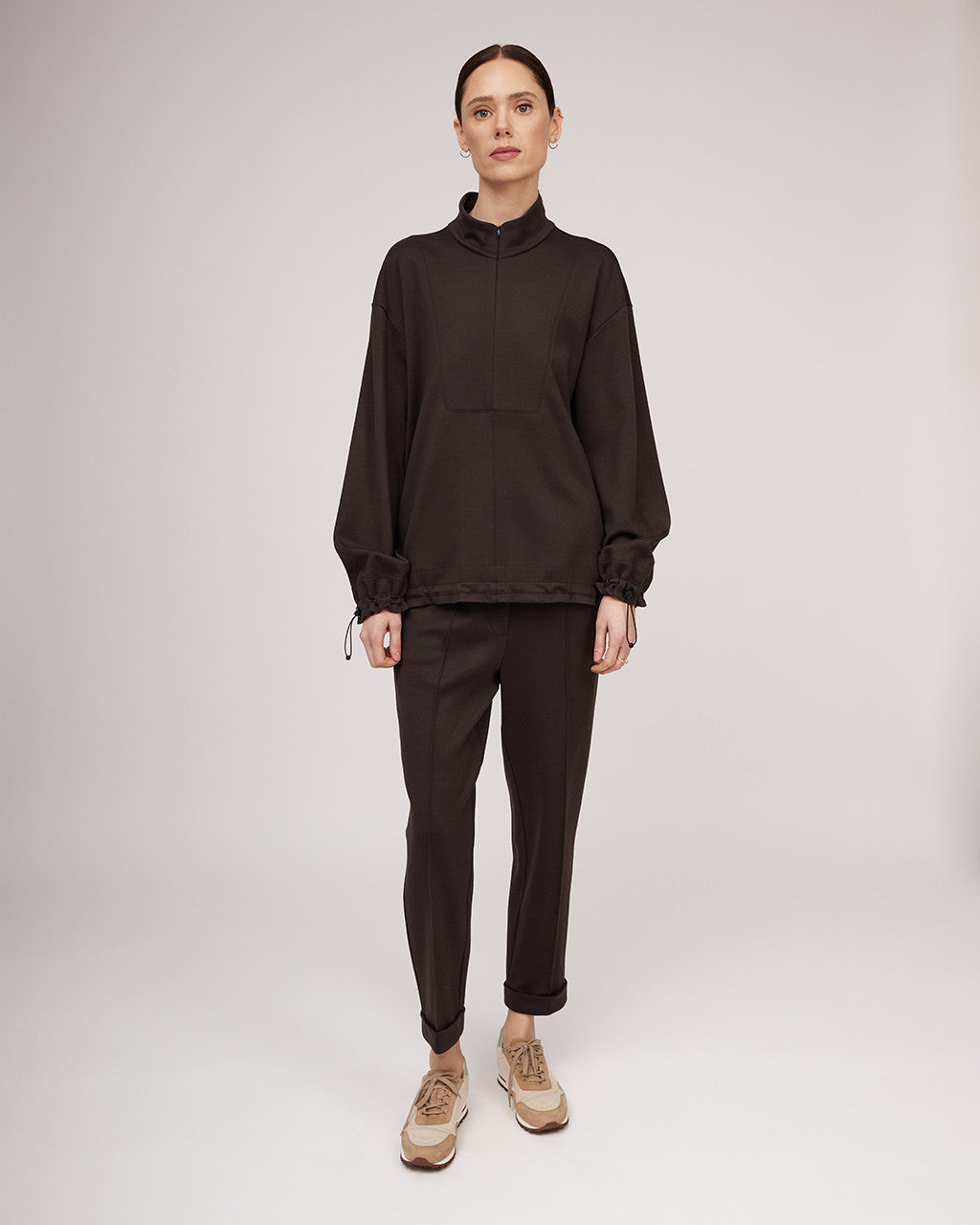 Ērts, brīva piegriezuma džemperis — lieliski piemērots pavasarim un ziemai. Šis daudzpusīgais sieviešu džemperis ar stāvapkakli un rāvējslēdzēju nodrošina siltumu un komfortu, savukārt pazeminātā plecu līnija un aproces ar ielocēm piešķir tam modernu siluetu. Metāla aizdares apakšmalā ļauj regulēt izmēru, padarot to par lielisku izvēli gan ikdienas valkāšanai, gan ceļojumiem. Džemperis ir izgatavots no gluda un mīksta trikotāžas auduma ar vilnu, un to var valkāt kā virsdrēbi pavasarī vai kopā ar dūnu jaku vai brīvu mēteli ziemā, radot mūsdienīgu un daudzpusīgu izskatu.