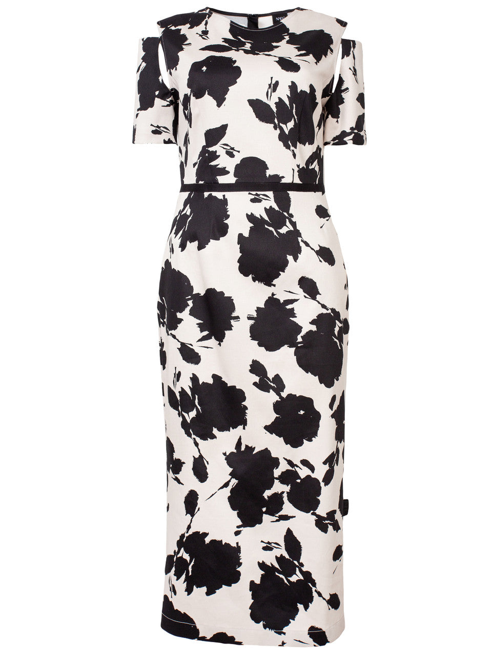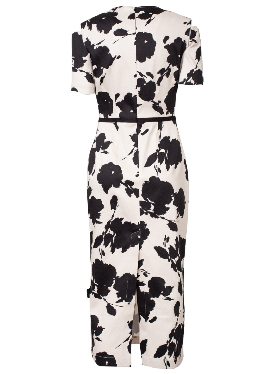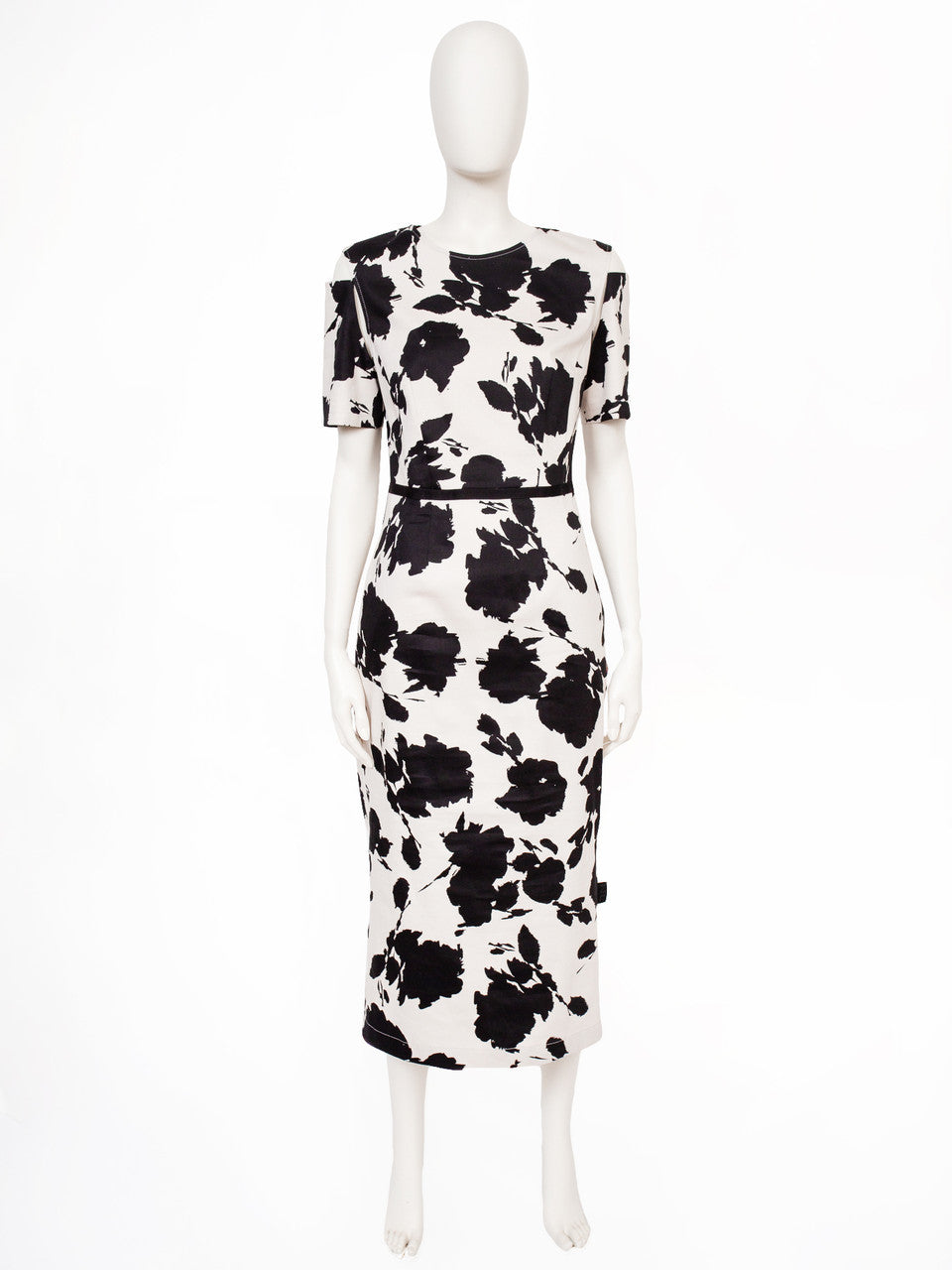 Šī satriecošā, pieguļošā zīmuļkleita, kas sniedzas zem ceļiem, ir izgatavota no krēmkrāsas kokvilnas ar melnu abstraktu ziedu apdruku. Tai ir pieguļošs dizains, apaļš kakla izgriezums, īsas piedurknes ar izgriezumiem, izgriezta jostasvieta, sānu kabatas un rāvējslēdzējs aizmugurē.