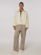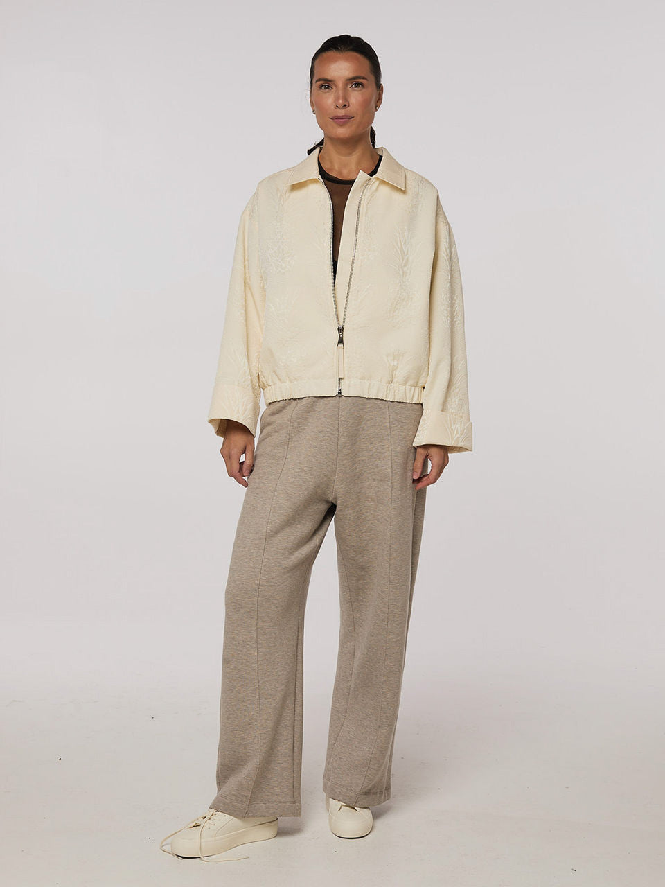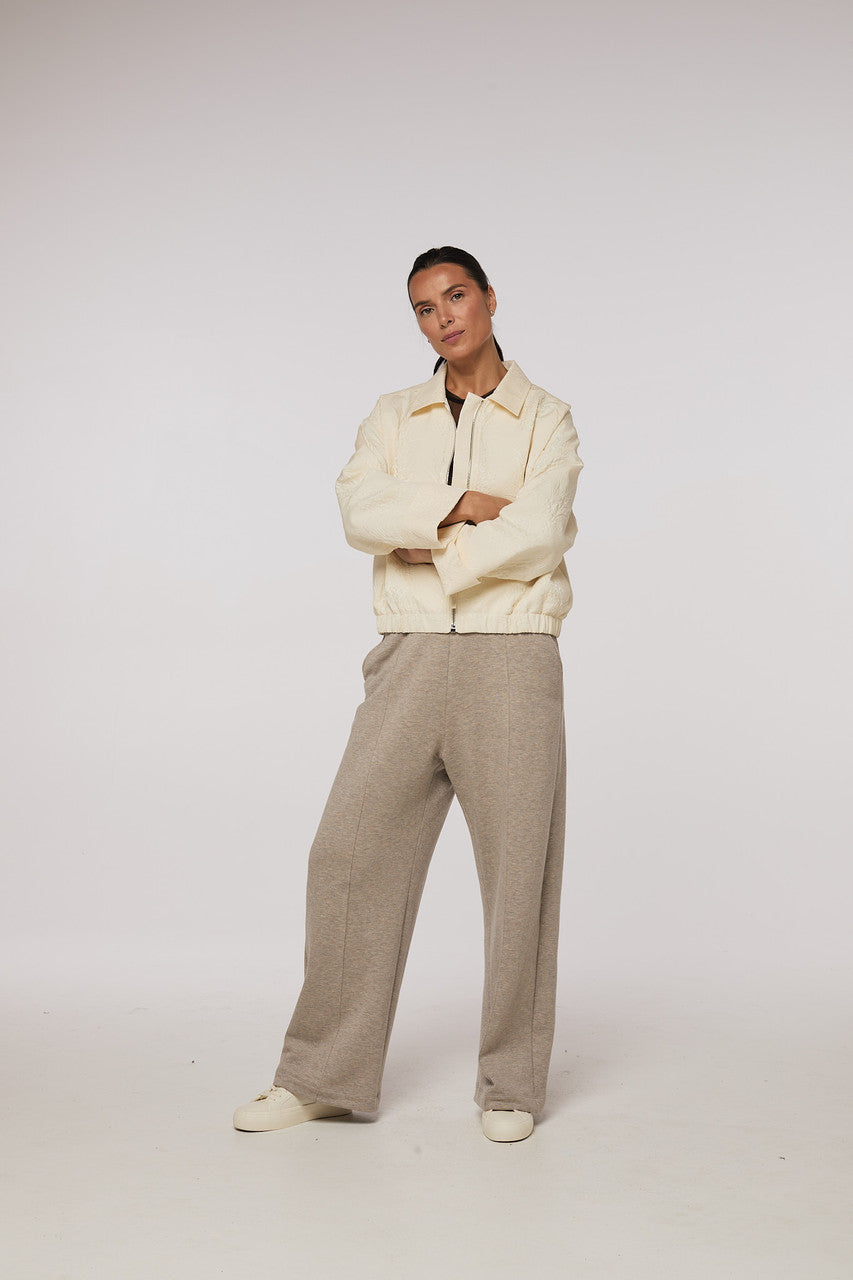 Universālas bikses ar taisnu siluetu, smalkām ielocēm un ielocēm, kas sākas no jostasvietas, ērtām kabatām un skaistu toni, kas harmoniski iederas jebkurā garderobē. Izgatavotas no vilnas,kokvilnas un elastāna maisījuma auduma, nodrošinot patīkamu, mīkstu tekstūru ar izsmalcinātu melanžas rakstu un samtainu virsmu.