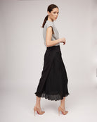 Midi svārki ar izteiksmīgām ielocēm un gaisīgu audumu, ar garumu zem ceļiem un šķēlumu vienā pusē. Pieguļoša jostasvieta nodrošina komfortu, savukārt rūpīgi izstrādātās līknes nodrošina perfektu piegulumu. Lieliski piemēroti spilgtam tēlam vakara pasākumos vai īpašos brīžos.