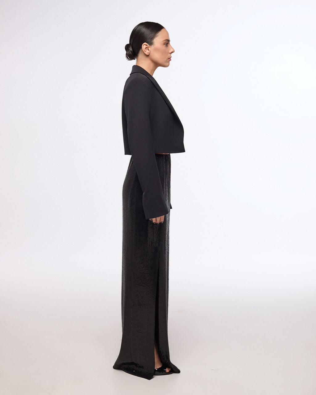 Pievieno eleganci savai svētku garderobei ar šiem melnajiem, fliteru auduma, maxi svārkiem, kas izceļas ar vieglu spīdumu un sievišķīgu sānu šķēlumu. Plūstošais siluets piešķir vieglumu un eleganci, padarot tos lieliski piemērotus svētku pasākumiem, vakara iziešanām vai īpašiem notikumiem. Kombinē ar satīna blūzi vai mīkstu adījumu izsmalcinātam un harmoniskam tēlam..