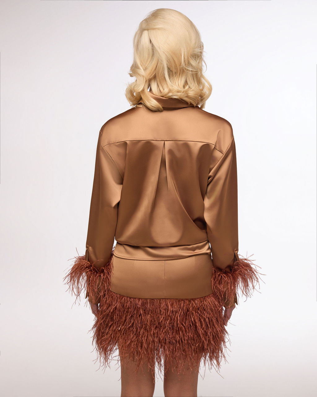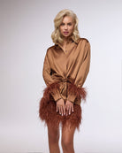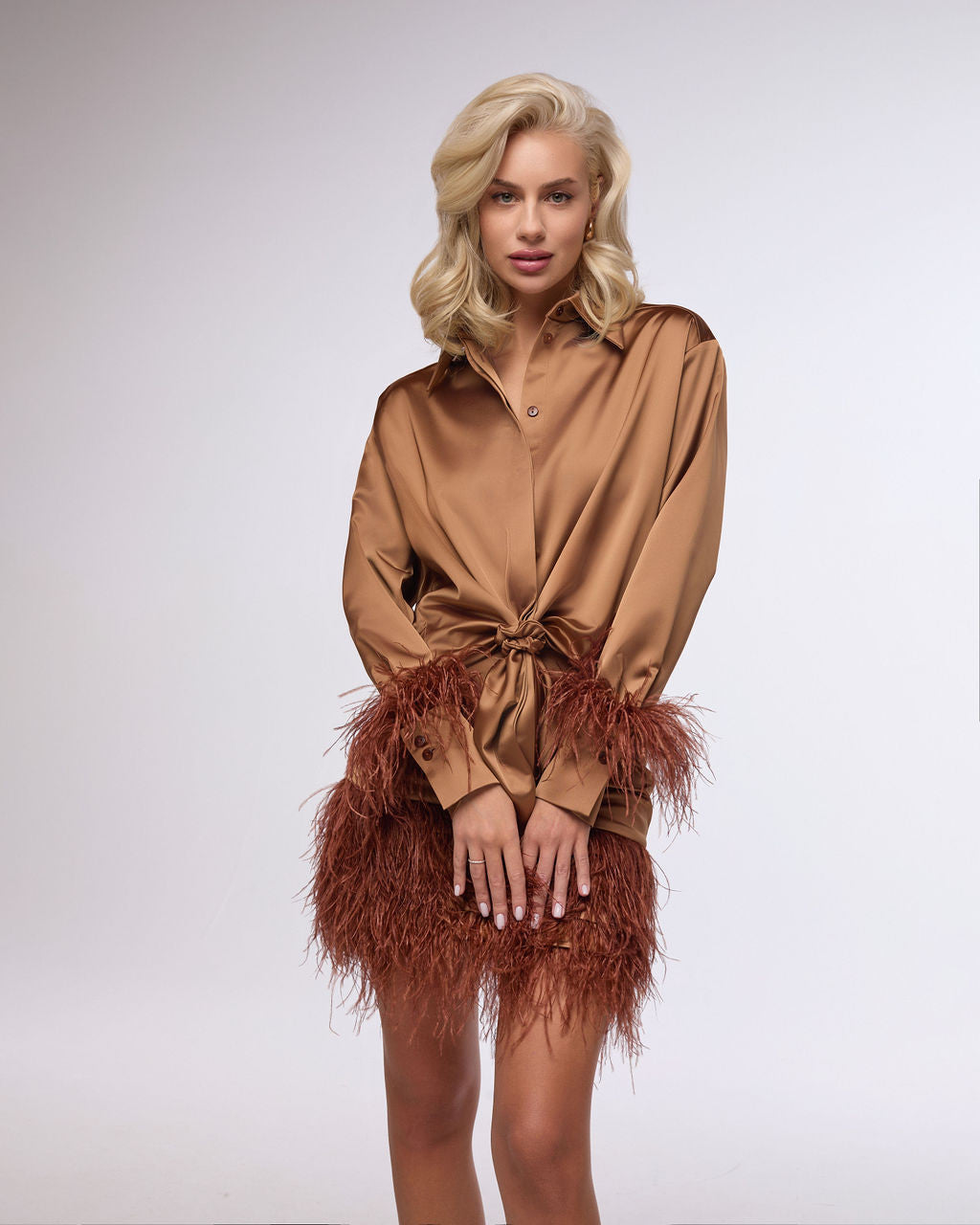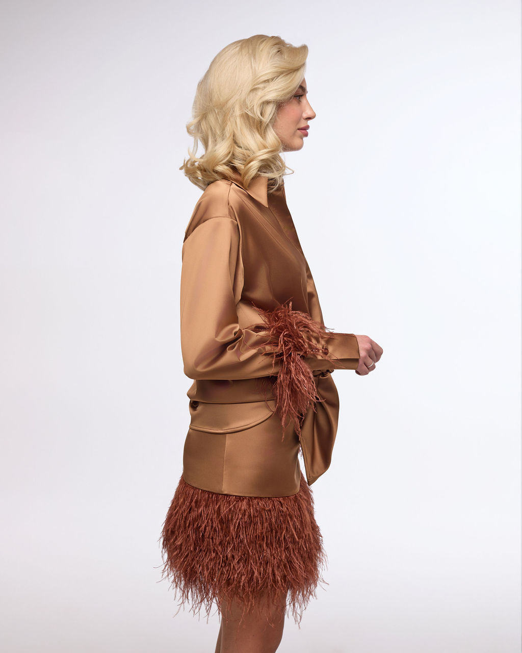 Kamieļkrāsas mini svārki ar greznu dabīgas strausa spalvu apdari apakšmalā, izgatavoti no satīna ar zīdainu spīdumu, kas praktiski nerada nobrāzumus. Šie svārki ir ideāla izvēle gan ikdienas valkāšanai, gan svētku tērpiem. Kombinējiet tos ar topu vai blūzi no mūsu kolekcijas, lai radītu elegantu un sievišķīgu siluetu.