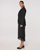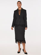 Šie vilnas zīmuļsvārki ar taisnu piegriezumu, midi garumu un augsto jostasvietu izstaro eleganci un pārliecību. Diskrēts rāvējslēdzējs un smalka mežģīņu apdare apakšmalā piešķir negaidītu un izsmalcinātu akcentu, kas piesaista uzmanību un rada smalki noslēpumainu šarmu. Šie svārki ir lieliska izvēle, lai izceltu savu eleganto stilu ar maigu, romantisku pieskārienu.