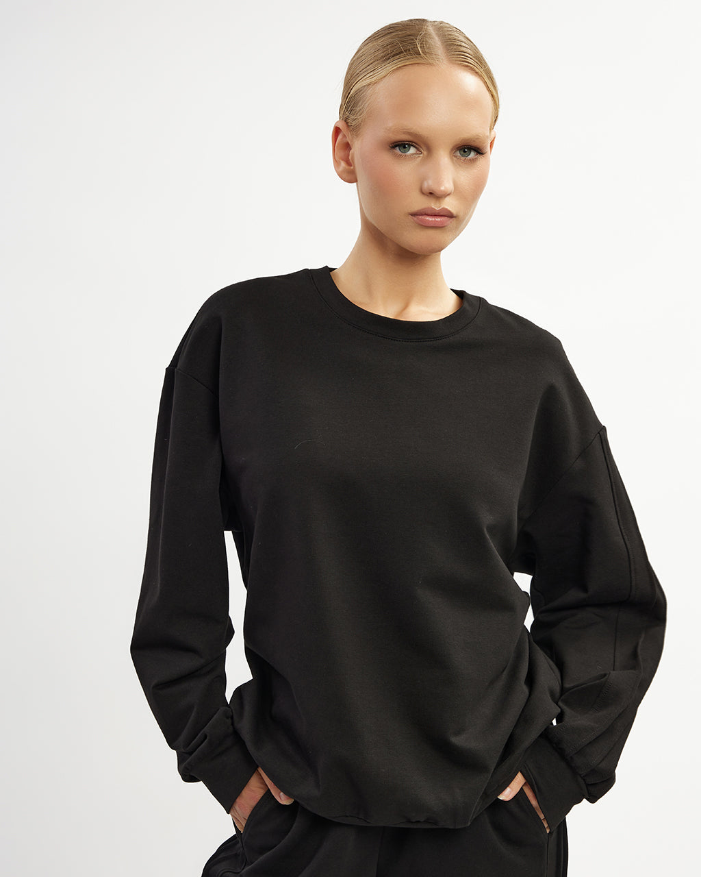 Melns kokvilnas džemperis. Šis džemperis ar apaļu kakla izgriezumu un garām piedurknēm ir darināts no mīksta, blīva trikotāžas auduma, apvieno komfortu un nepiespiestu ikdienas eleganci. Tas ir pasakaini maigs un lieliski pieguļ jebkurai figūrai. Ideāls garderobes pamata elements, kas ļauj justies sievišķīgi un komfortabli. Lieliski sader ar džinsiem un mūsu kolekcijas brīvā stila biksēm, radot modernu un neatkārtojamu ikdienas tēlu.