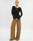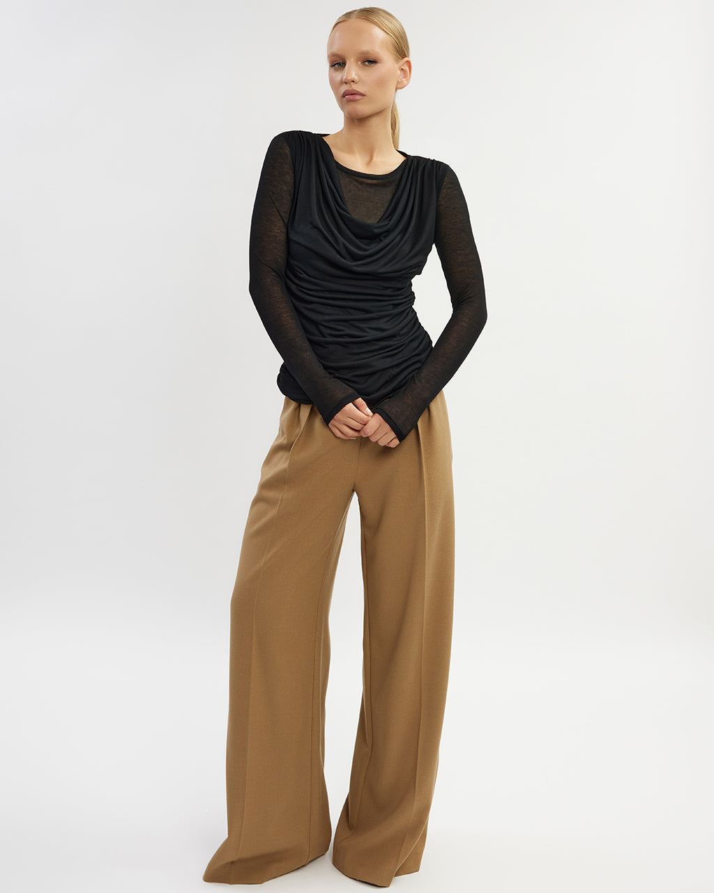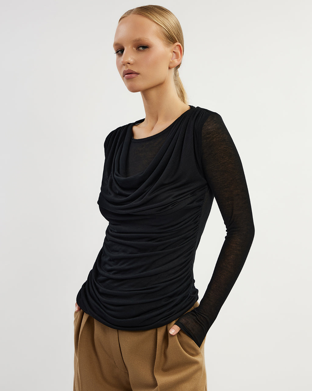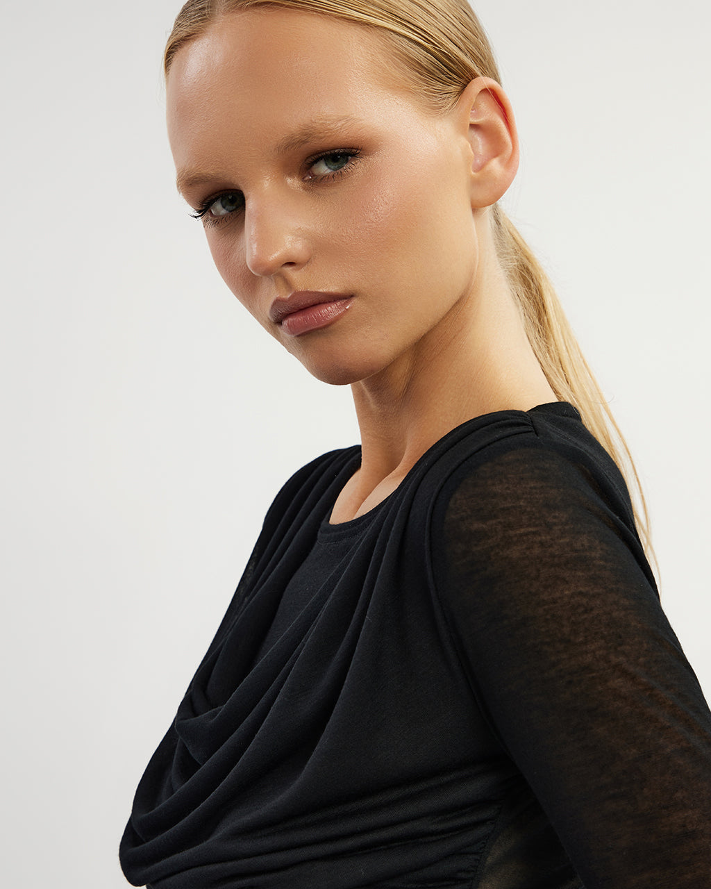 Lakonisks un izsmalcināts – šis melnais tops ar akcentētu drapējumu krūšu zonā kļūs par izteiksmīgu pamata garderobes elementu. Tas ir izgatavots no mīkstas, augstas kvalitātes trikotāžas, kas nodrošina komfortu un ideāli pieguļ figūrai.
