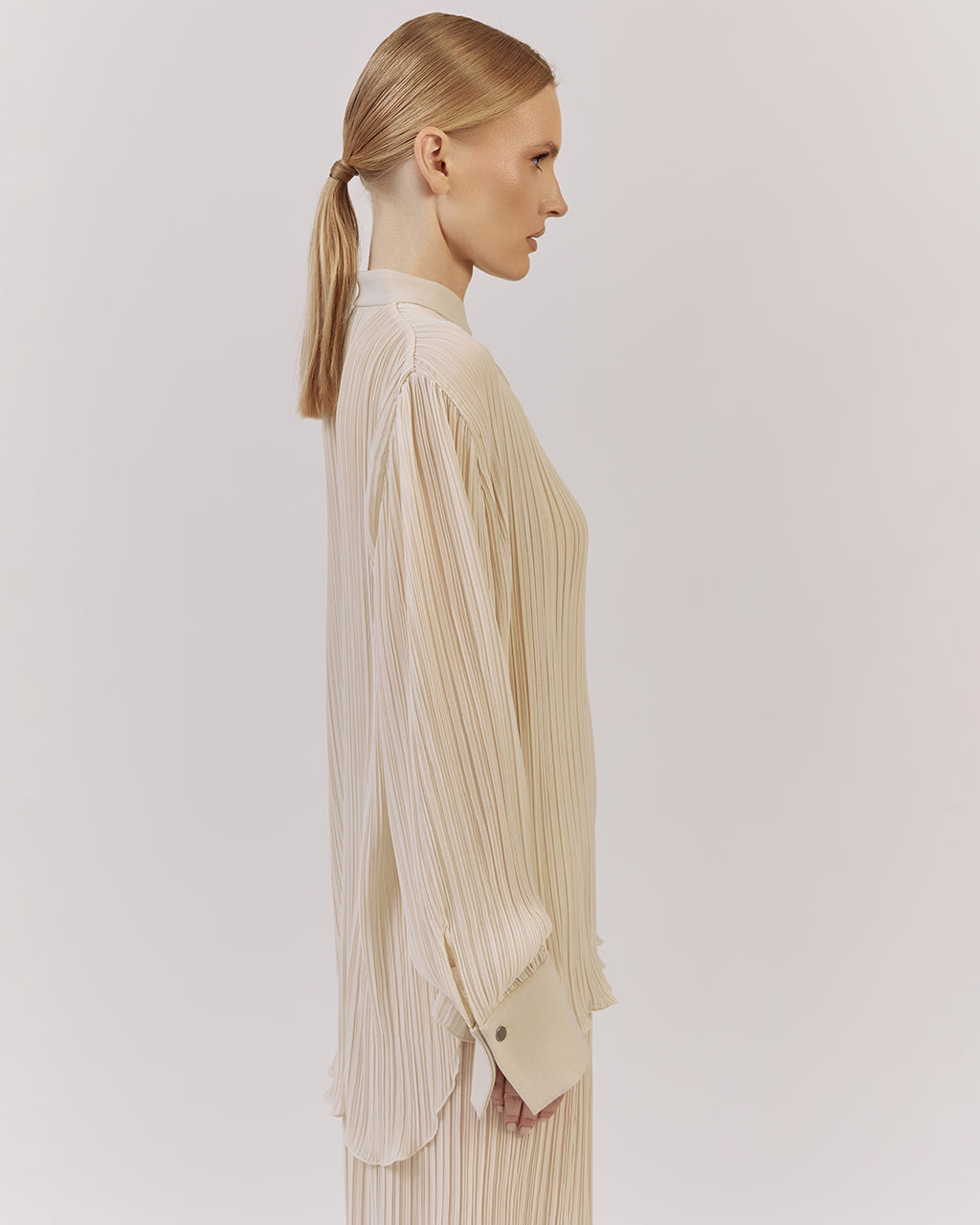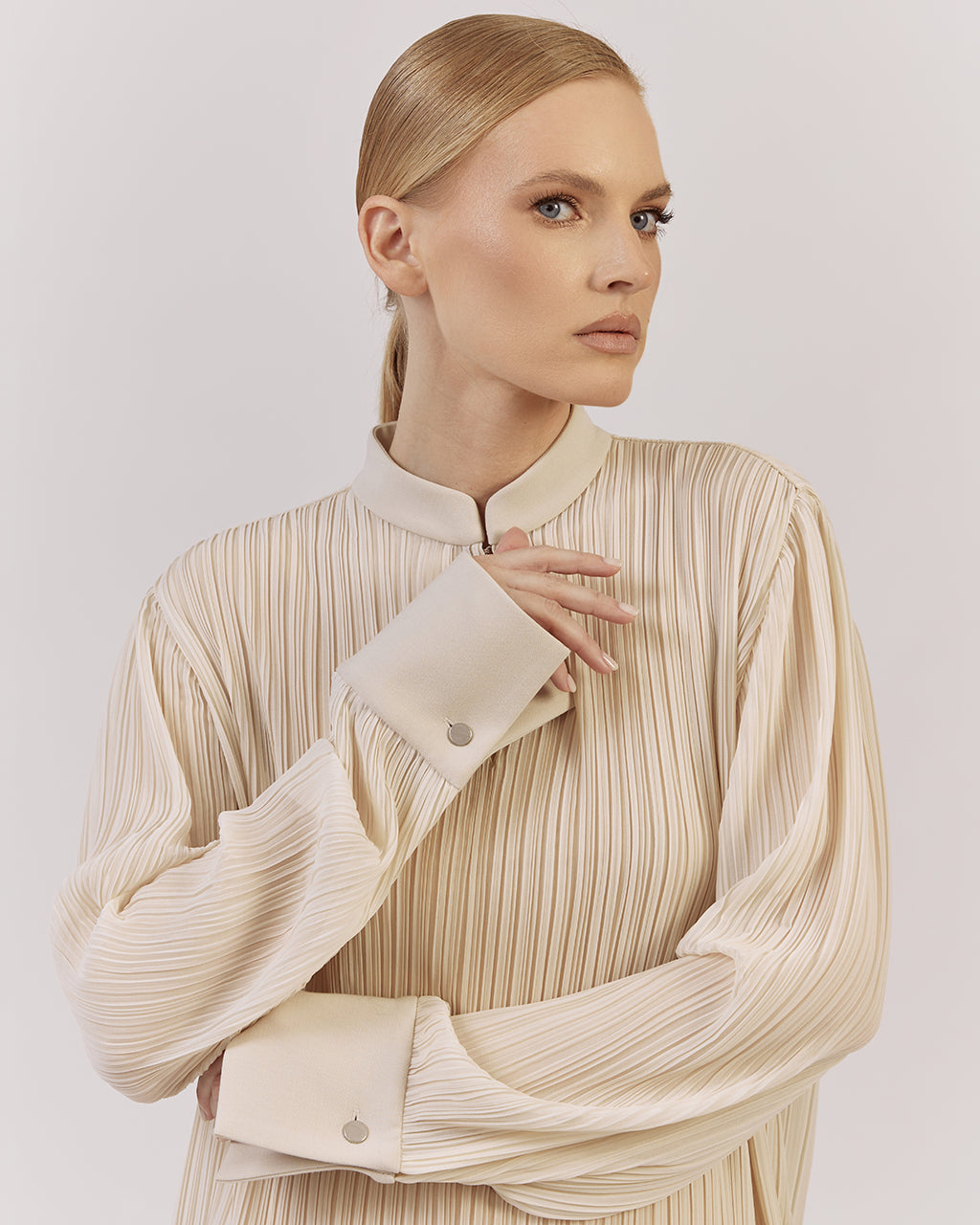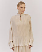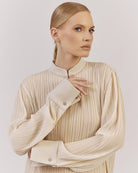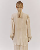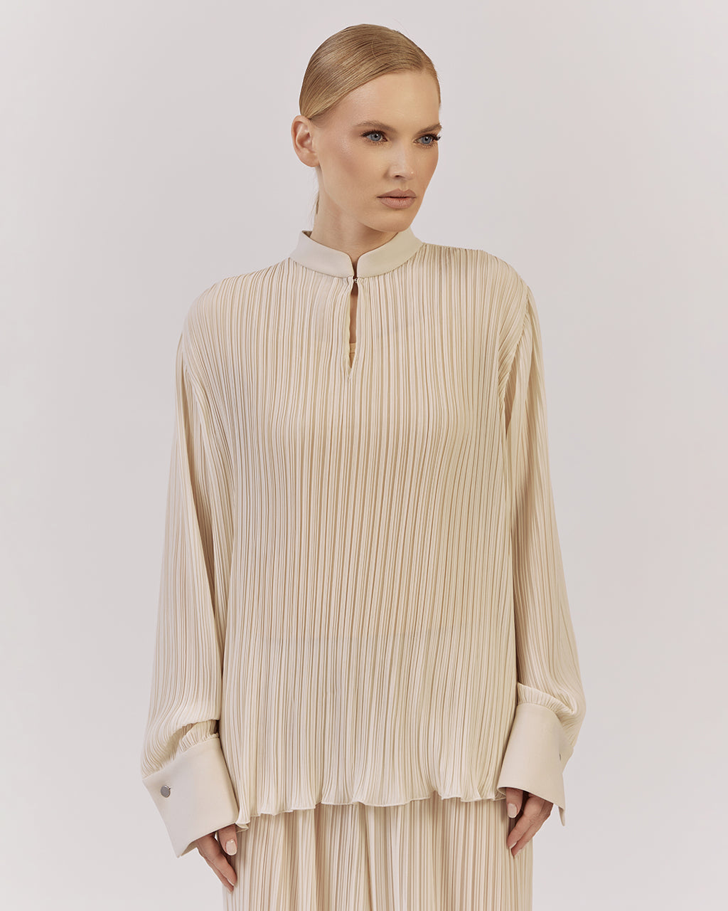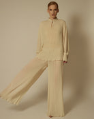 Brīva piegriezuma blūze ar elegantu stāvapkakli, kombinācijā ar platām biksēm no tā paša kolekcijas plisētā auduma – lieliska izvēle Jūsu garderobes papildināšanai. Piedurknēm apakšdaļā ir plata manšete, kas piešķir izsmalcinātību. Komplektā izmantots viegls un daļēji caurspīdīgs plisēts audums.