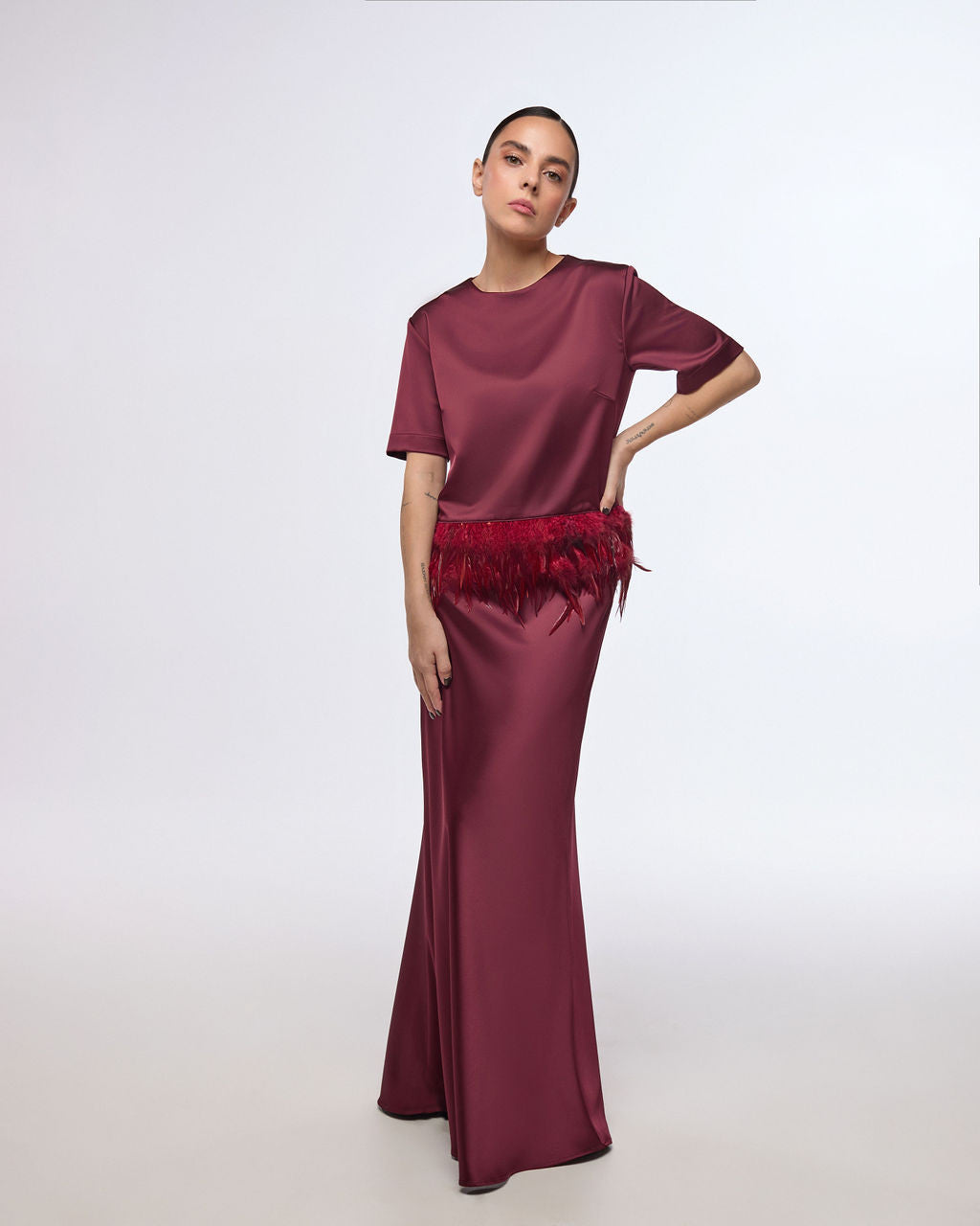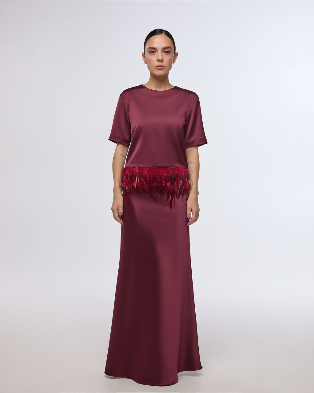 Bordo krāsas satīna ballīšu topiņš ar spalvu apdari | AKIYA