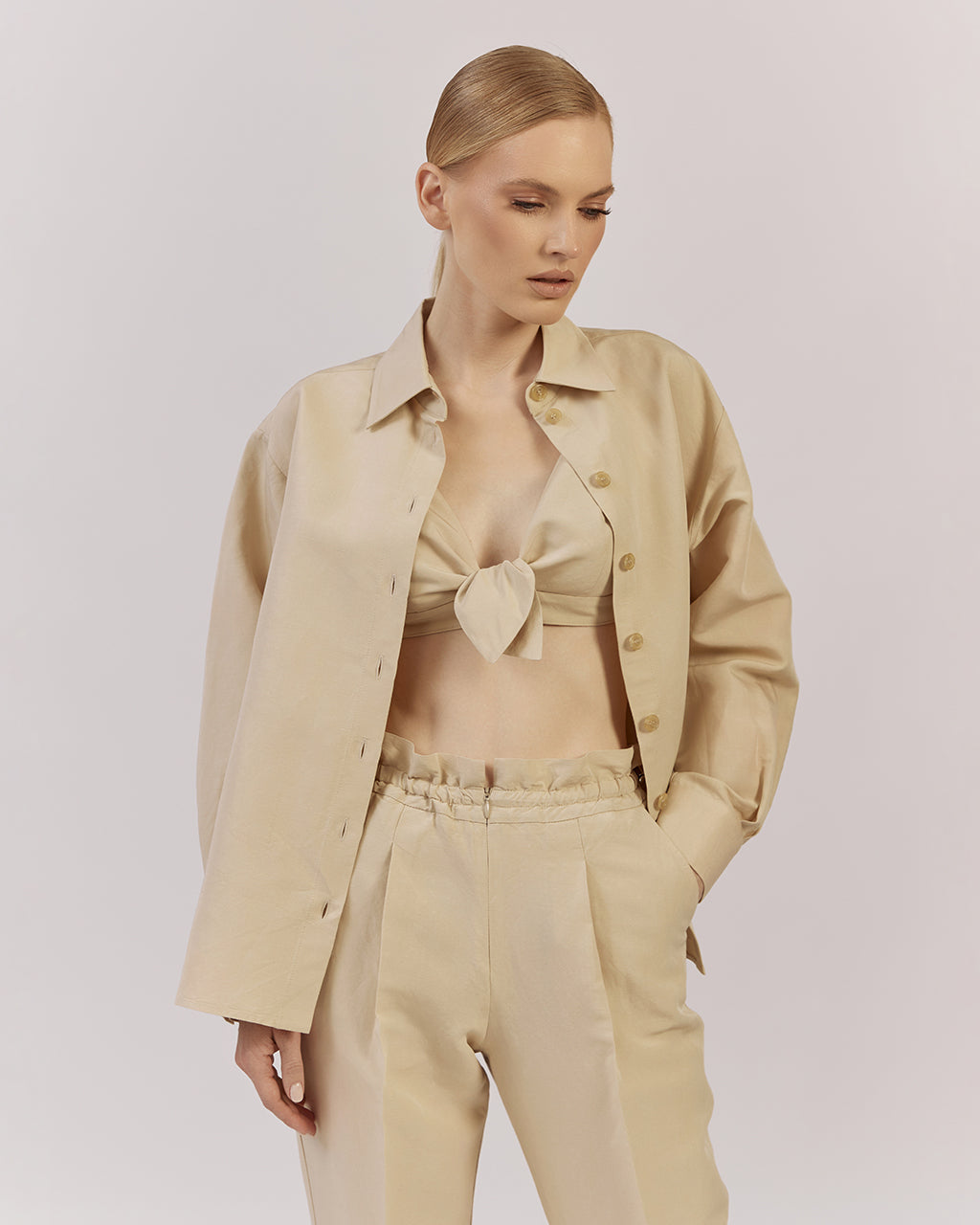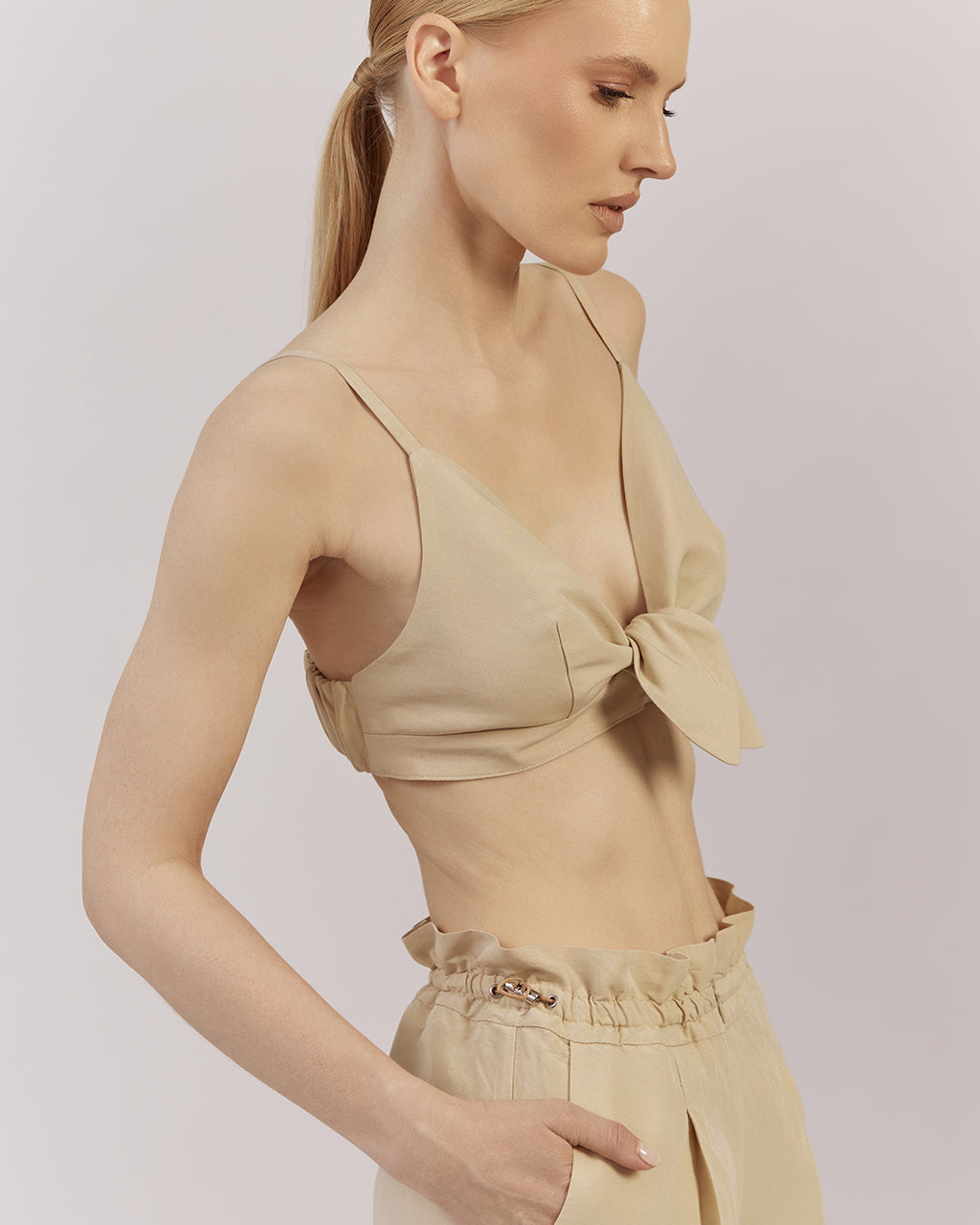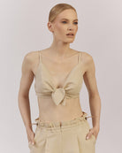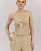 Mūsu vasaras iecienītākais bestsellers – tops ar sasienamu mezglu un regulējamām lencītēm. Izgatavots no lina un viskozes maisījuma auduma, kas piešķir viegluma un gaisīguma sajūtu.Tops ir lieliski piemērots ne tikai pludmales brīvdienām, bet arī pilsētas pastaigām un vakara tikšanās reizēm.