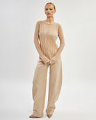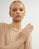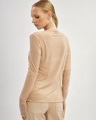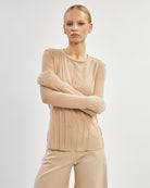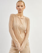 Perfekts stila un komforta apvienojums. Tops izgatavots no puscaurspīdīga auduma ar elastānu, kas nodrošina papildu ērtumu un valkāšanas brīvību. Tā neuzkrītošais dizains viegli iederas vairākslāņu apģērba kārtās - no formāla līdz vakara estētikai. Labi piestāvēs atbilstošām biksēm vai svārkiem no kapsulas kolekcijas.