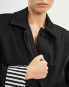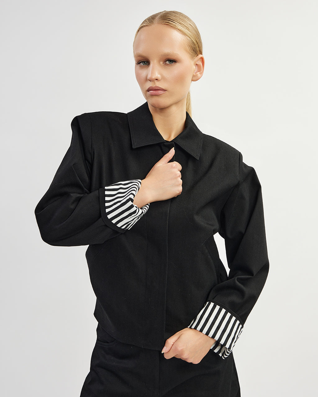 Melna  bomberjaka. Lakonisks, brīva piegriezuma modelis no bieza kokvilnas auduma ar oderi. Jakai ir pārdomāts piegriezums, pogas paslēptas zem atloka un funkcionālas kabatas. Apģērba apakšmala muguras daļā ir savilkta ar gumiju, kas piešķir siluetam apjomu. Mēs iesakām šo bomberjaku kombinēt ar džinsiem vai mūsu kolekcijas biksēm.