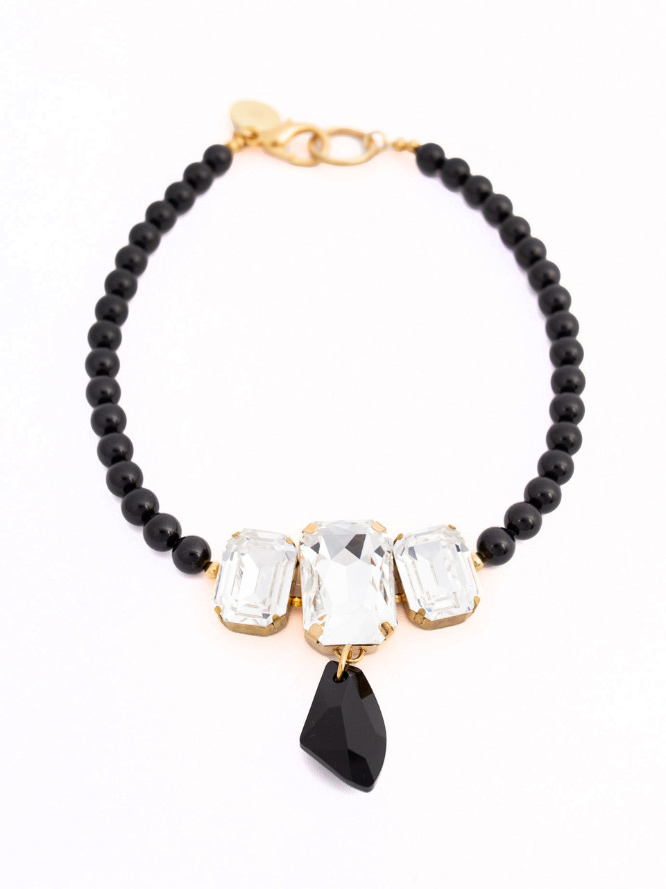 Melnas Swarovski kristāla pērlītes ar Swarovski kristāliem pārmaiņus, caurspīdīgiem un melniem, ar zelta krāsas metāla detaļām un omāra spīles aizdari. Unikāla rotaslieta, ko roku darbs izgatavojusi NOLO dizainere Viktorija Joniene. Sastāvs: Swarovski kristāla stikla pērlītes, Swarovski kristāli metāla pamatnē, metāla detaļas.