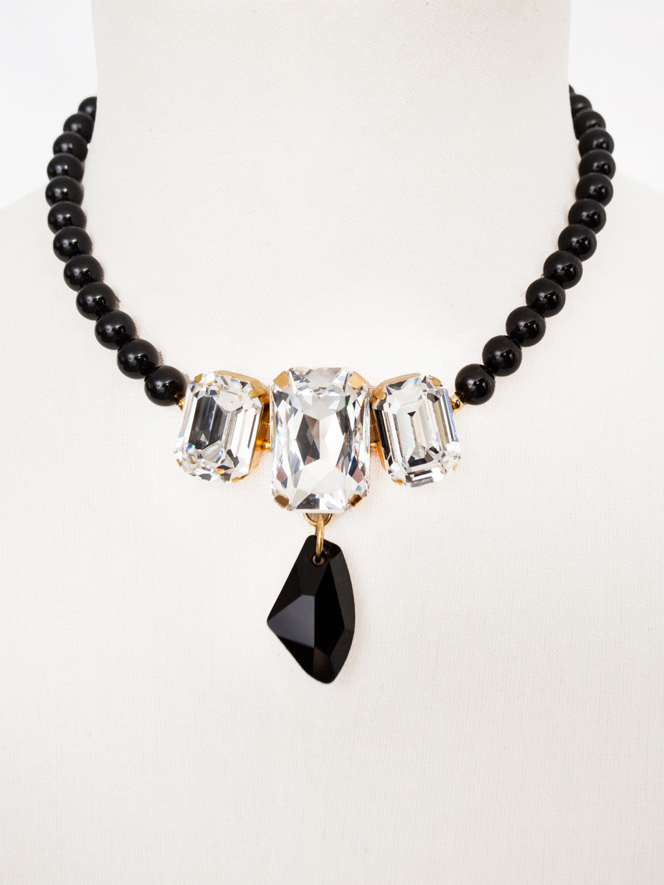 Melna Swarovski stikla pērlīšu kaklarota ar skaidru un melnu kristāla kulonu