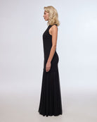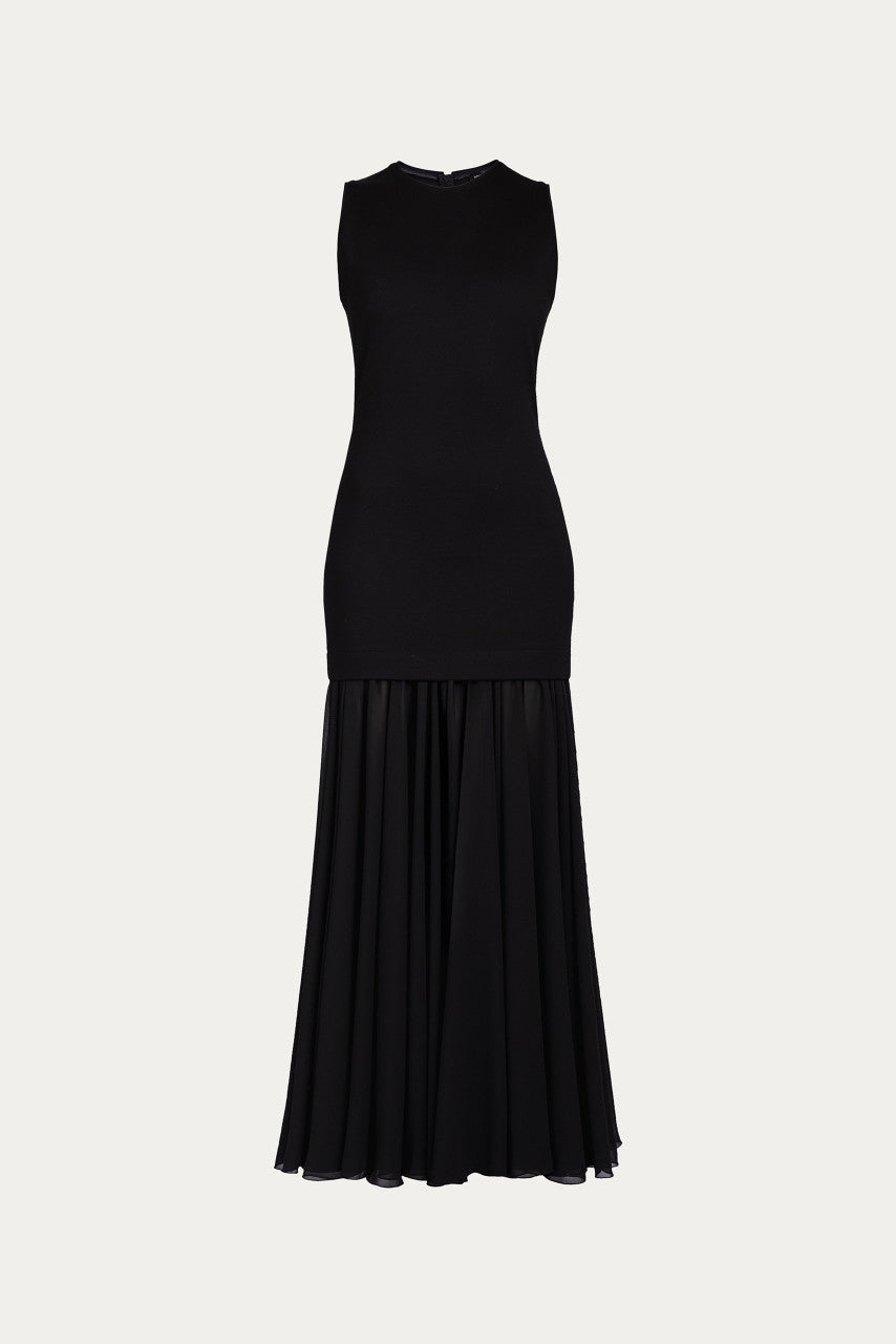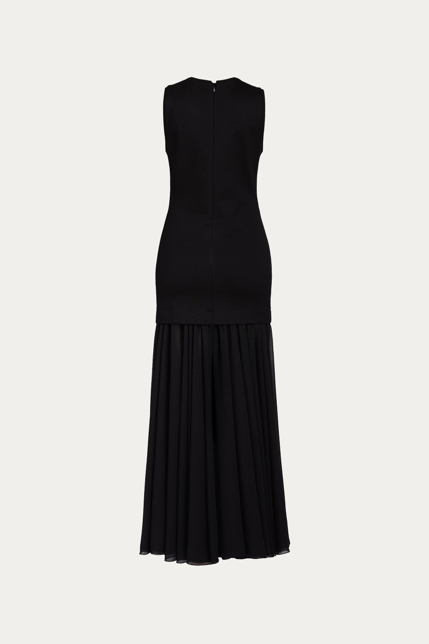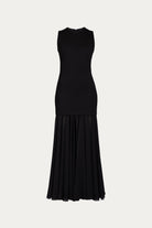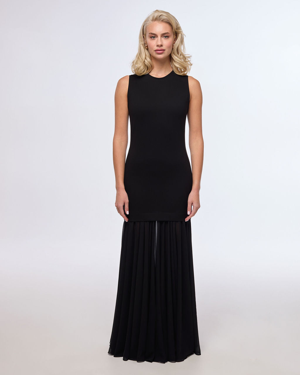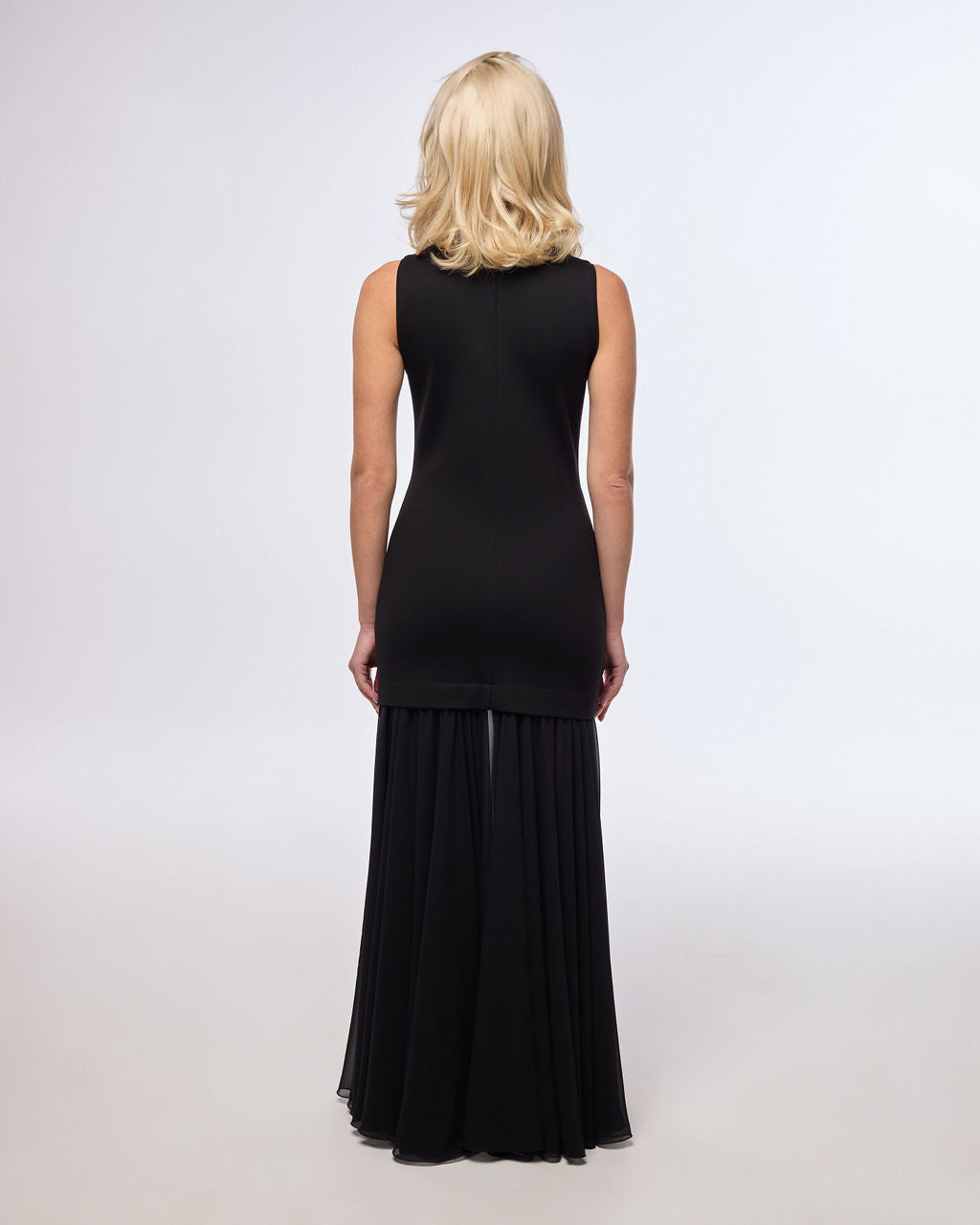 Gara, melna un eleganta blīva džersija vakarkleita ar šifona svārku daļu | KEMEKO