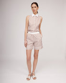 Šie svītrainie kokvilnas šorti ir lielisks papildinājums pludmales un ikdienas apģērbam, radot saskaņotu izskatu ar peldkostīmiem un vasaras topiem. Ērtā, elastīgā jostasvieta un vieglais, patīkamais audums nodrošina kustību brīvību un komfortu karstās dienās. Saskaņojiet tos ar vesti vai kreklu no mūsu kolekcijas, lai radītu vasarīgu ikdienas tērpu, kas piemērots gan atpūtai pie jūras, gan ikdienas aktivitātēm pilsētā.