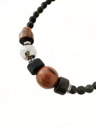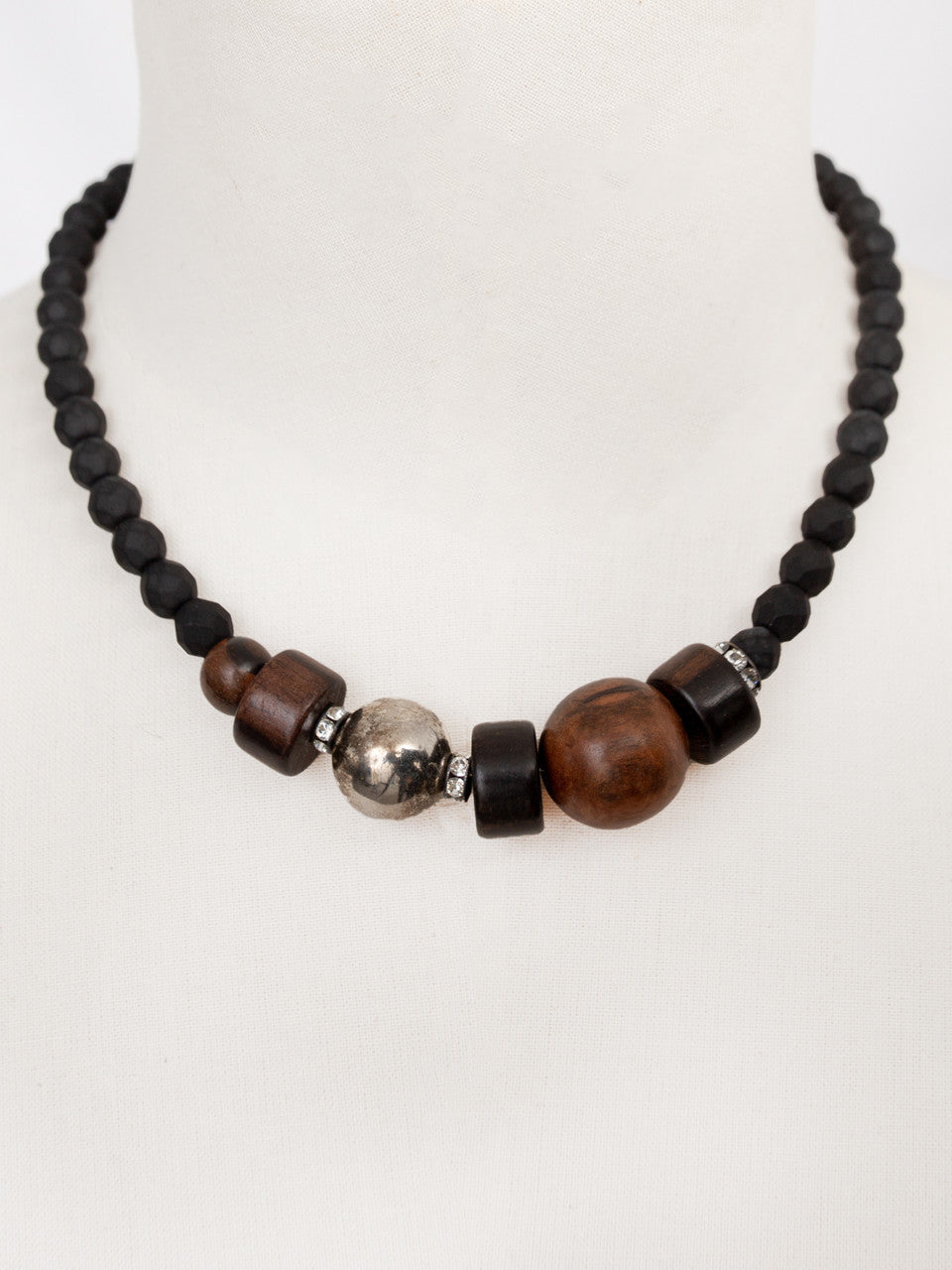 Melnas Čehijas kristāla stikla pērlītes ar Swarovski kristāliem un koka pērlītēm, asimetrisks dizains ar mainīgām pērlītēm dažādos izmēros un omāra spīles aizdari.