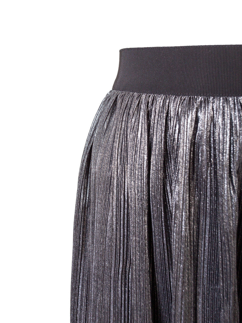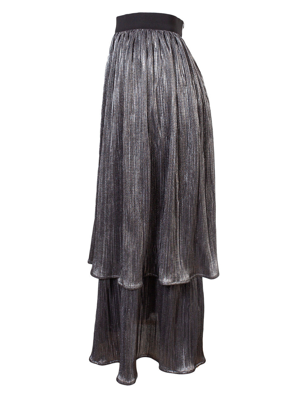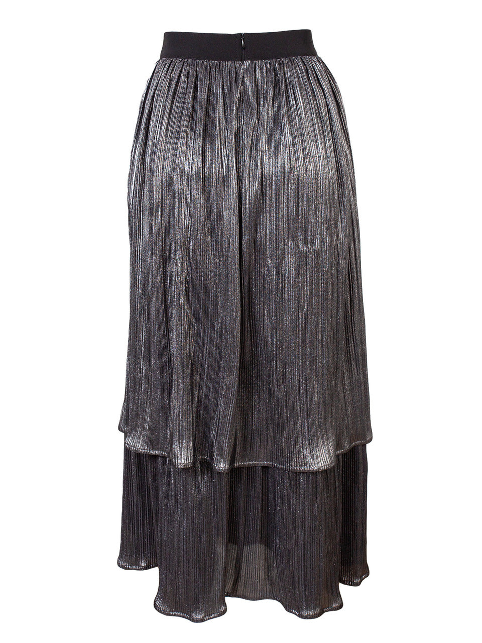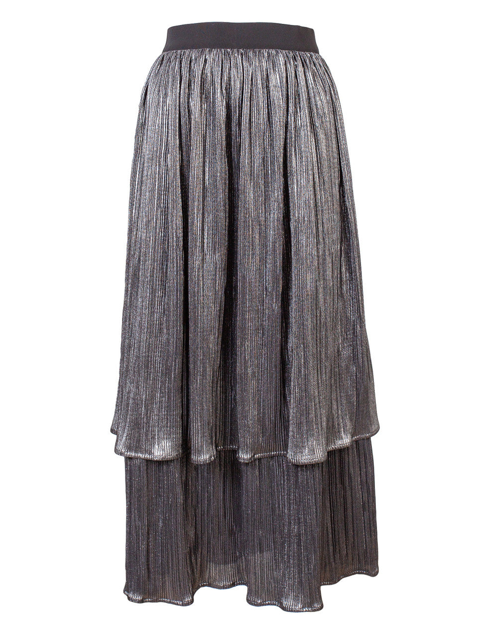 Sudraba krāsas, daudzslāņaina midi garuma svārki ar sudrabainu, pilnībā krokotu, elastīgu jostasvietu, taisnu apakšmalu un vidēji garu piegriezumu.