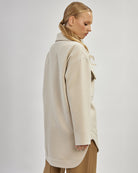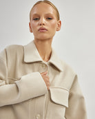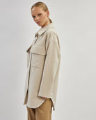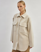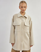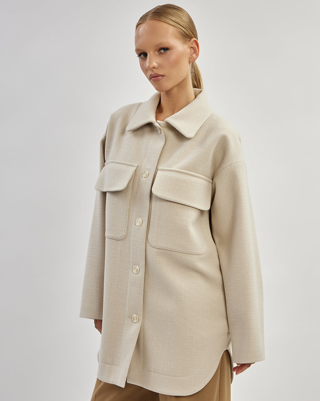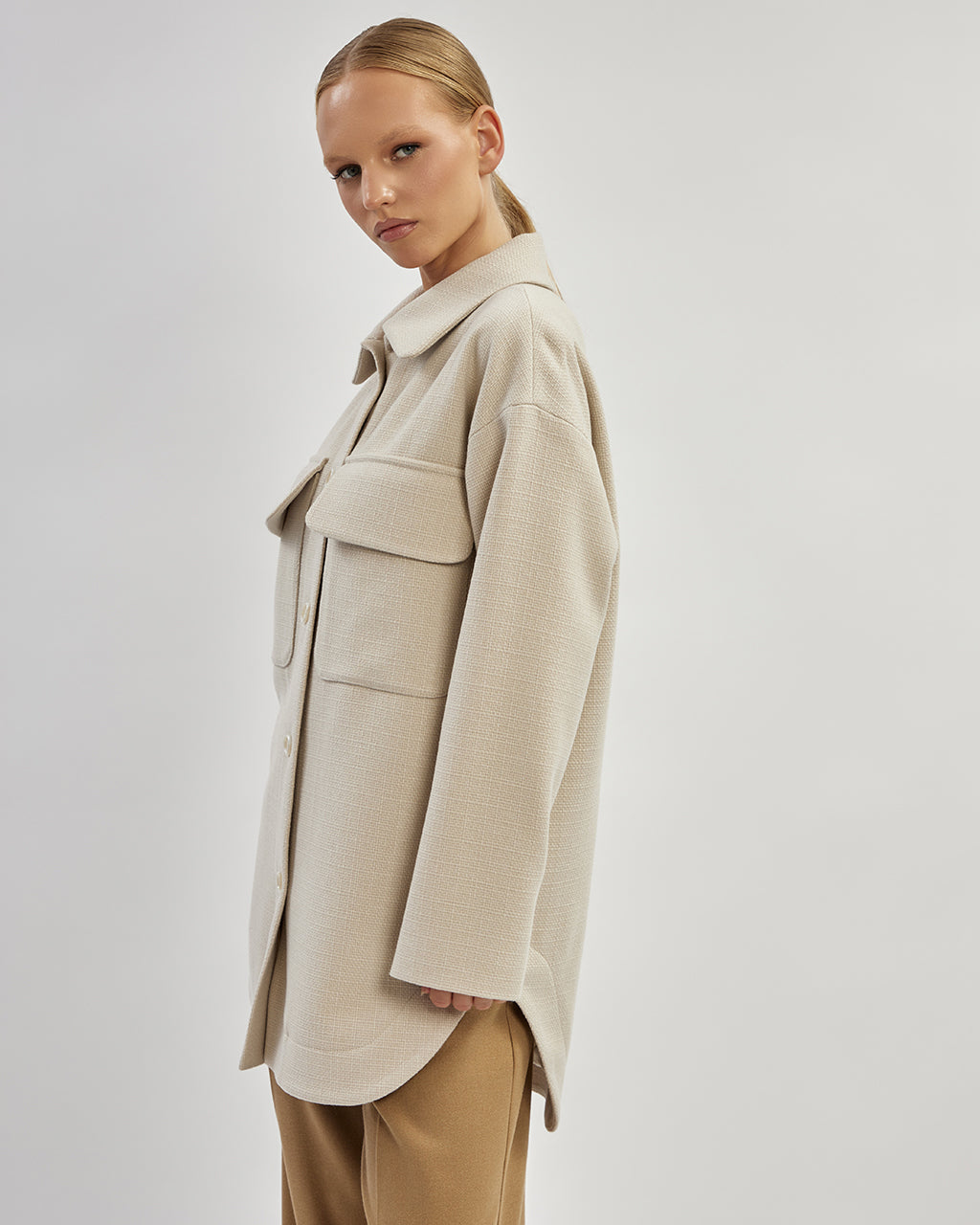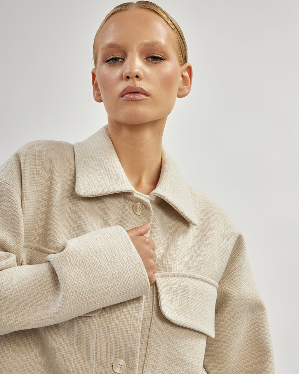 Krekla stila jaka bēšā tonī. Brīva stila jaka ar apkakli, ārējām kabatām un pogu aizdari. Tā darināta no izsmalcināta, fakturēta auduma ar tvīdam raksturīgu tekstūru, papildināta ar vieglu viskozes un acetāta oderi. Šī jaka noteikti kļūs par uzticamu rudens garderobes pamatu. Viegli kombinējama ar džinsiem vai mūsu kolekcijas biksēm.