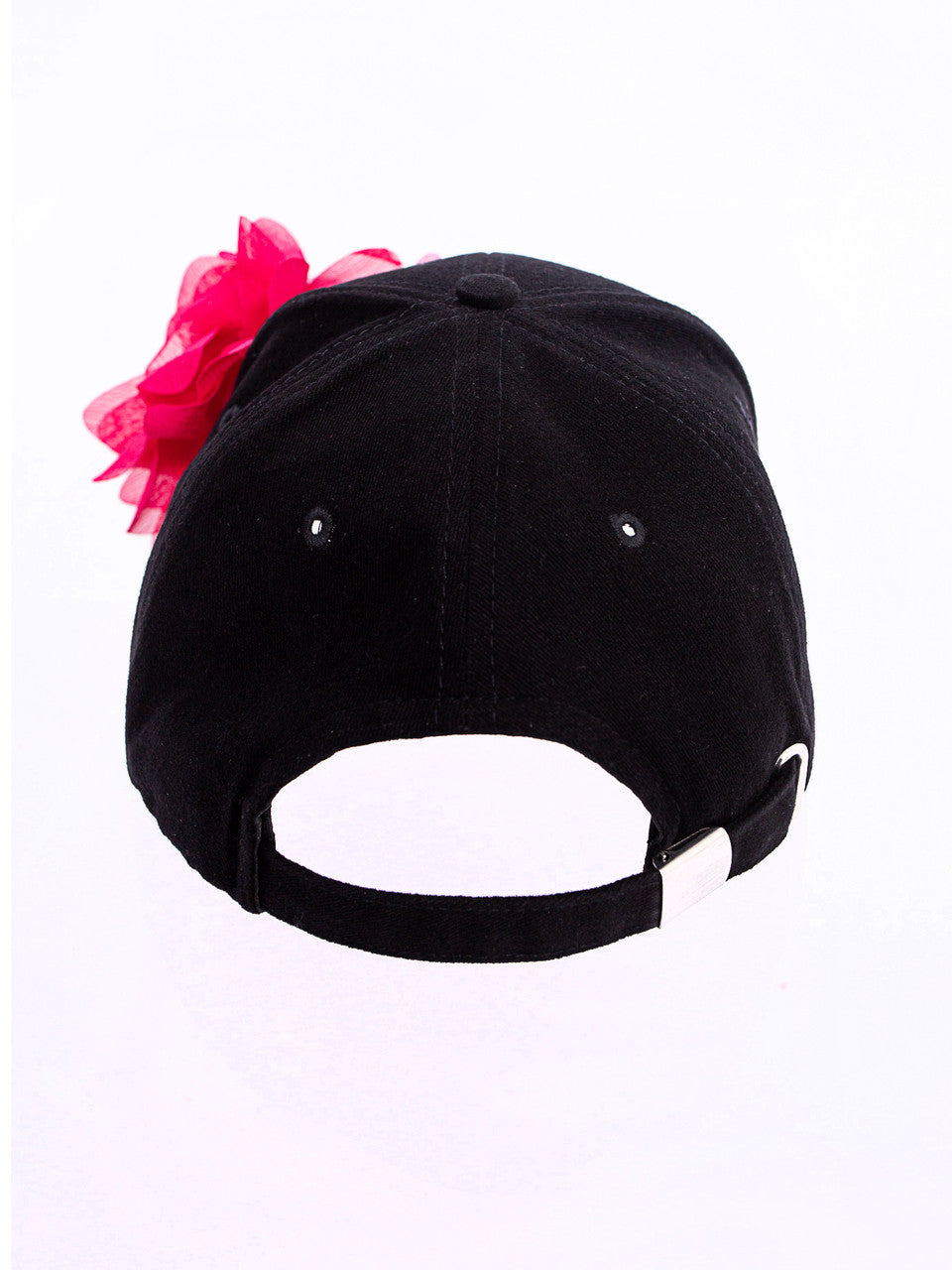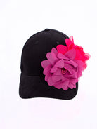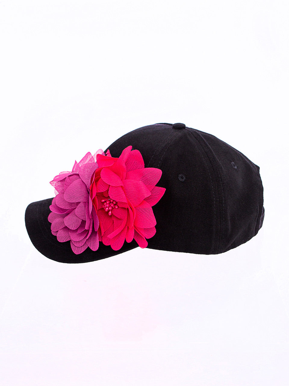This is our black baseball cap with two decorative chiffon flower brooches, a baseball cap made of cotton and a metal adjustable back. One size.