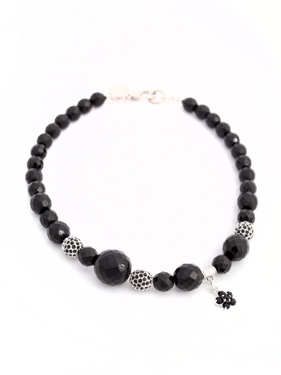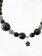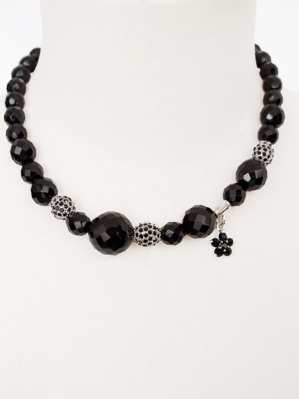 Black Czech crystal glass beads with pavé beads, asymmetrical design with alternating beads in varying sizes small floral pendant and lobster claw fastening.