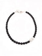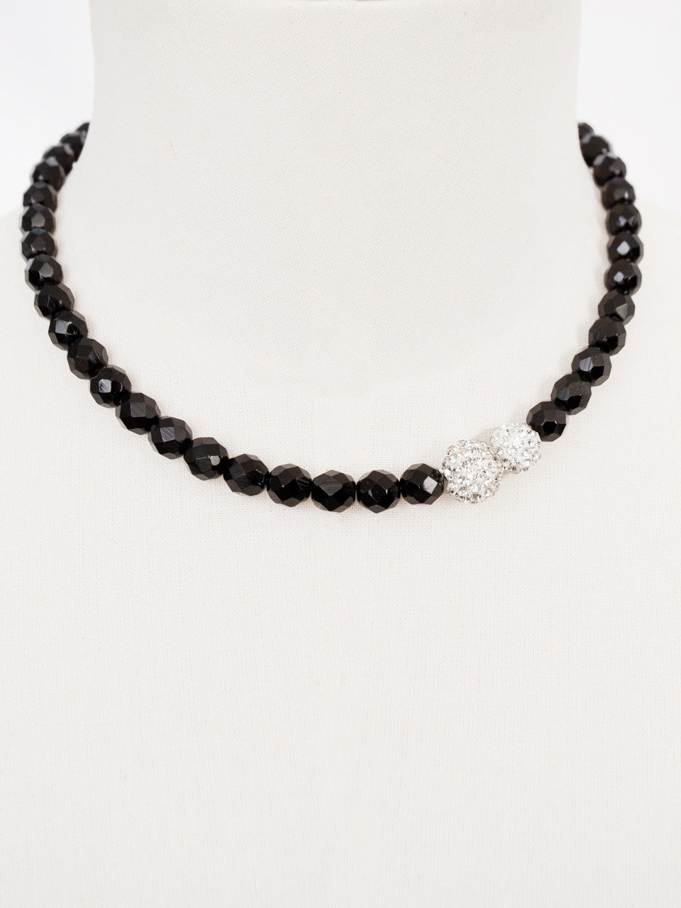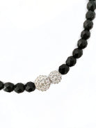 Black Czech crystal glass beads with Swarovski white pavé beads, asymmetrical design with alternating beads in varying sizes and lobster claw fastening. Unique jewellery pieces handmade by NOLO designer Viktorija Joniene. Composition Czech glass beads, Swarovski Pavé ball beads, metal details.