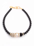 Black Swarovski crystal glass beads with Swarovski stoppers, Pavé ball bead and champagne color crystal beads, asymmetrical design with alternating beads in varying sizes and lobster claw fastening.